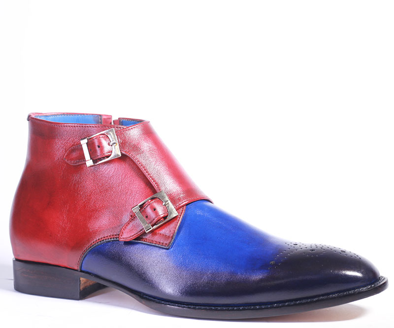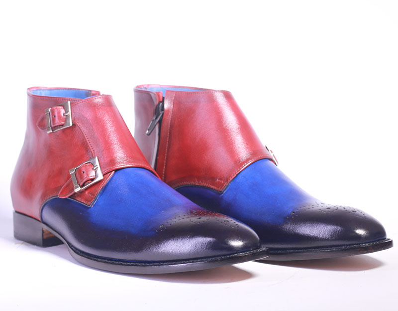Handmade Men's Blue & Red Color Two Tone Leather Double Monk Brogue Toe Ankle Boots