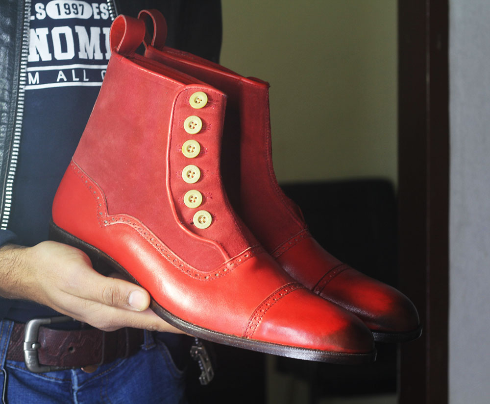 Handmade Men's Burgundy Color Suede & Leather Button Top Cap Toe Ankle High Boots