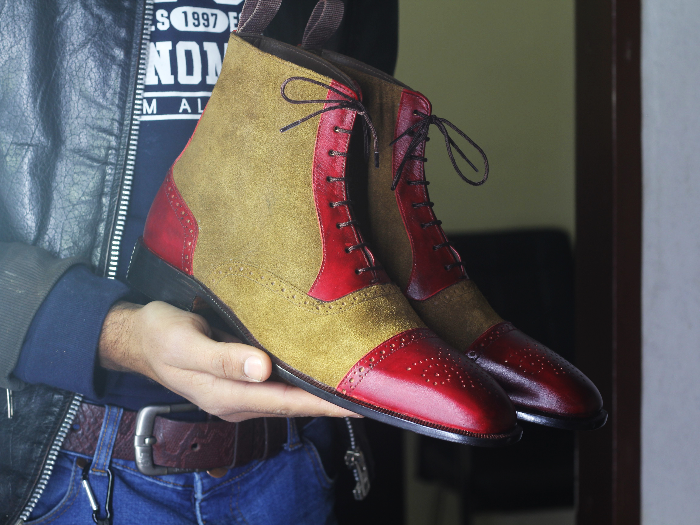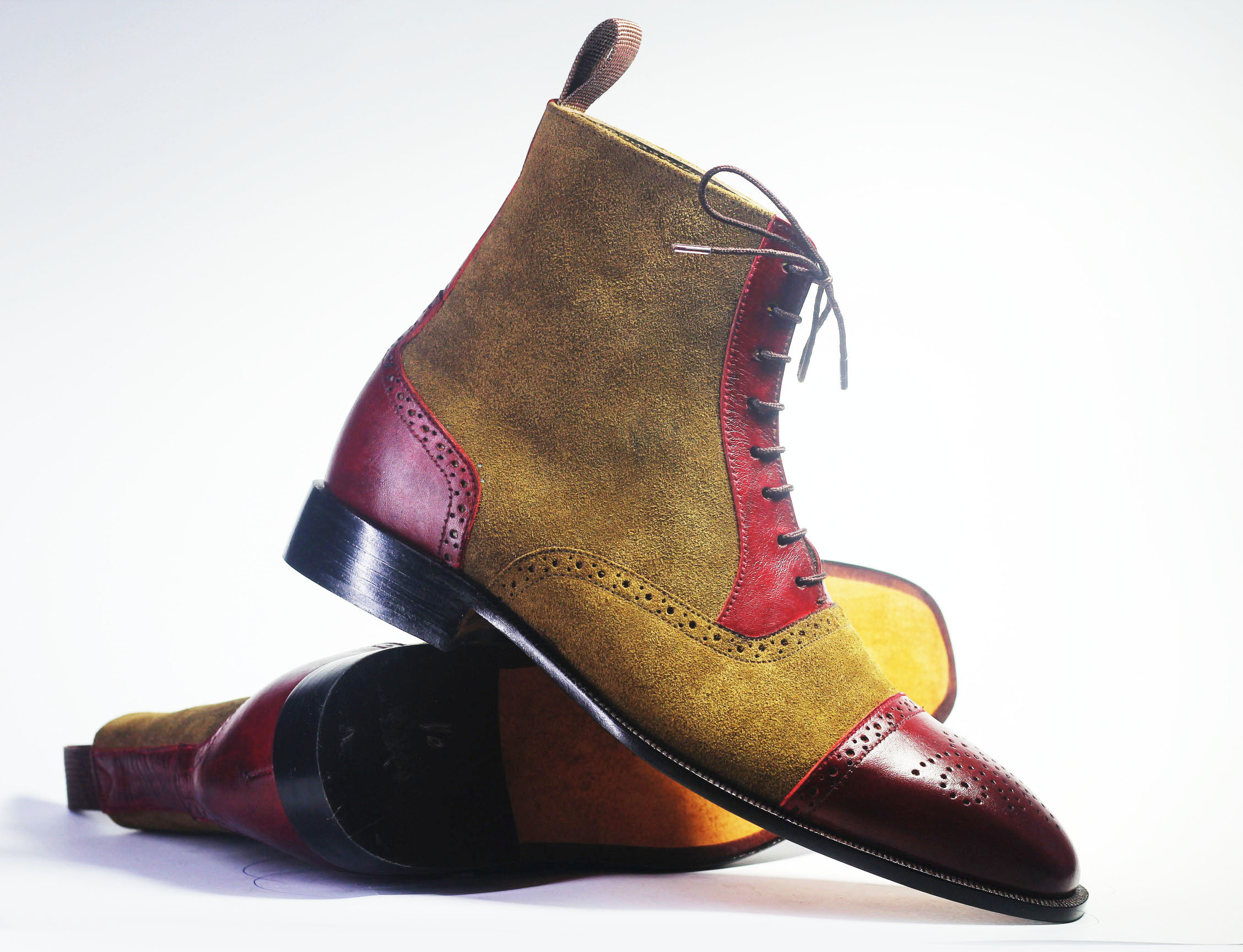 Handmade Men's Burgundy & Brown Color Suede & Leather Cap Toe Brogue Ankle High Lace Up Boots