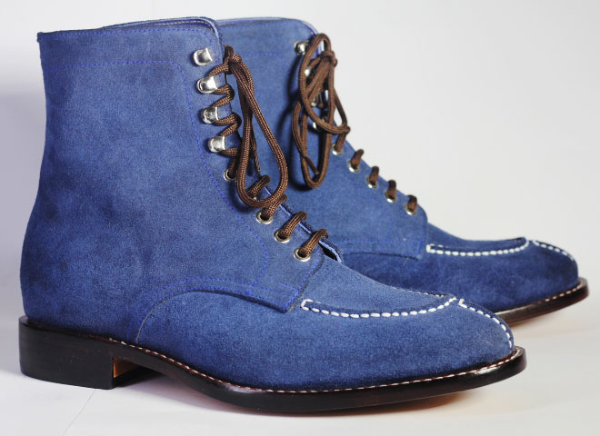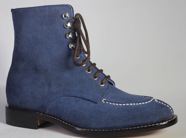 Handmade Men's Blue Color Suede Split Toe Ankle High Dress Lace Up Boots