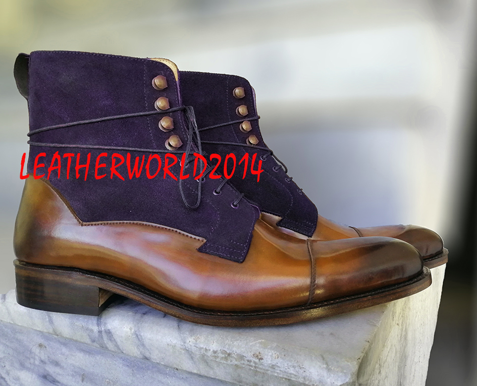 Handmade Men's Brown & Navy Color Cap Toe Leather & Suede Lace Up Boots