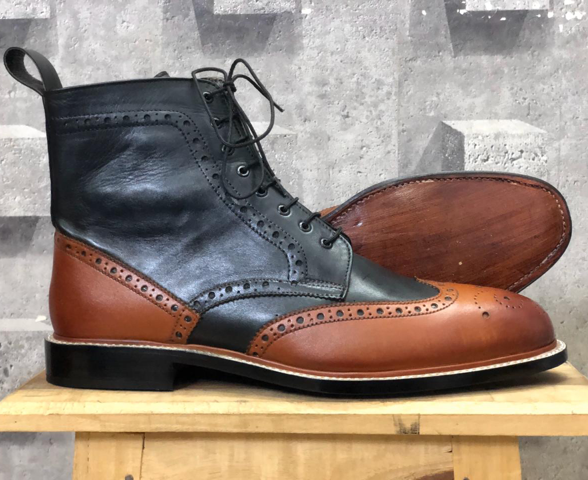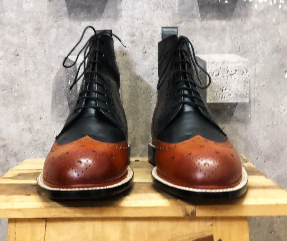 Handmade Men's Brown & Black Color Wing Tip Brogue Leather Lace Up Boots