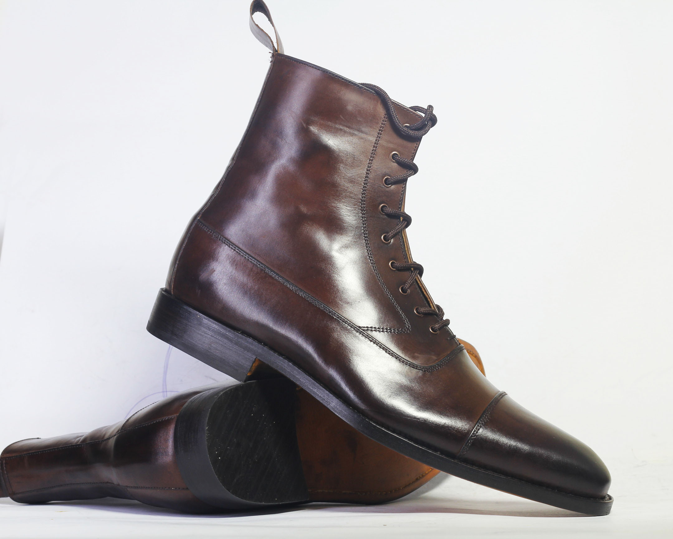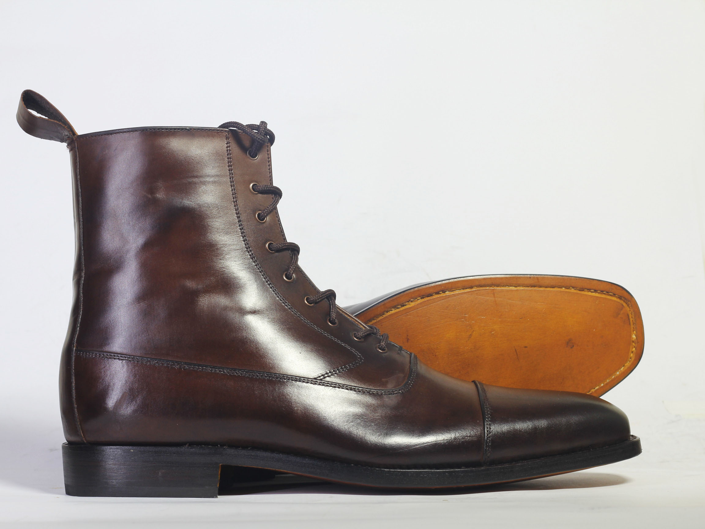 Handmade Men's Chocolate Brown Color Leather Cap Toe Ankle High Lace Up Boots