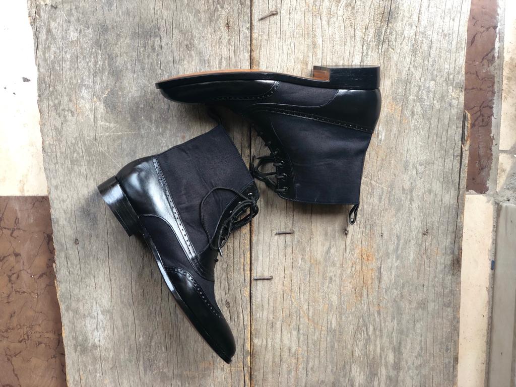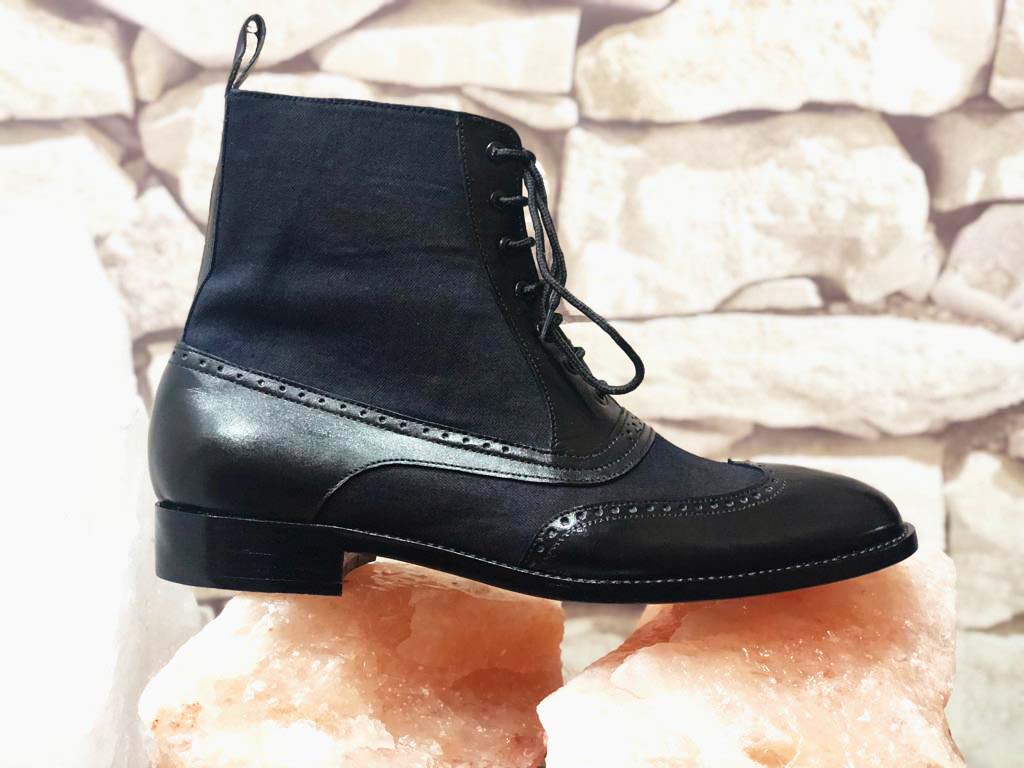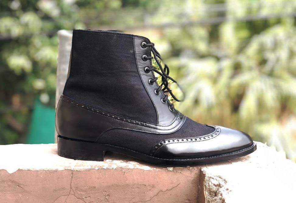 Handmade Men's Black Color Leather & Denim Wing Tip Dress Lace Up Boots