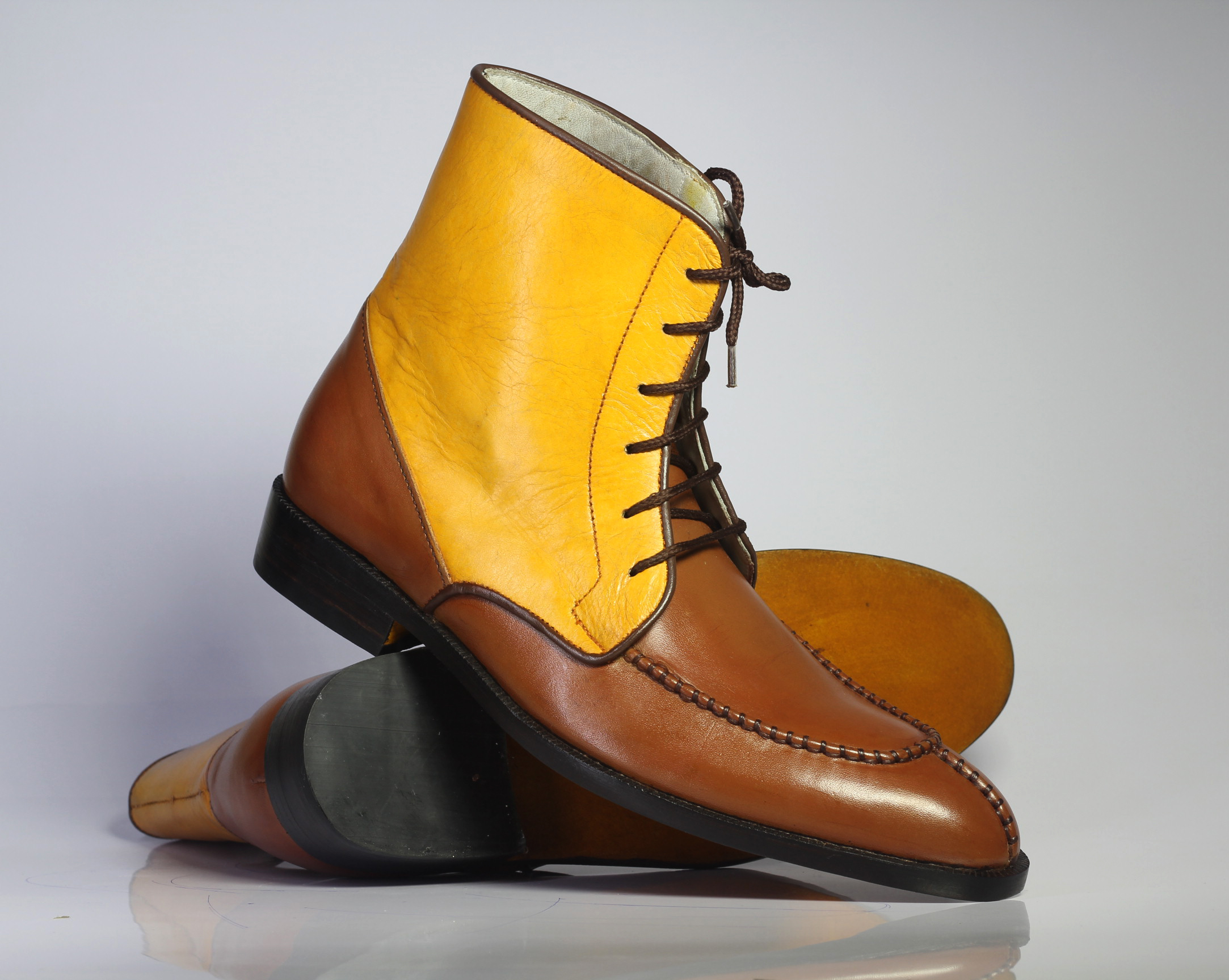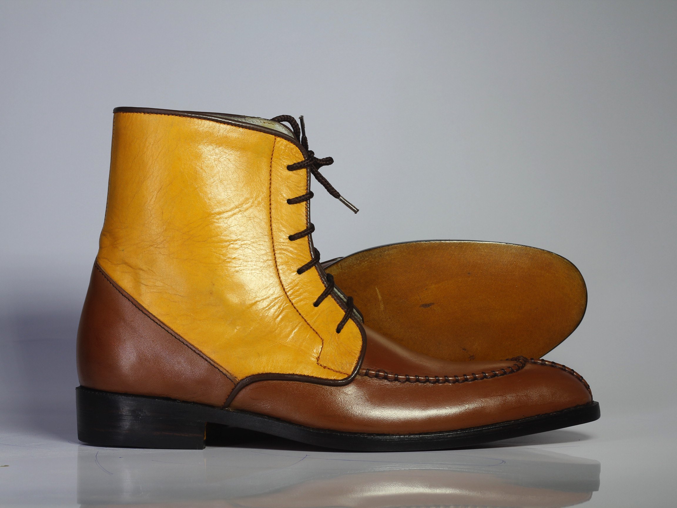 Handmade Men's Ankle high Brown & Yellow Leather Split Toe Lace Up Boots