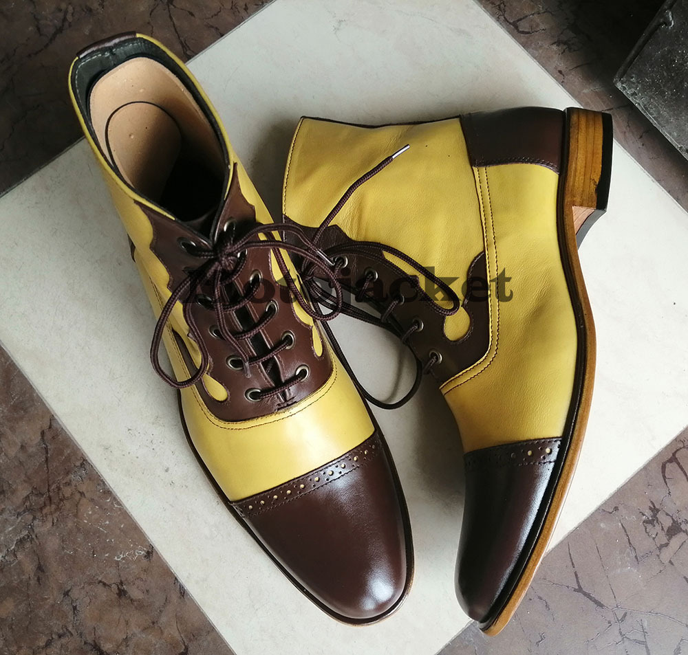 Handmade Men's Ankle high Brown & Yellow Leather Cap Toe Lace Up Boots