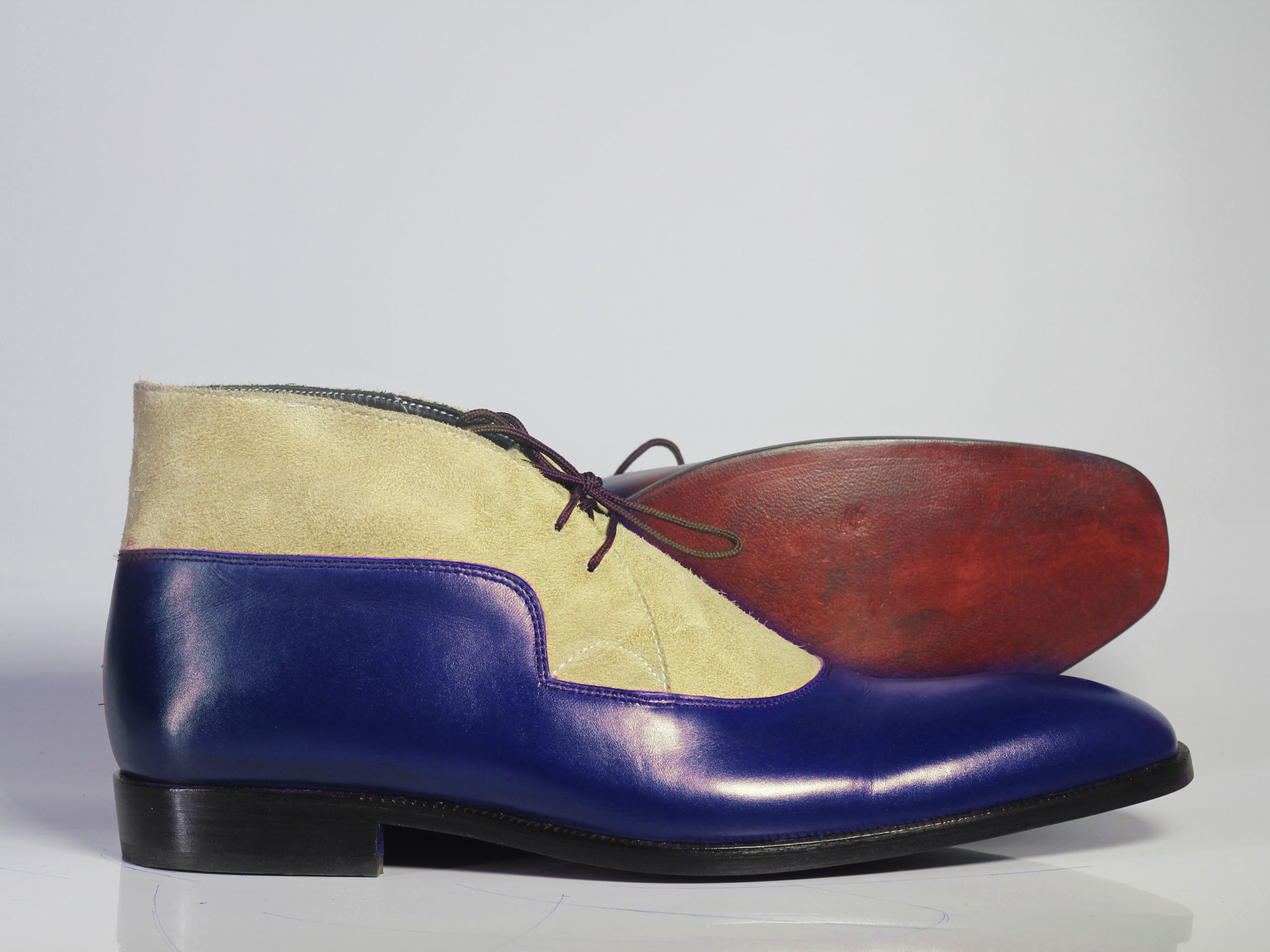 Handmade Blue & Beige Leather Suede Stylish Lace Up Shoes For Men's