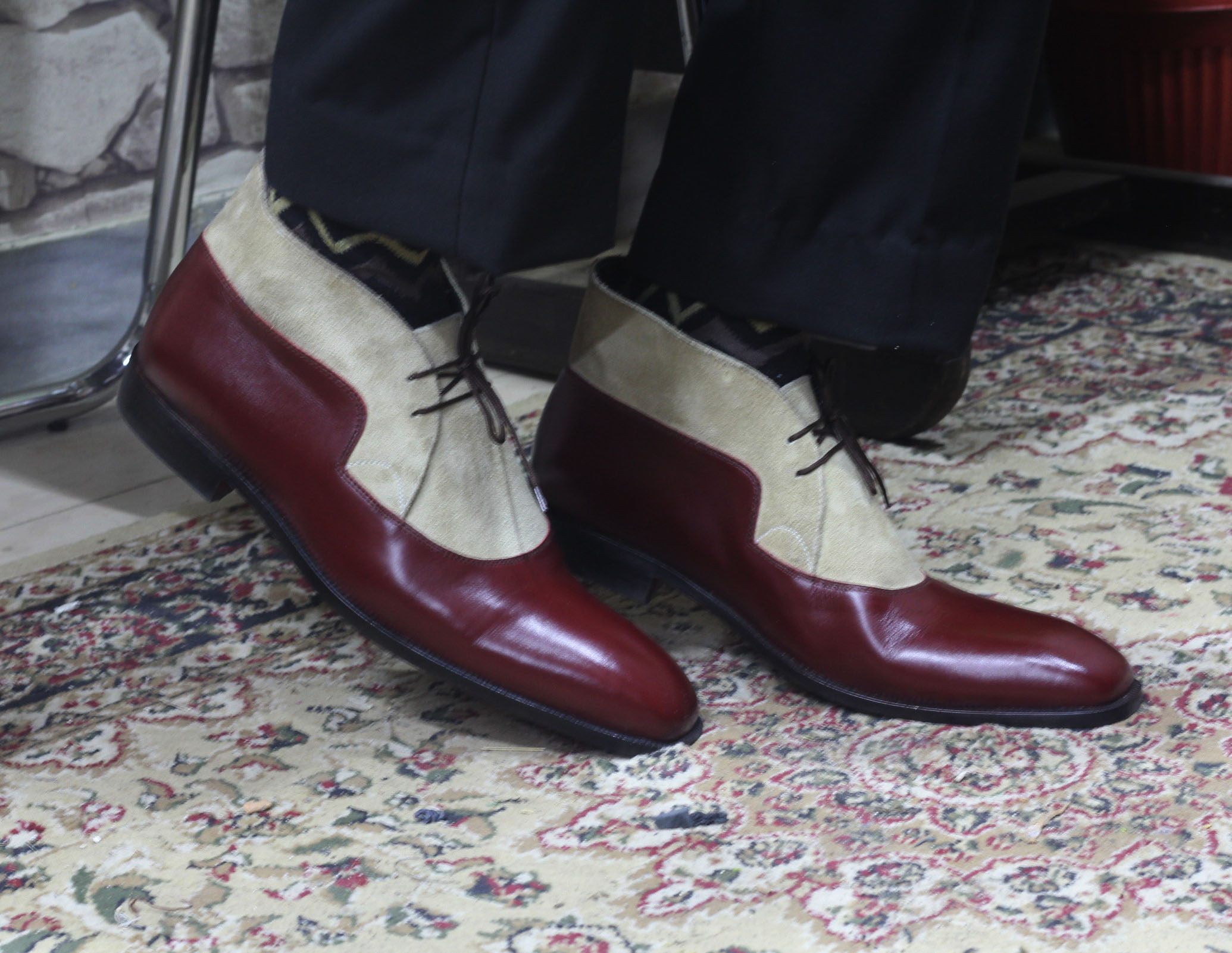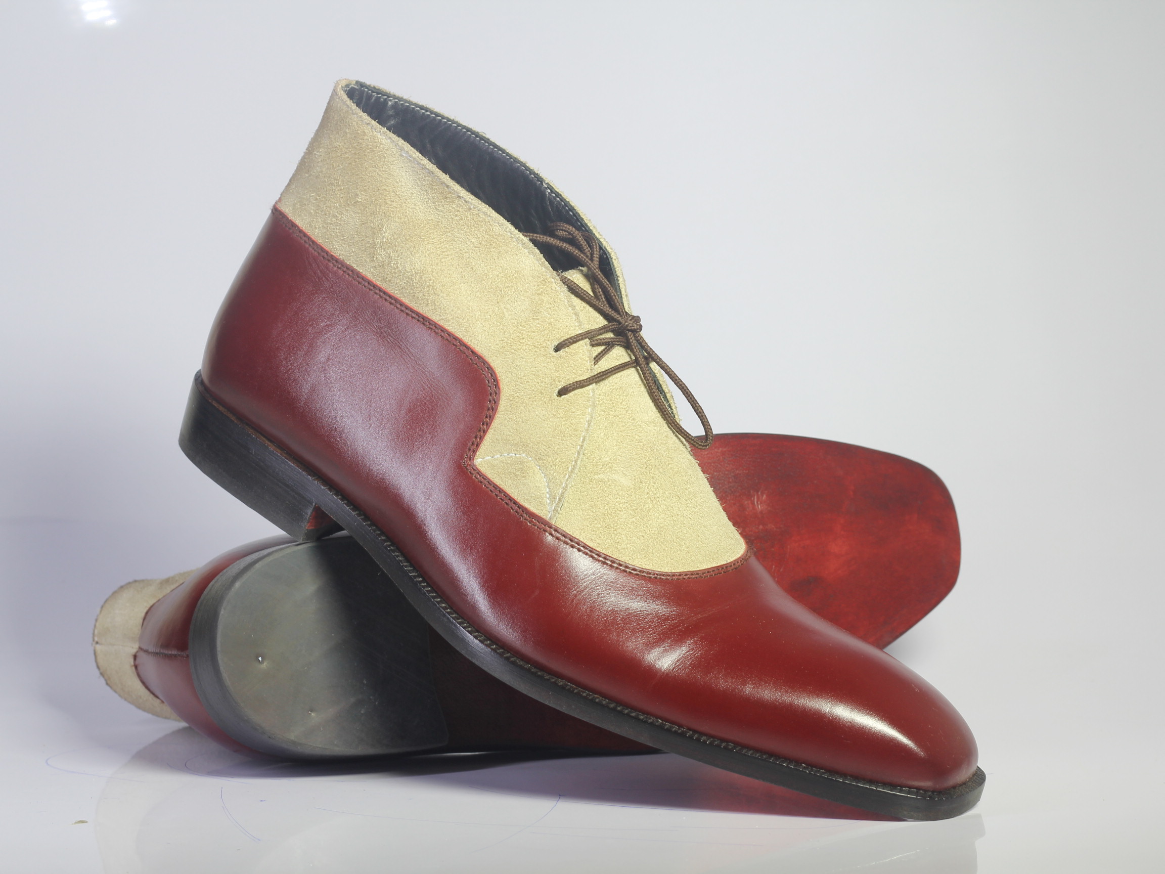 Handmade Burgundy & Beige Leather Suede Stylish Lace Up Shoes For Men's