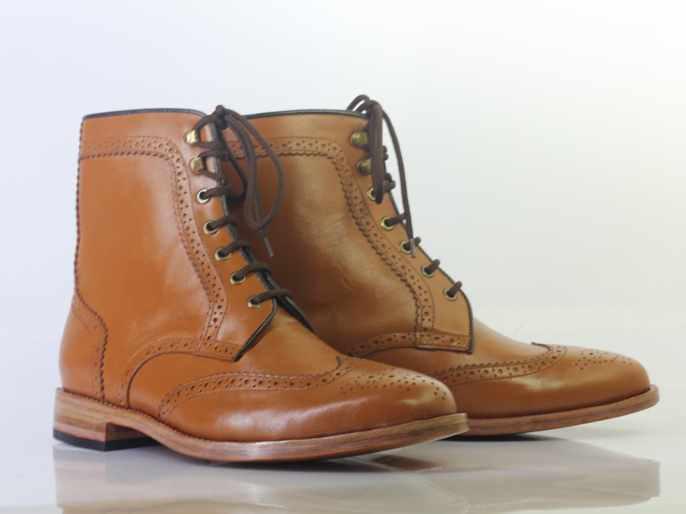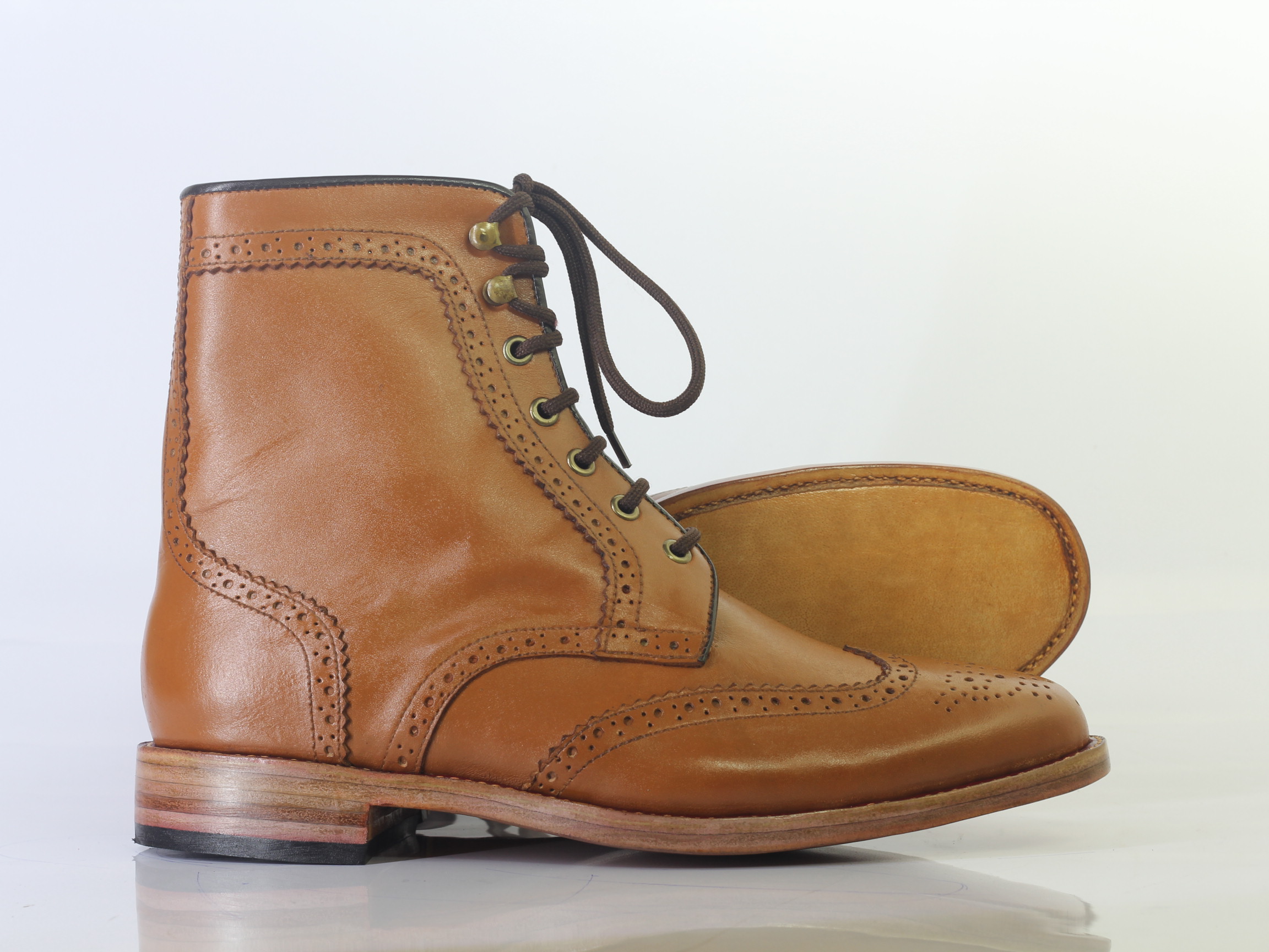 Handmade Men's Tan color Wing Tip Brogue Ankle high Leather Lace Up Boots