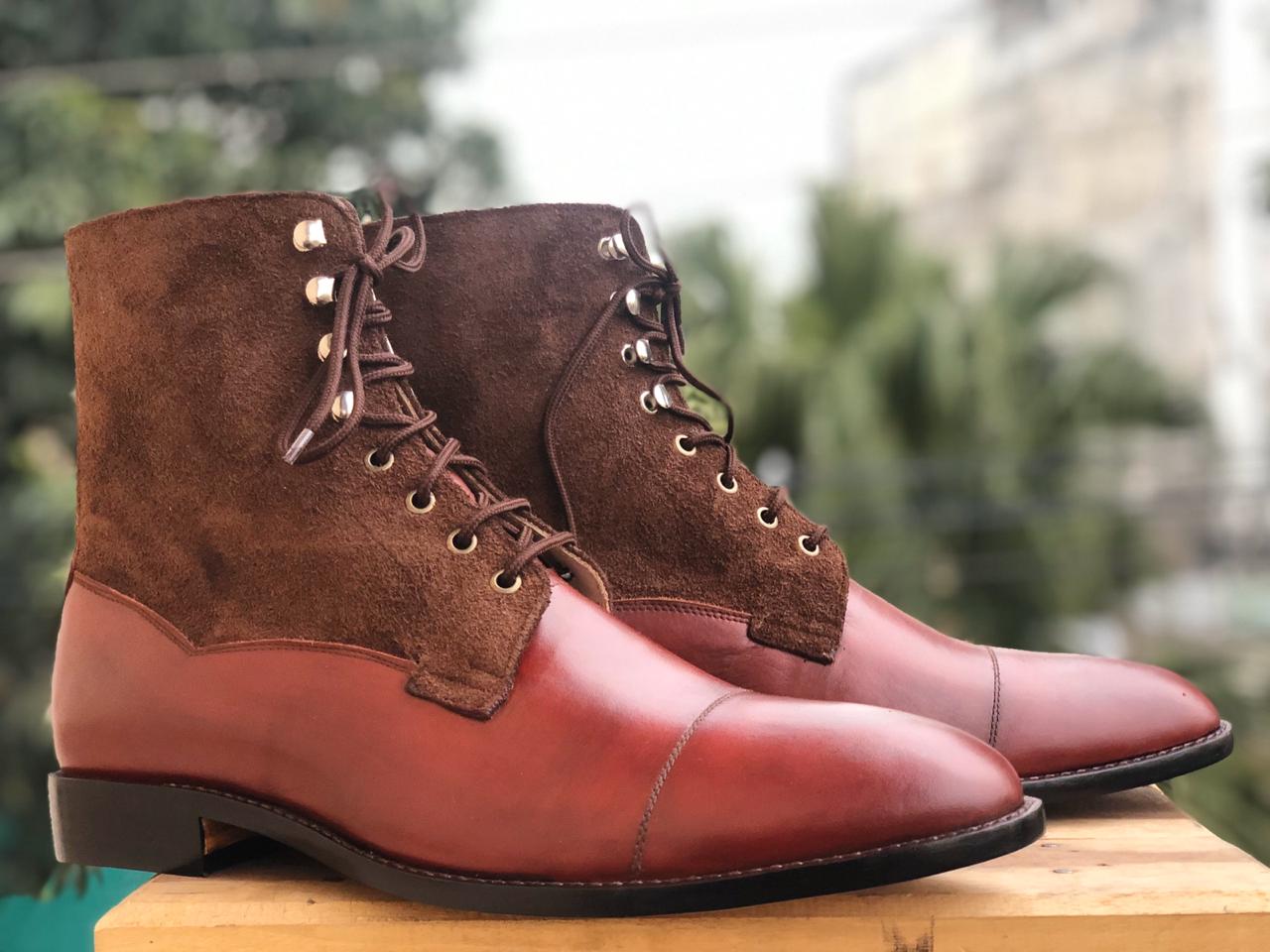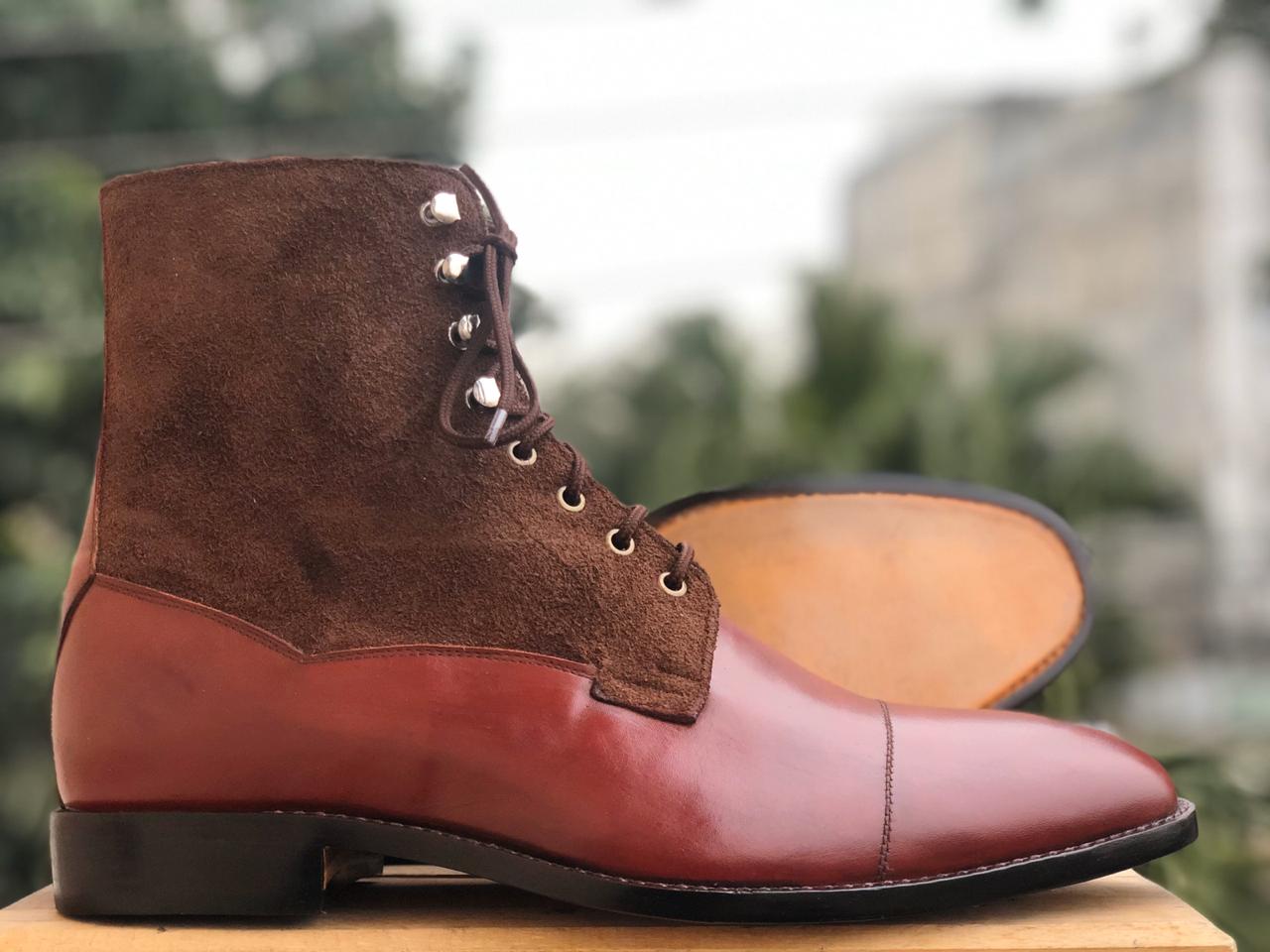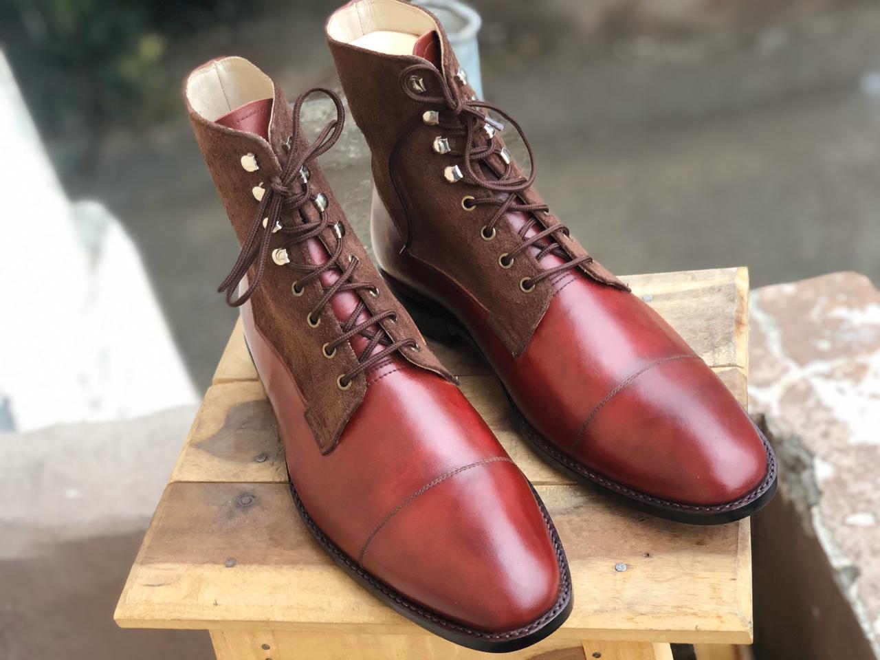 Handmade Men's Burgundy Cap Toe Ankle high Leather Suede Lace Up Boots