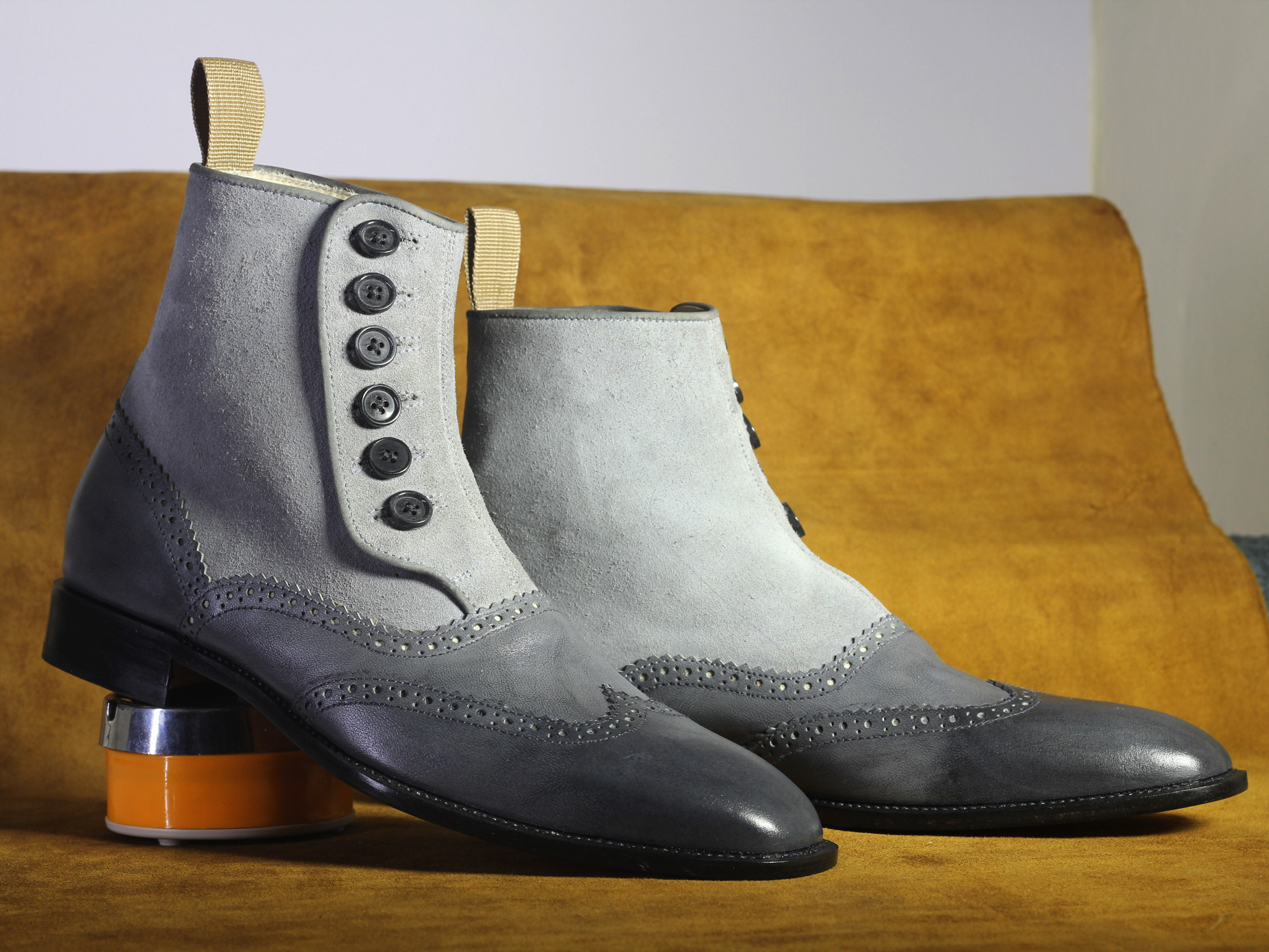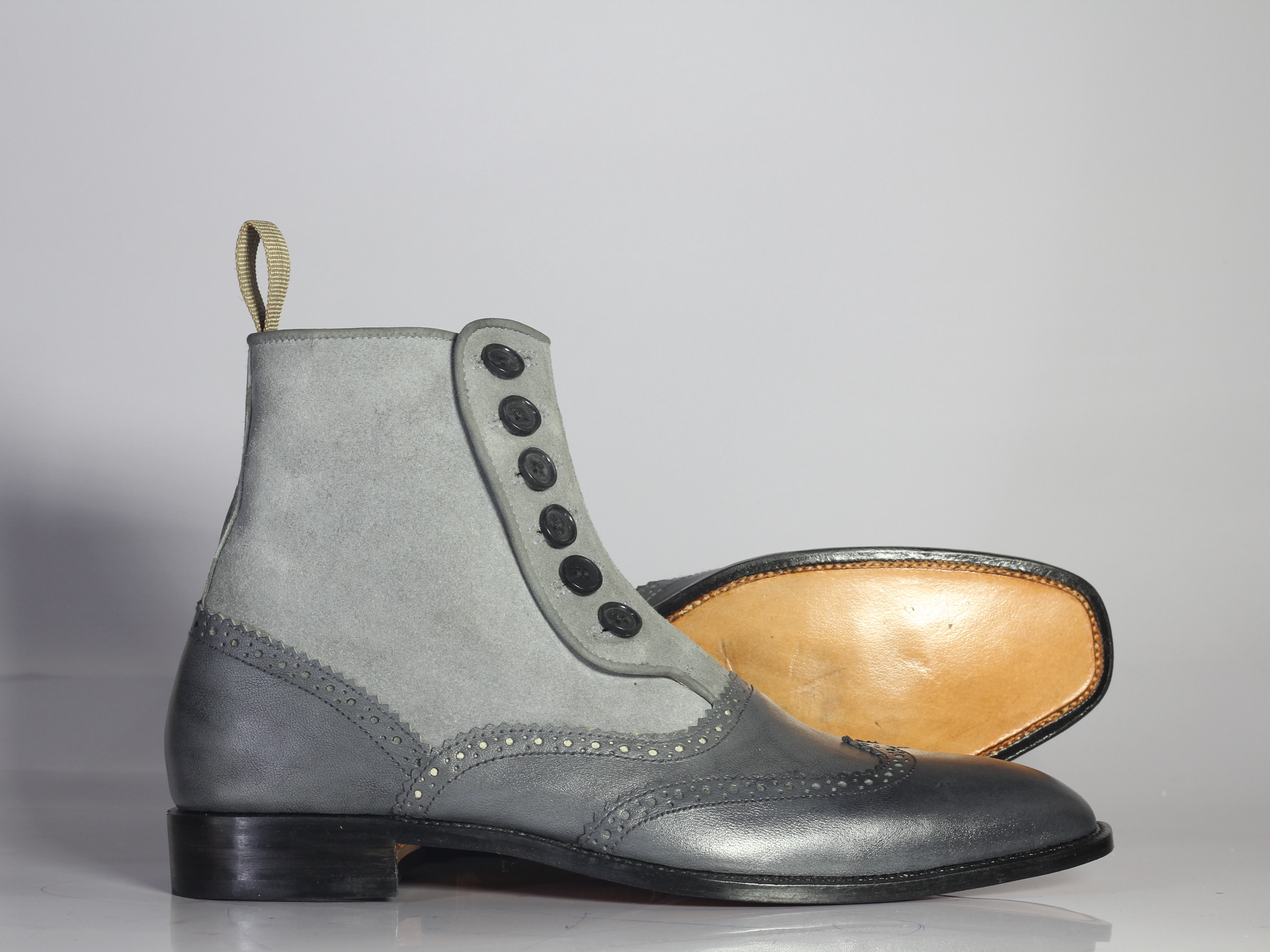 Handmade Black & Gray Leather Suede Wing Tip Button Top Ankle High Dress Boots For Men's