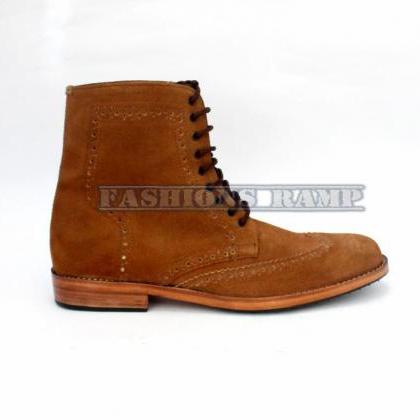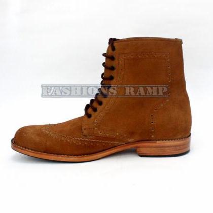 Handmade Men's Tan Suede Wing Tip Brogue Ankle High Lace Up Boots