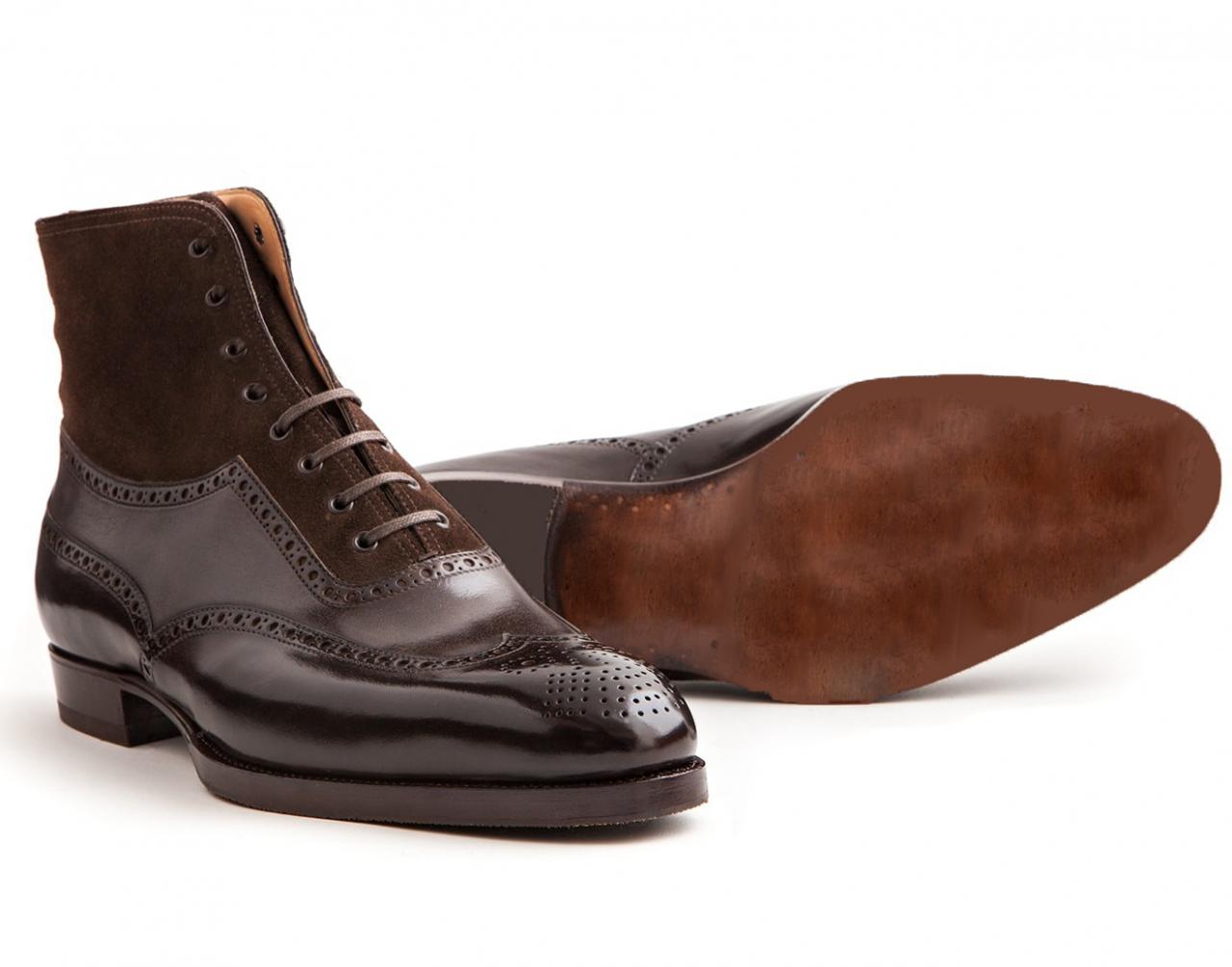 Handmade Men's Chocolate Brown Leather Suede Wing Tip Brogue Ankle High Lace Up Boots
