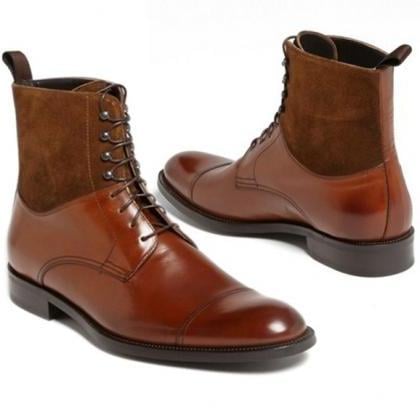 Handmade Brown & Tan Color Leather Suede Cap Toe Ankle High Lace Up Boots For Men's