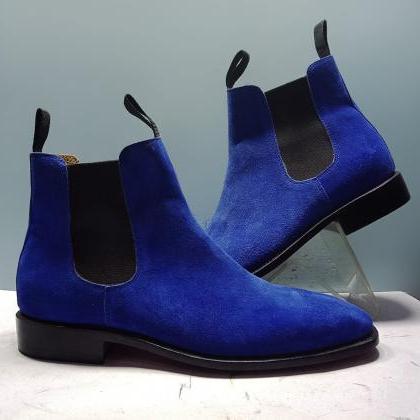Handmade Men's Blue Suede Ankle High Chelsea Dress Boots