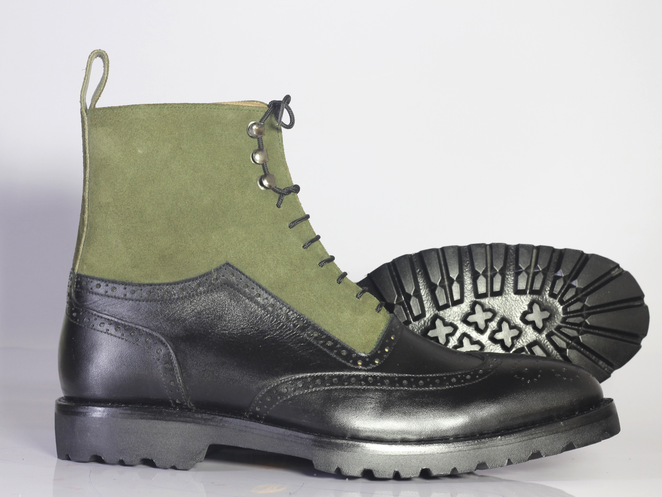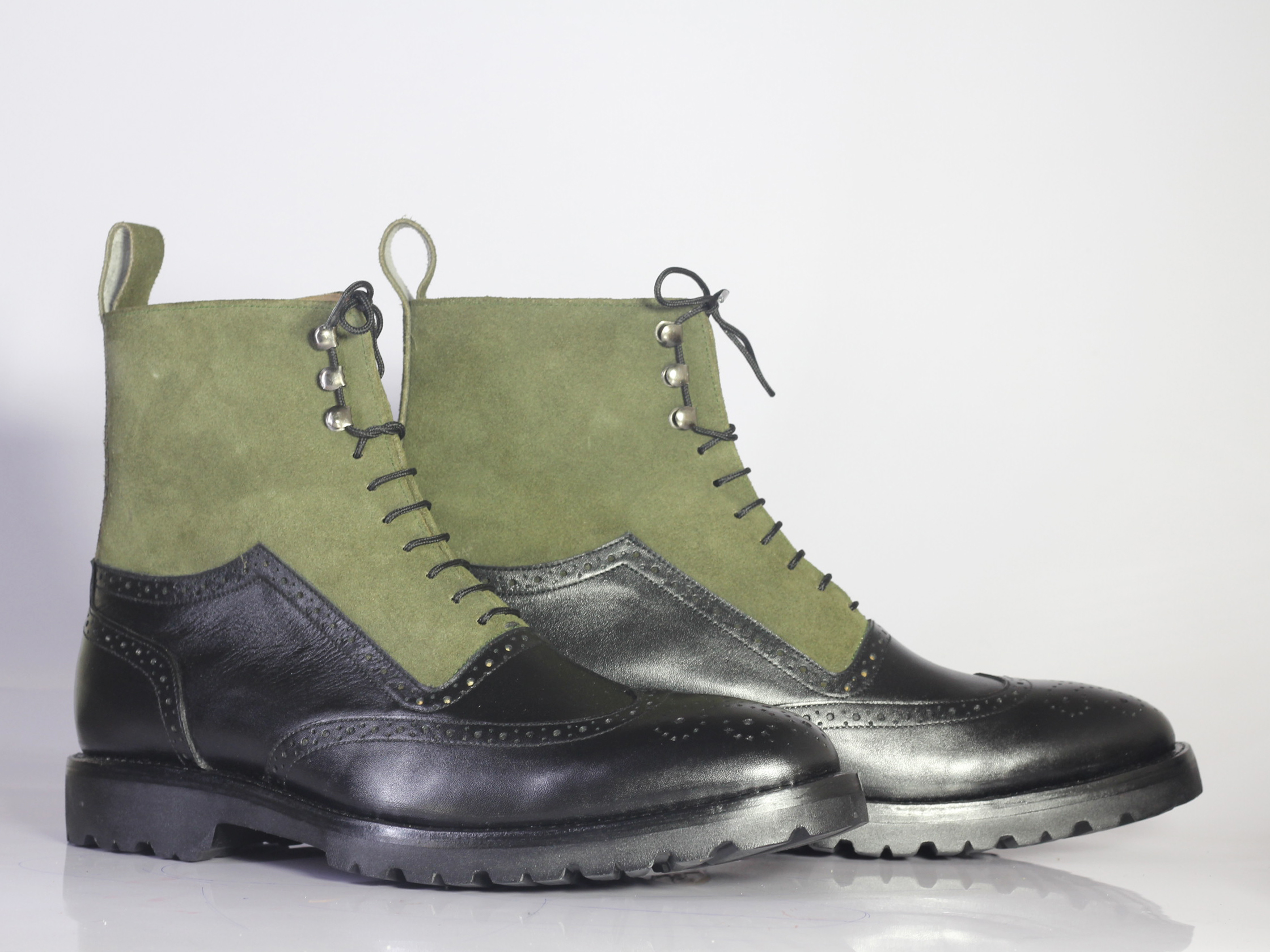 Handmade Men's Black & Olive Green Leather Suede Wing Tip Brogue Ankle High Lace Up Boots