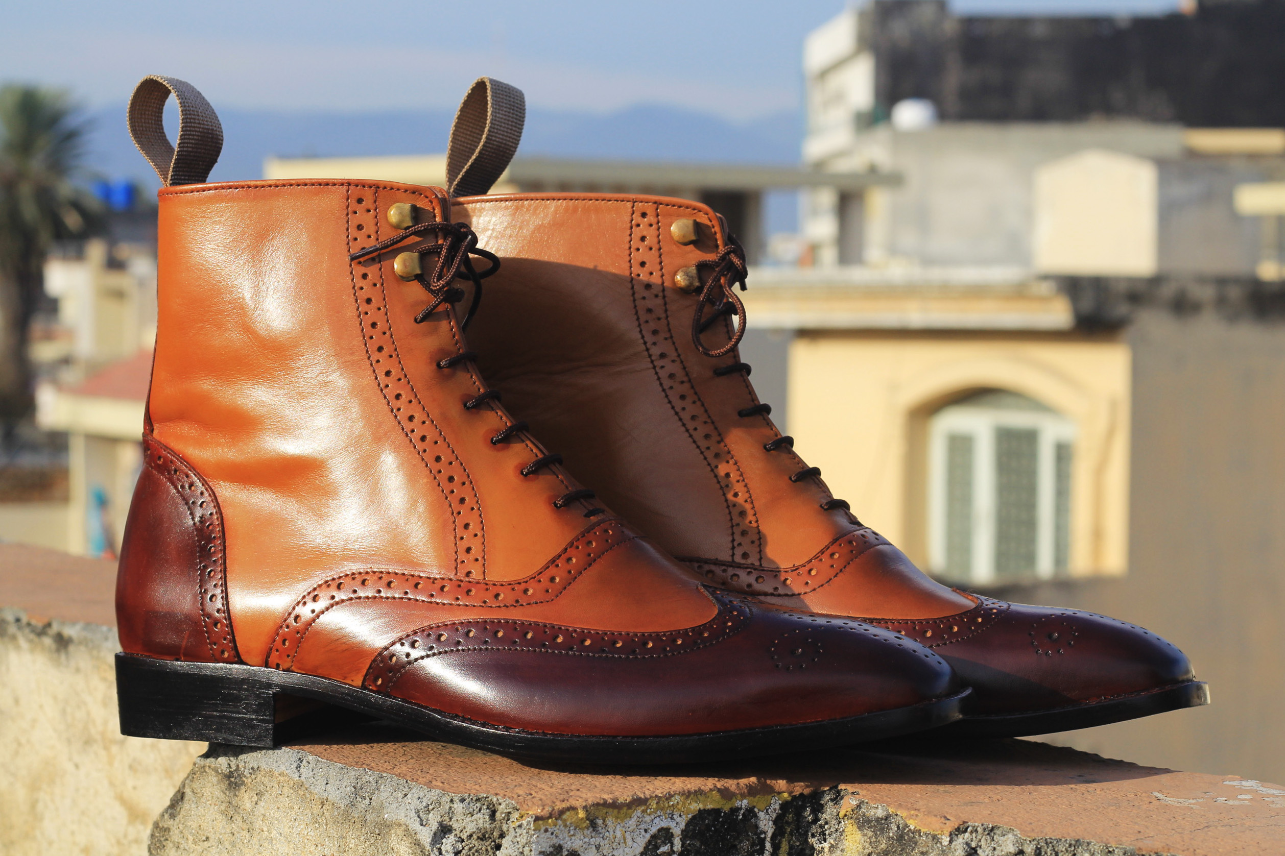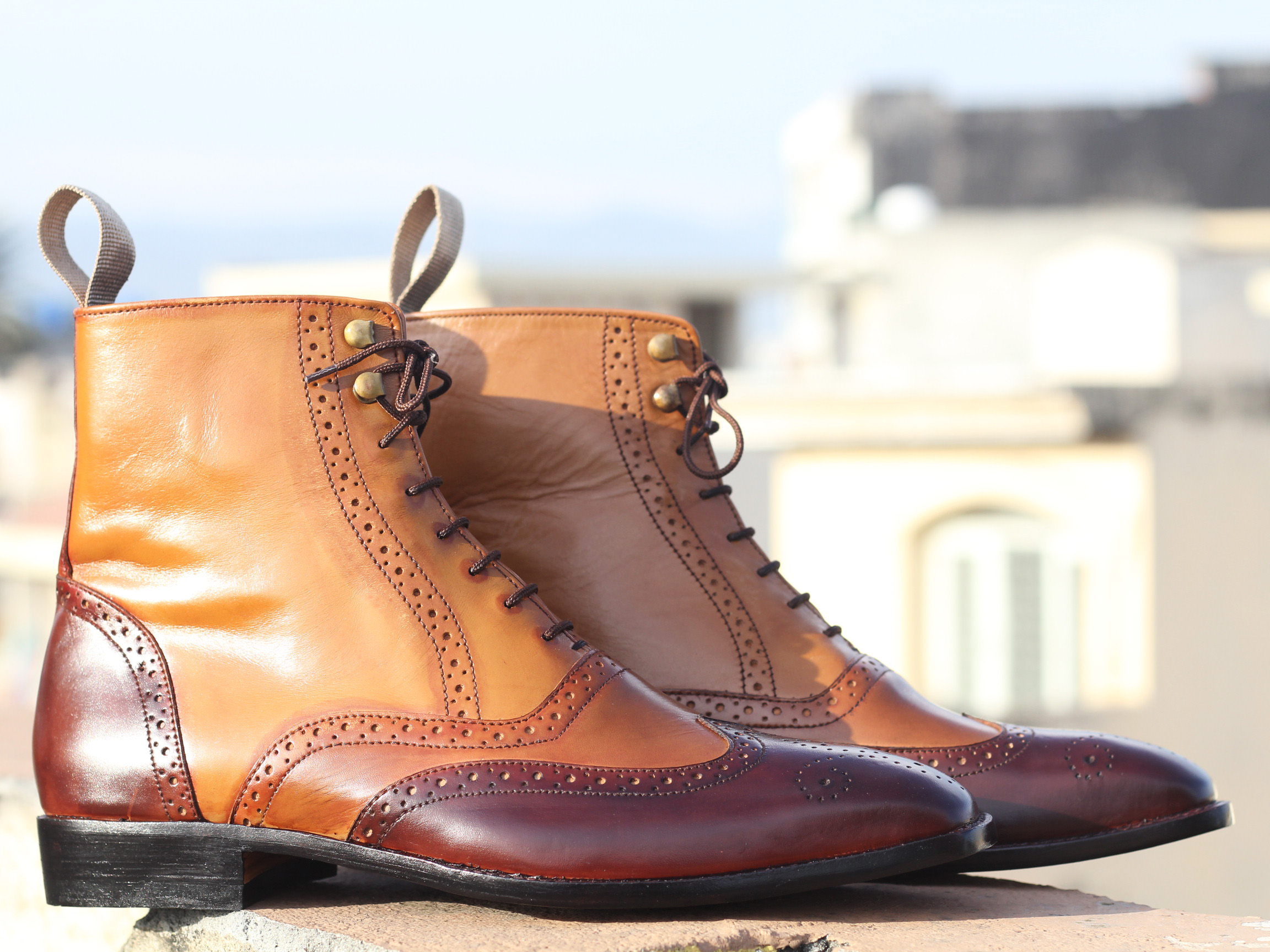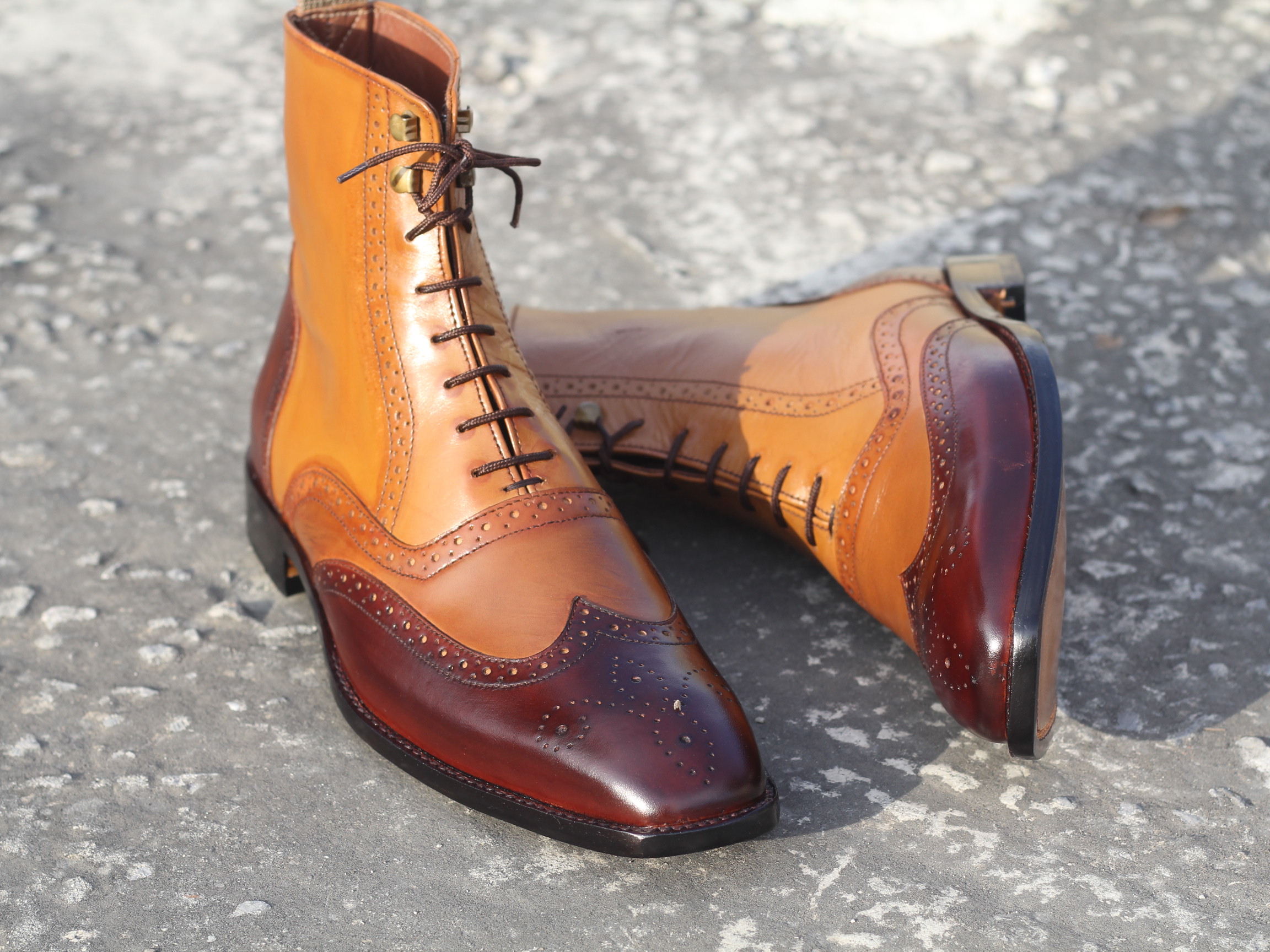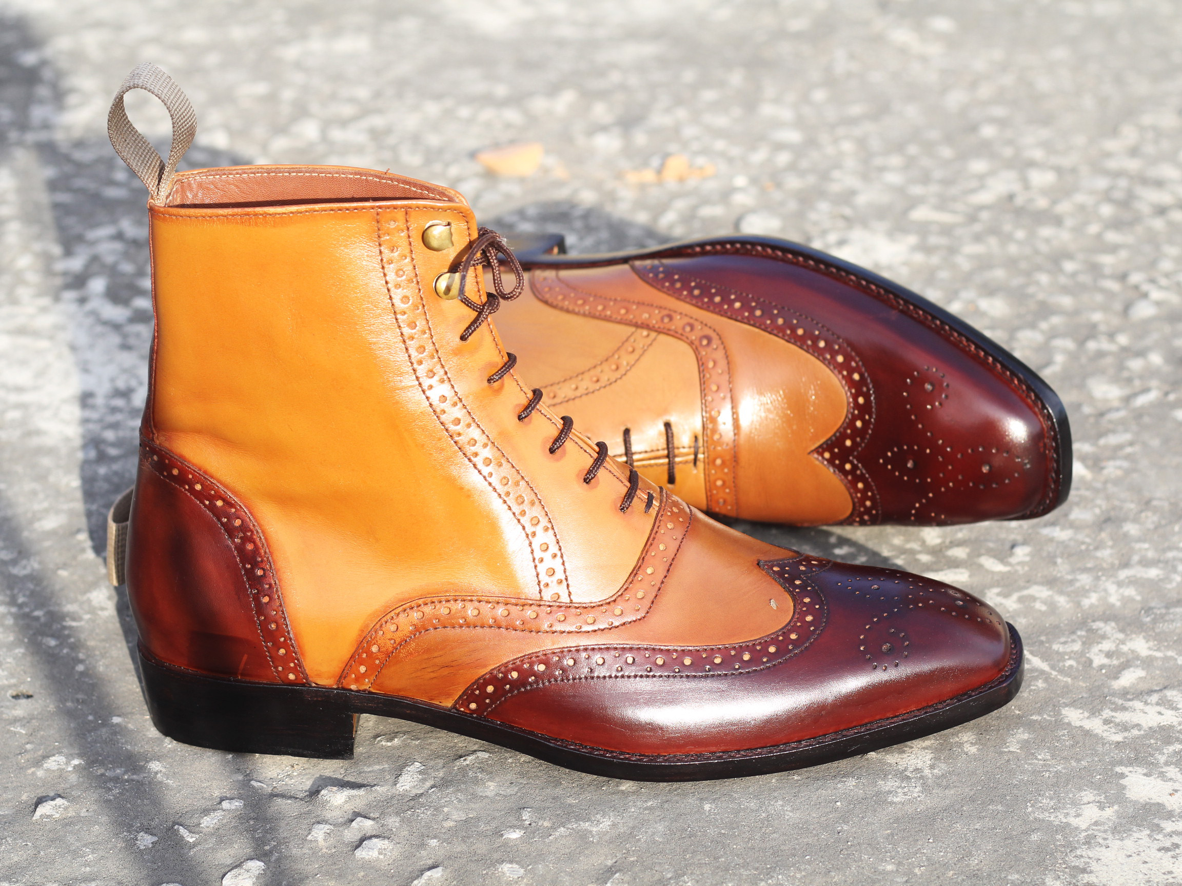 Handmade Ankle High Tan & Burgundy Wing Tip Brogue Leather Boot For Men's
