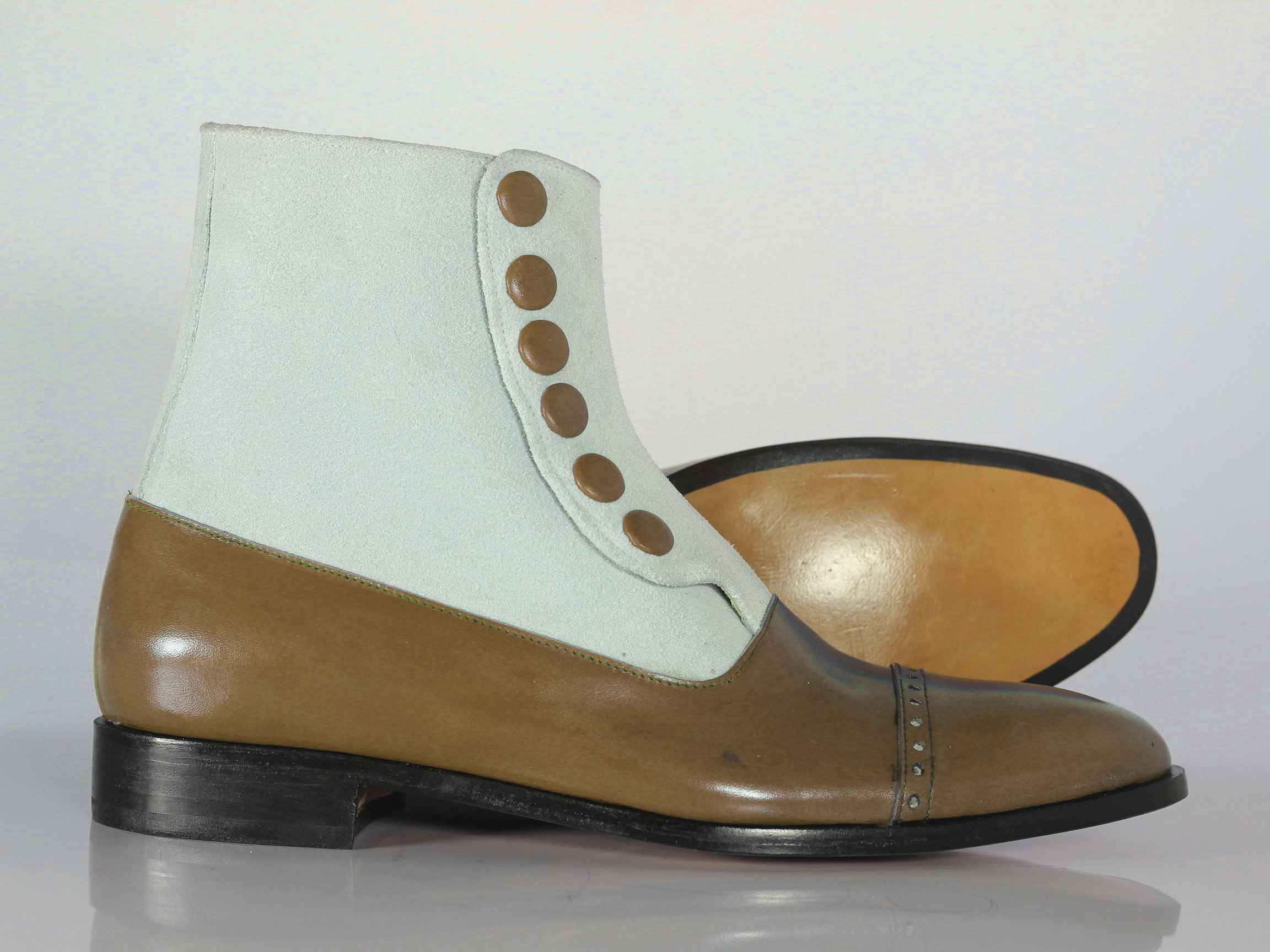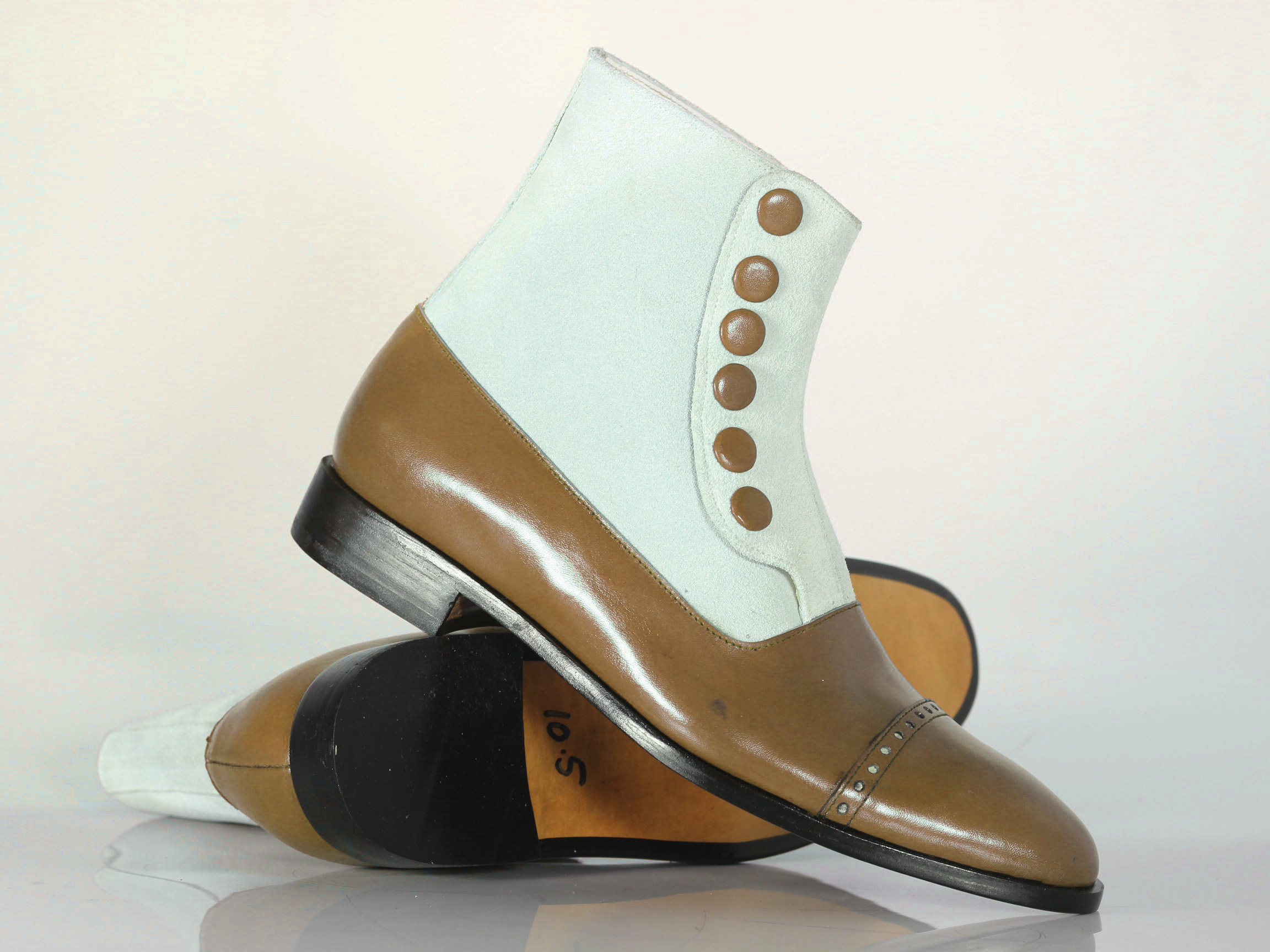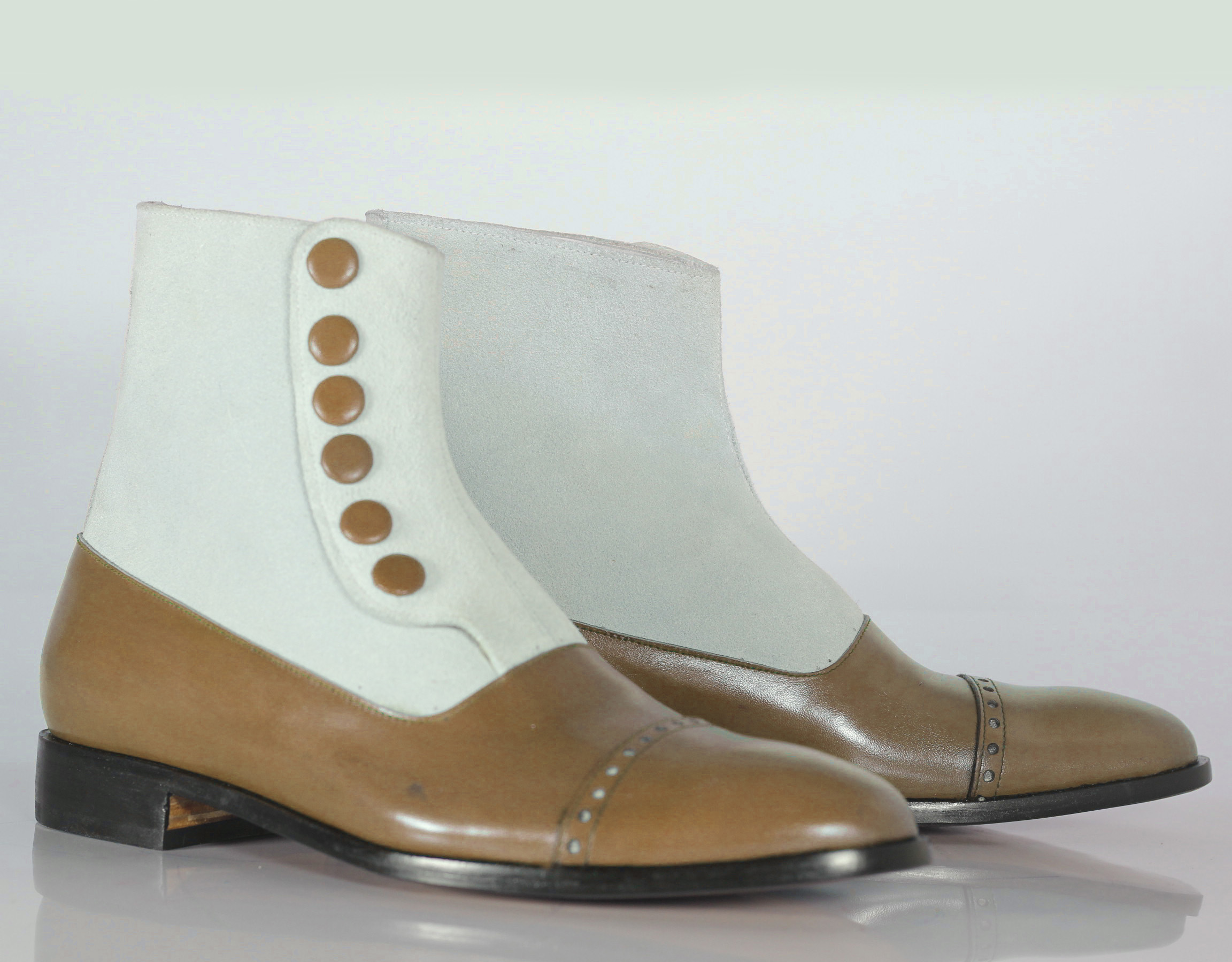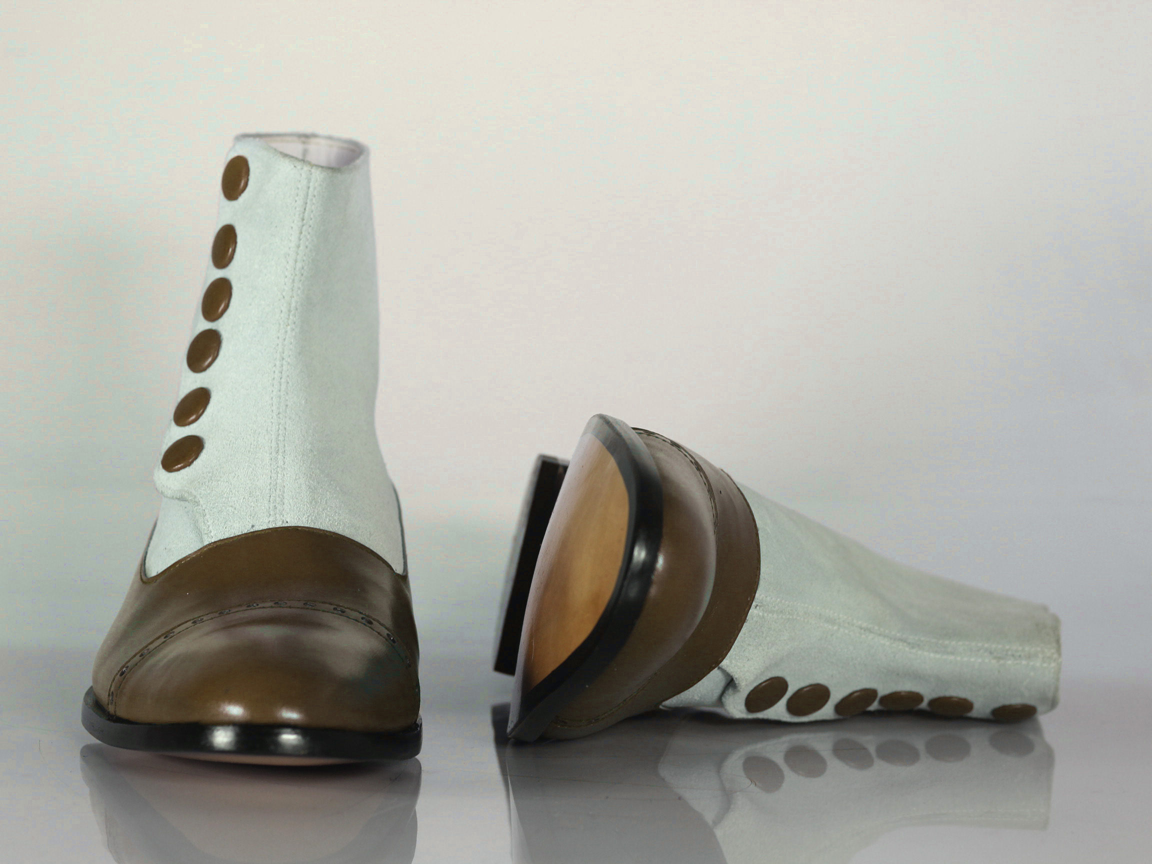 Handmade Men's White & Brown Leather Suede Cap Toe Button Top Ankle High Boots