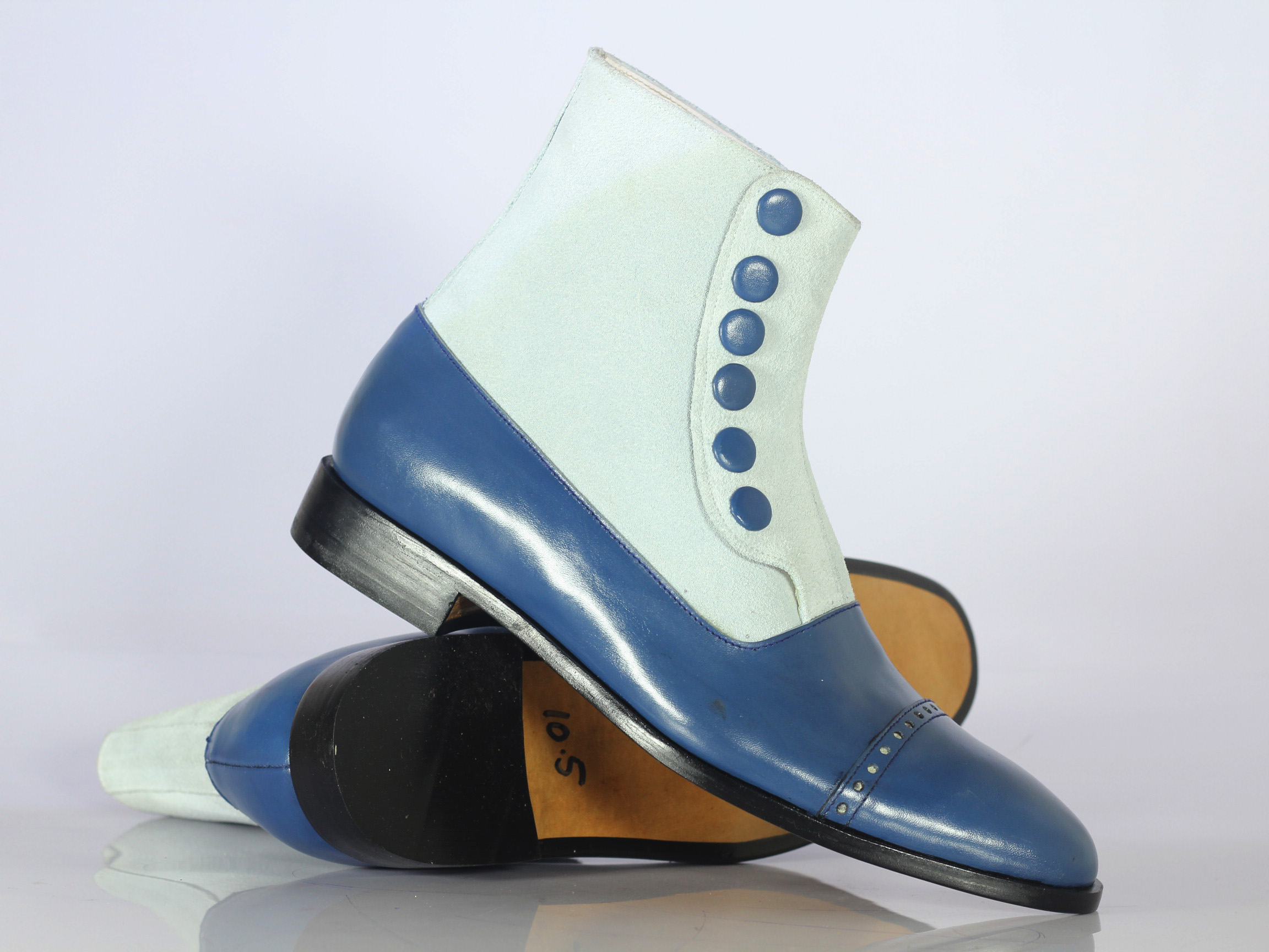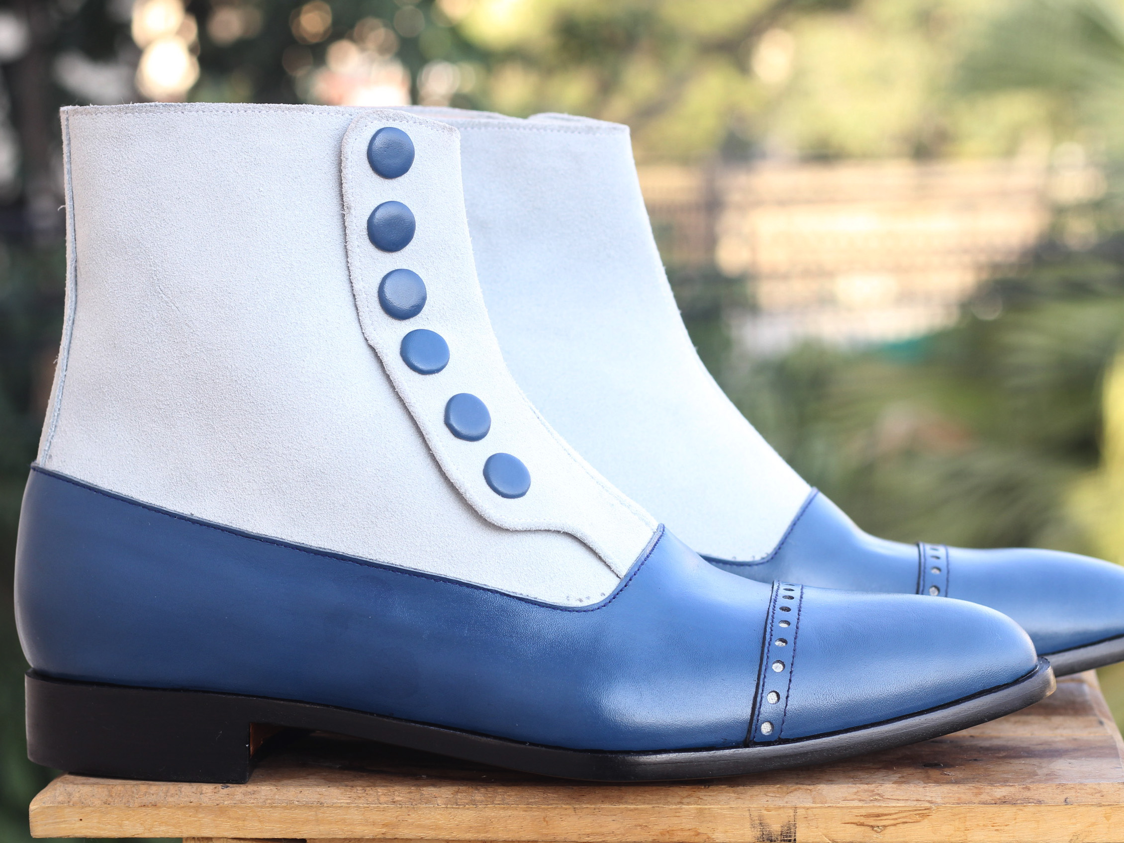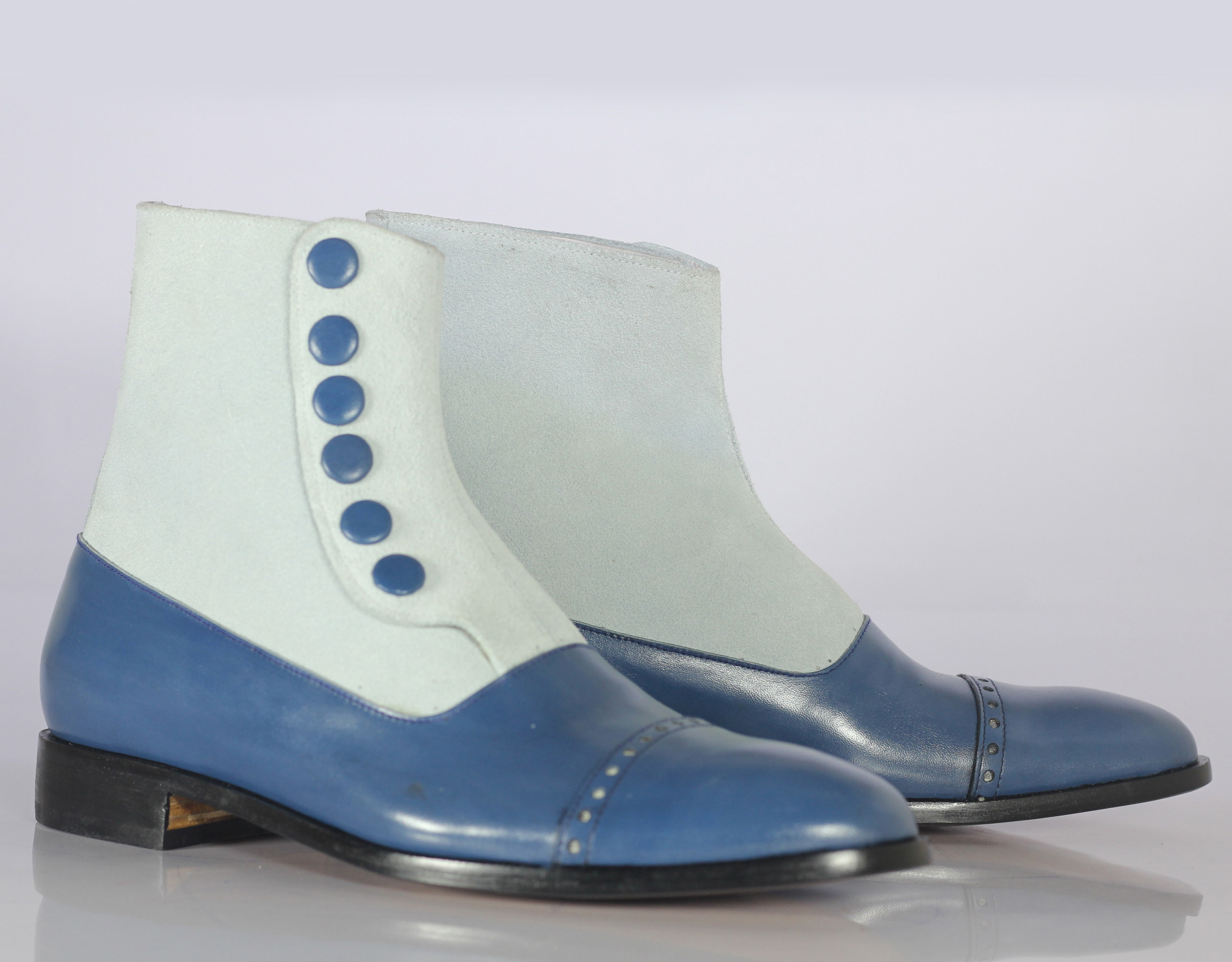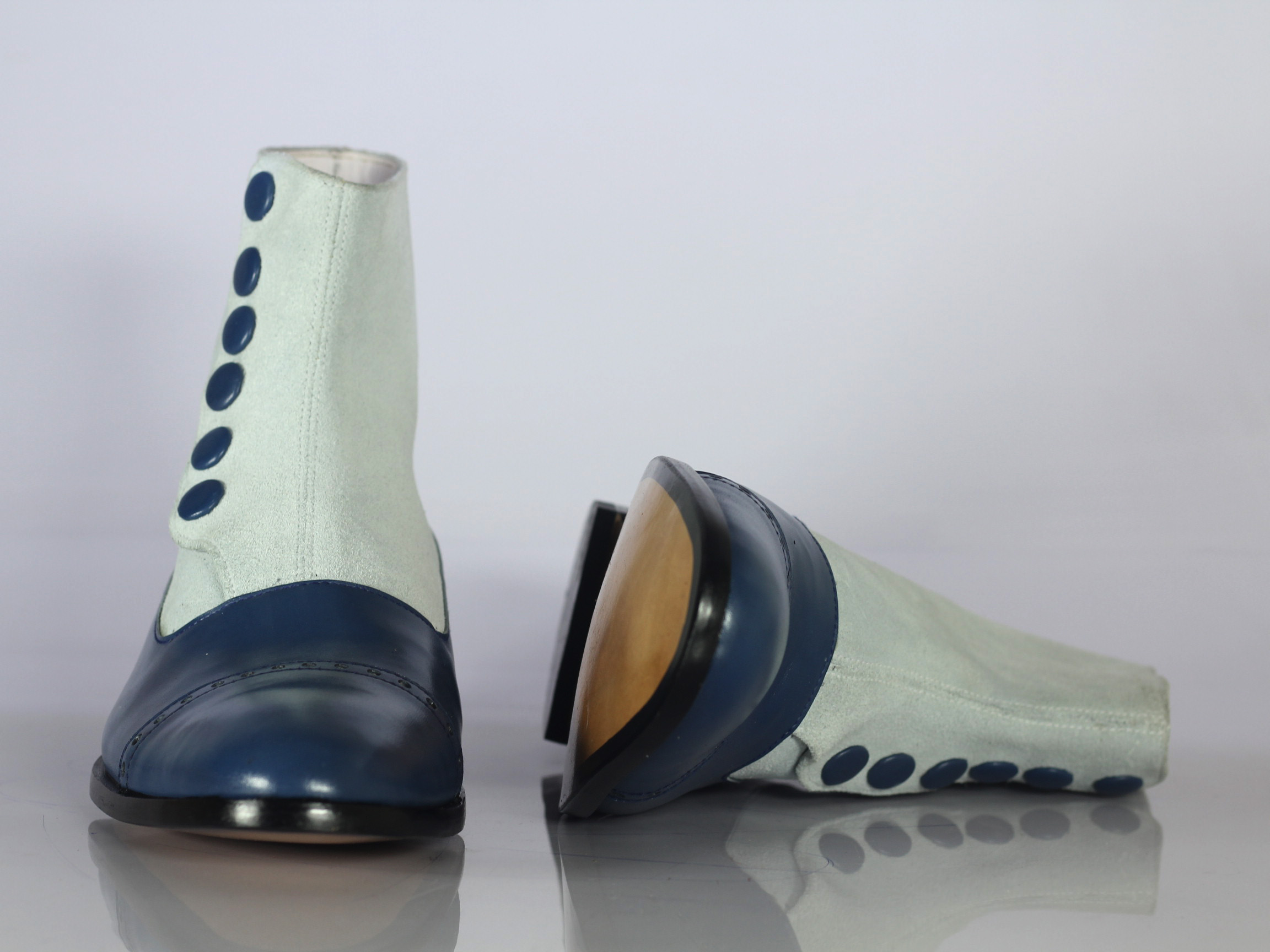 Handmade Men's White & Blue Leather Suede Cap Toe Button Top Ankle High Boots
