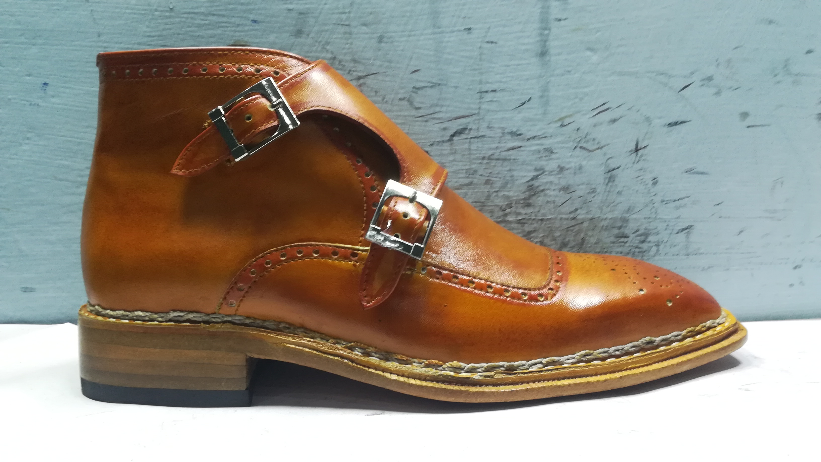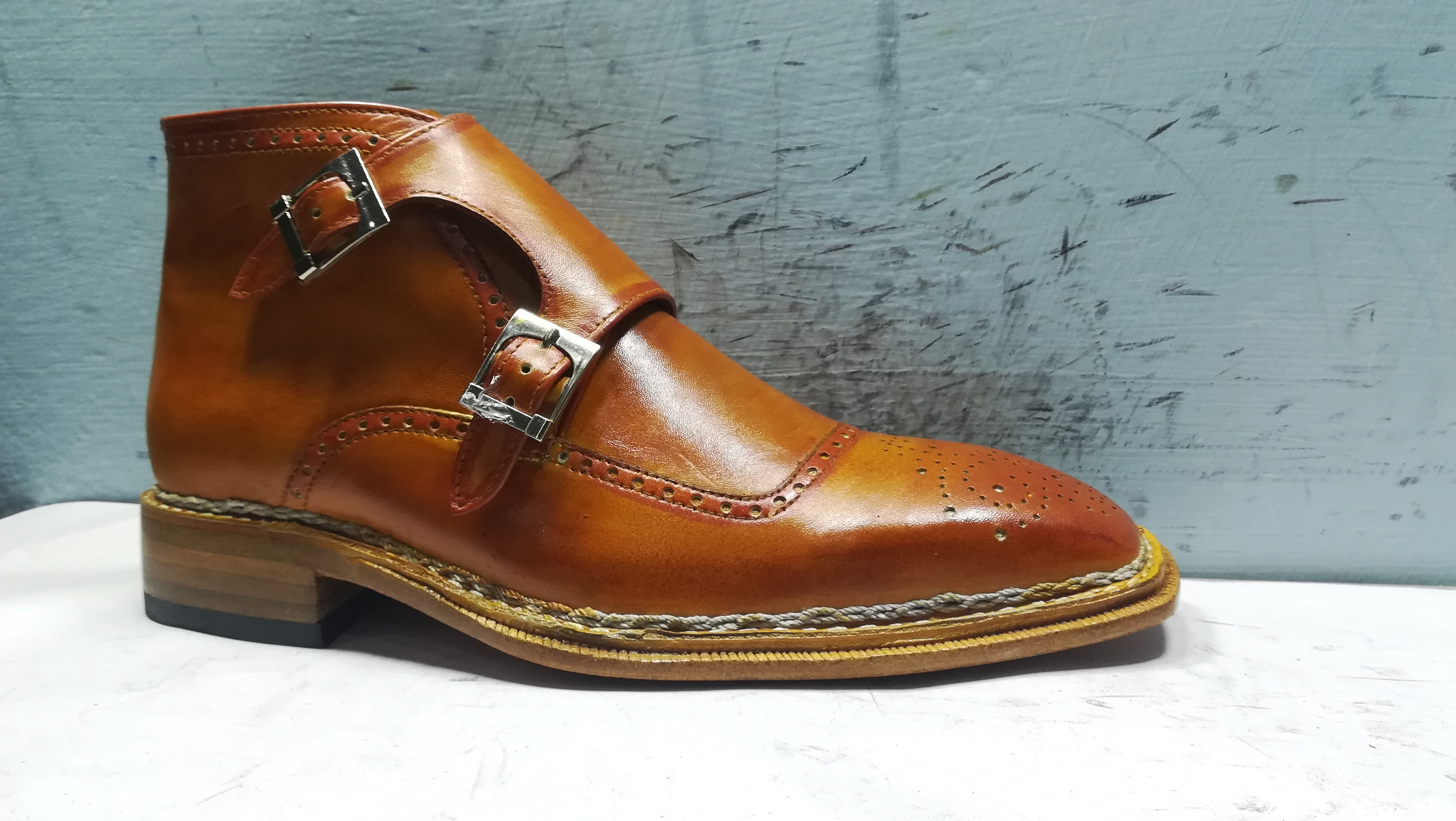 Handmade Men's Tan Leather Brogue Toe Double Monk Straps Boots