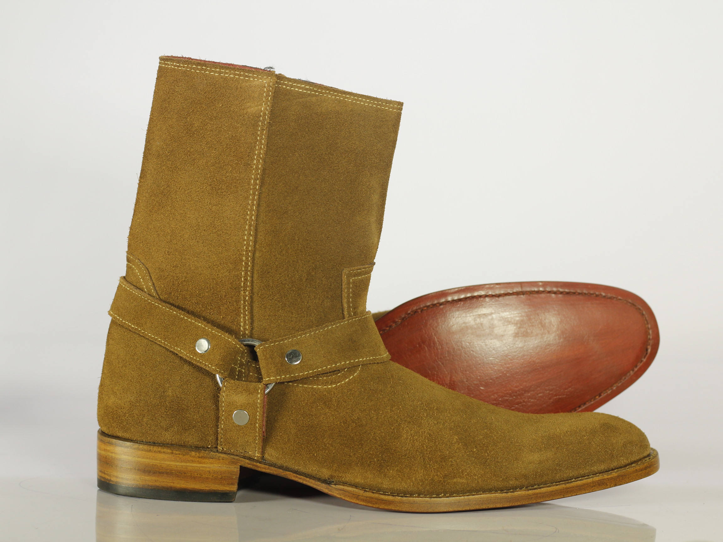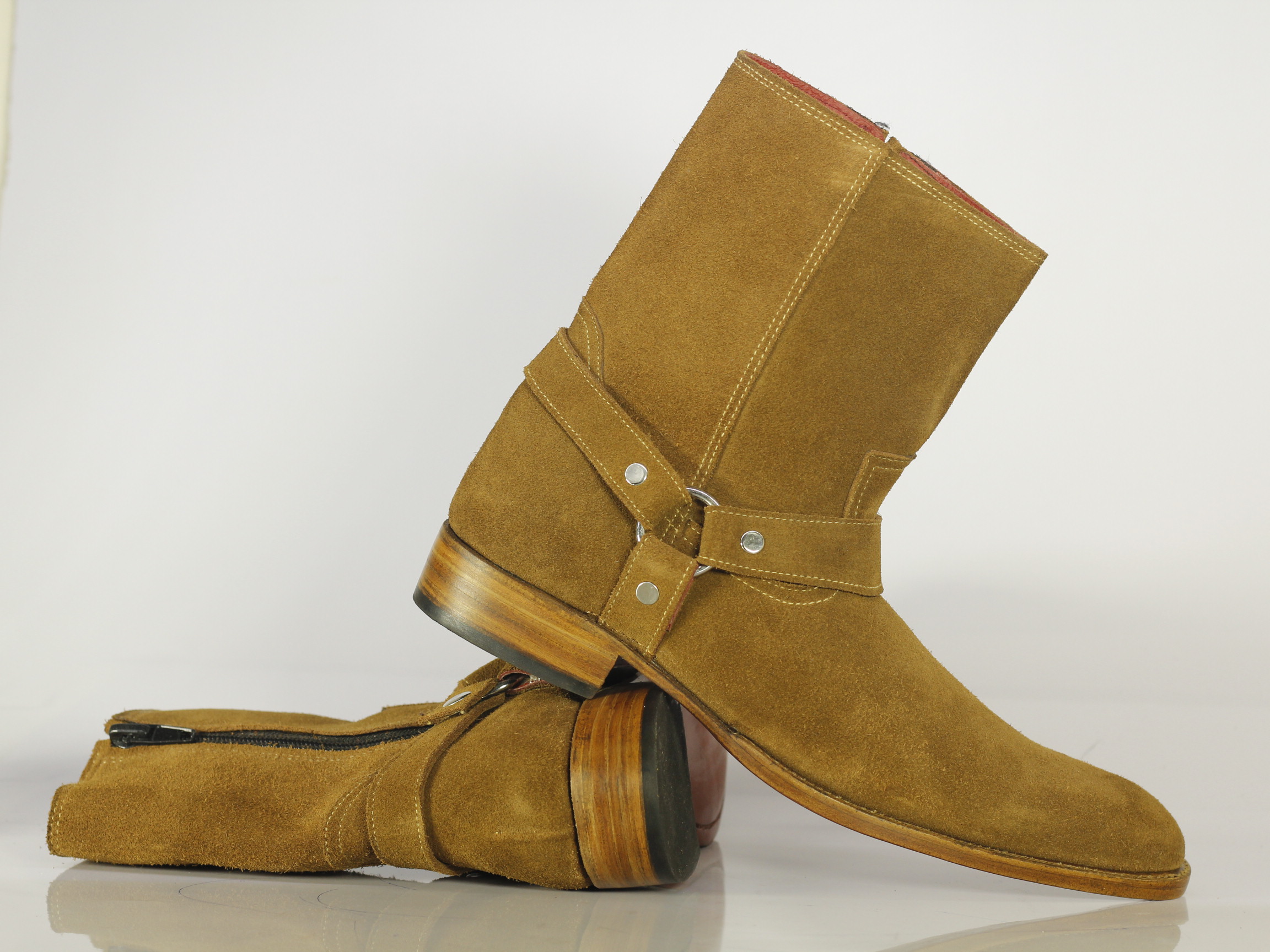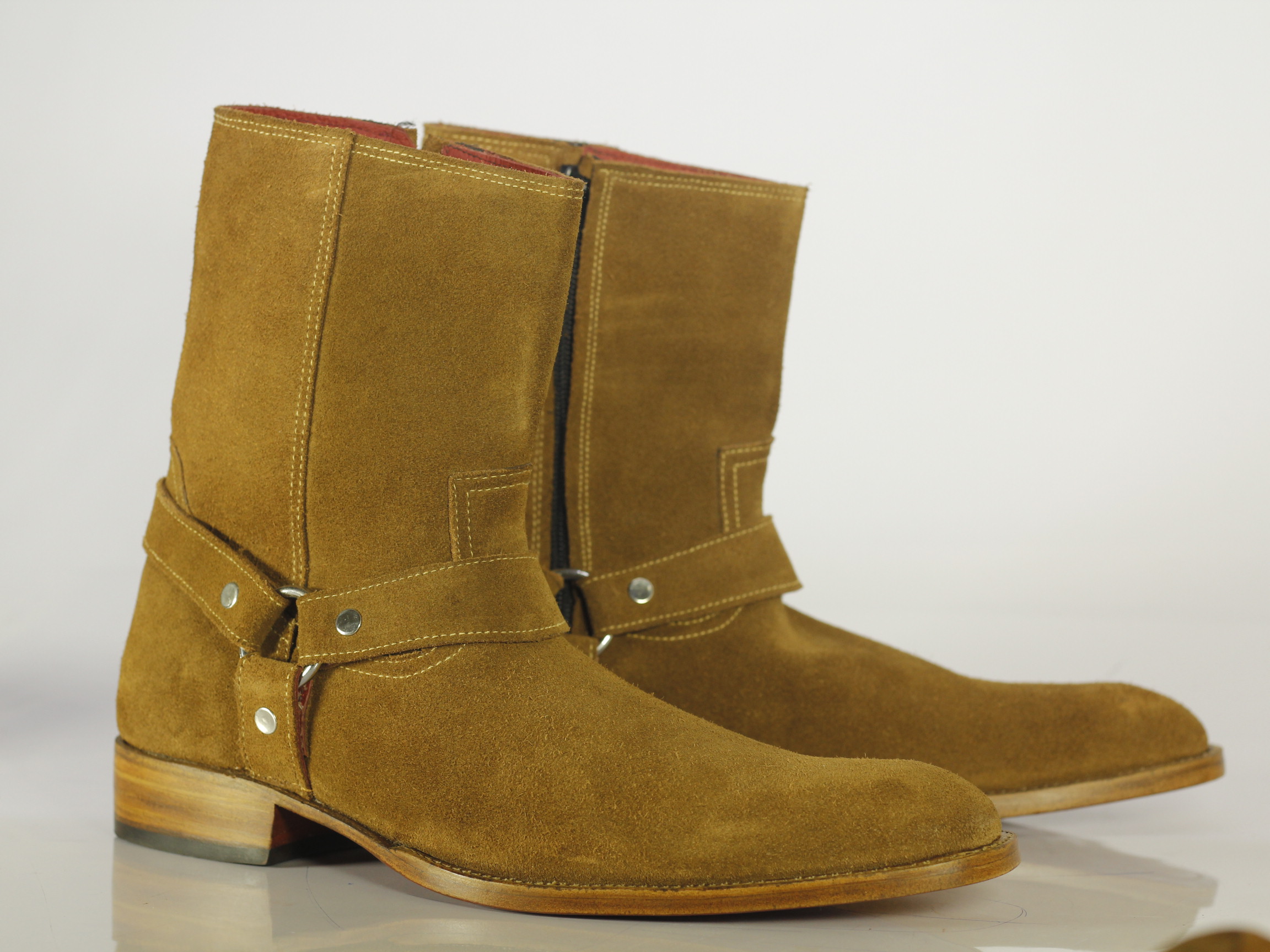 Handmade Men's Tan Ankle High Suede Madrid Strap Boots