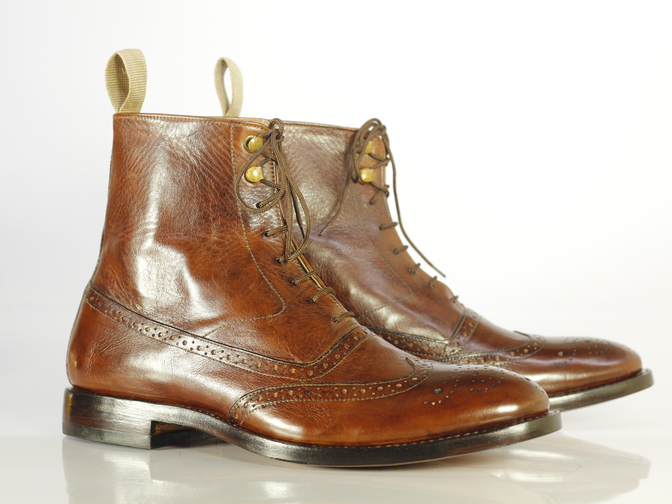 Handmade Men's Tan Wing Tip Brogue Ankle High Leather Boots
