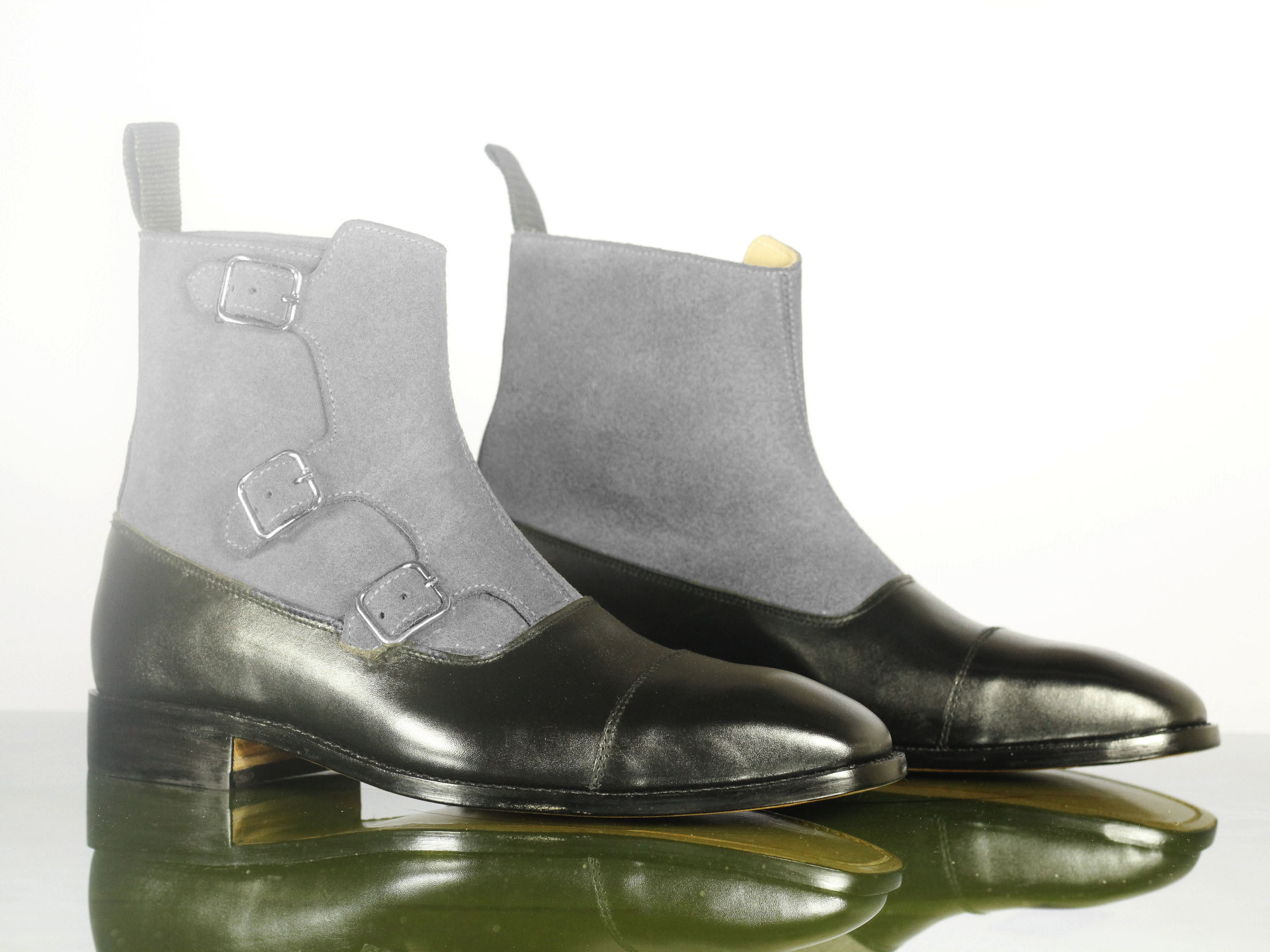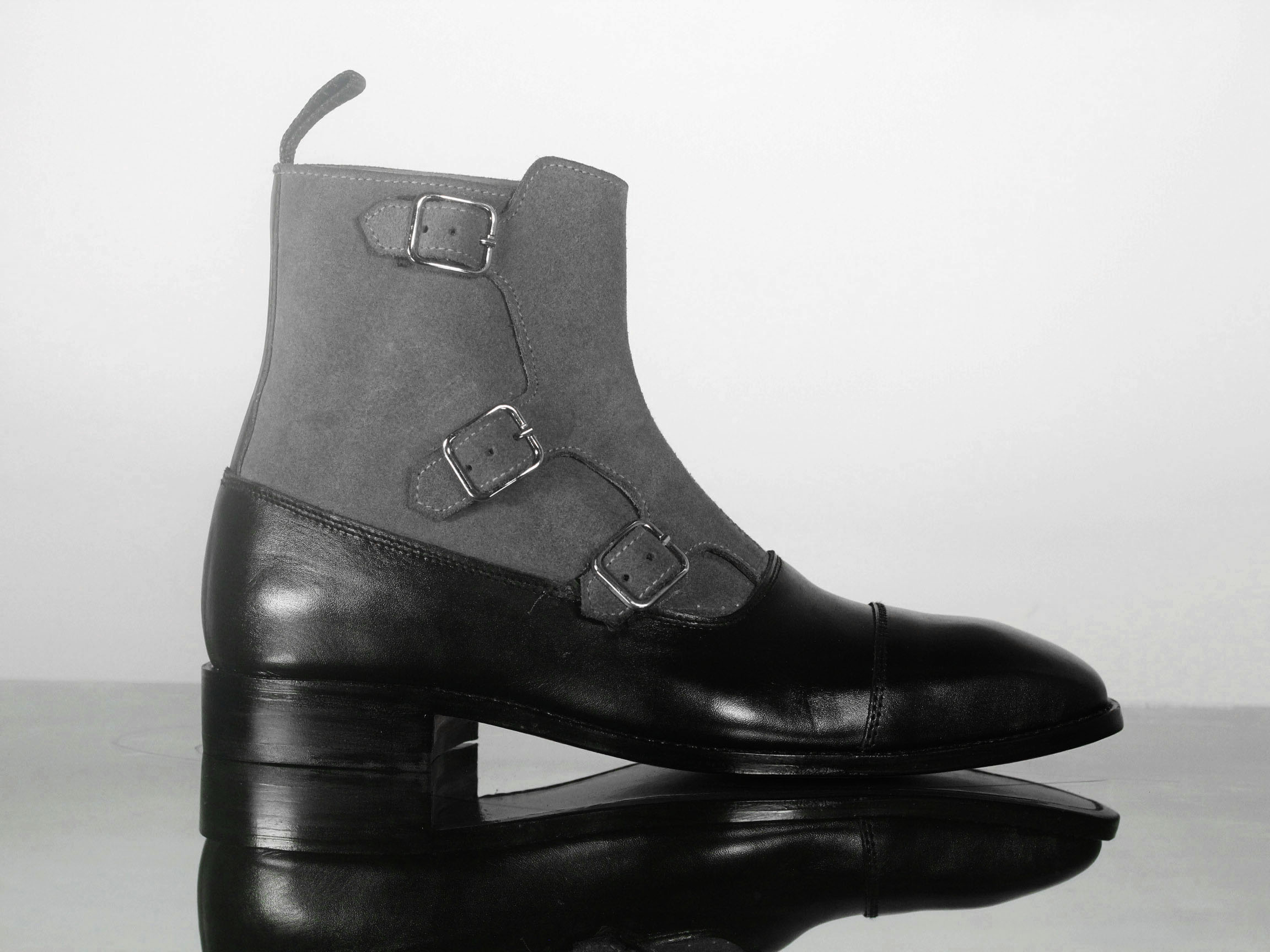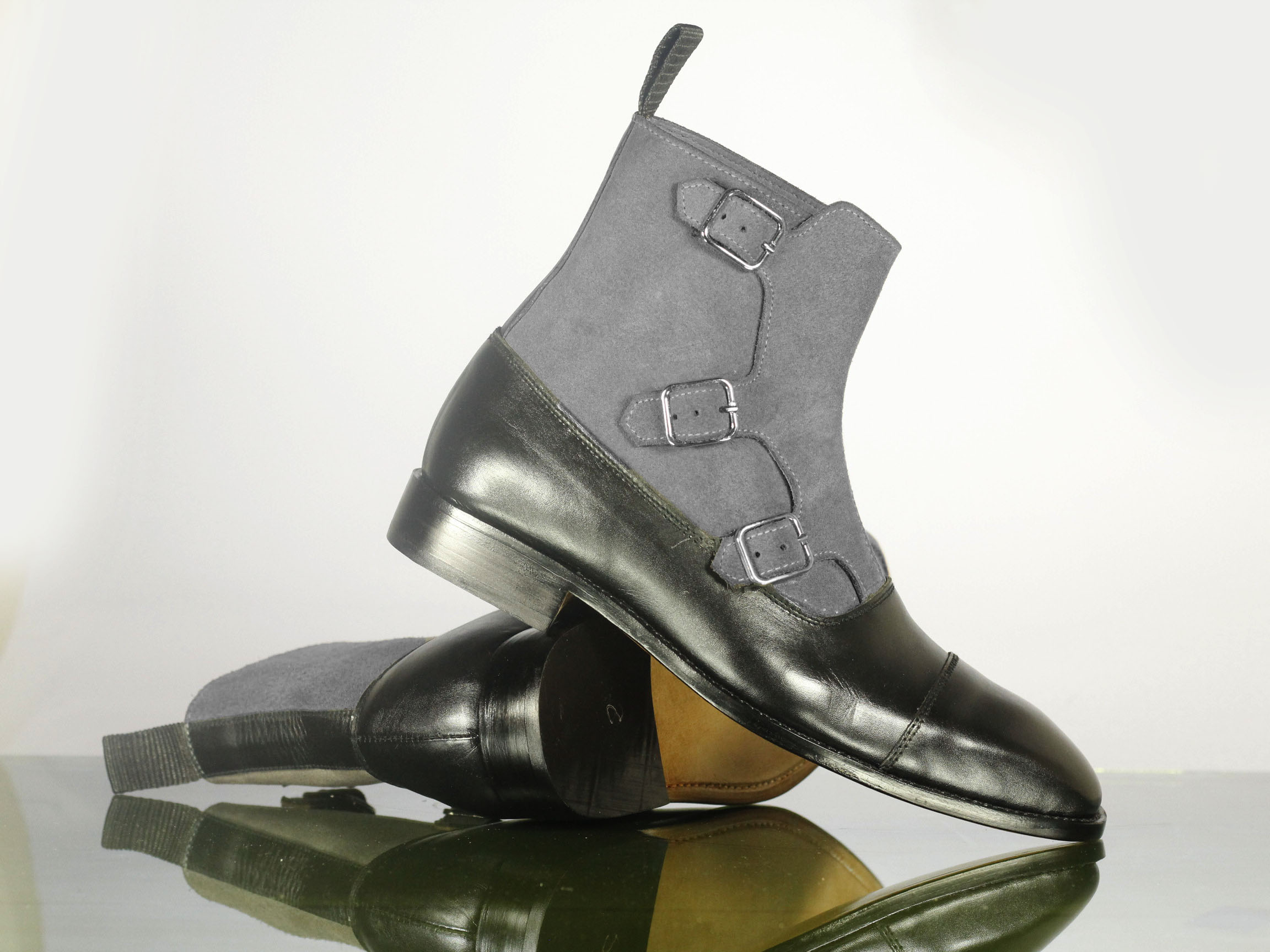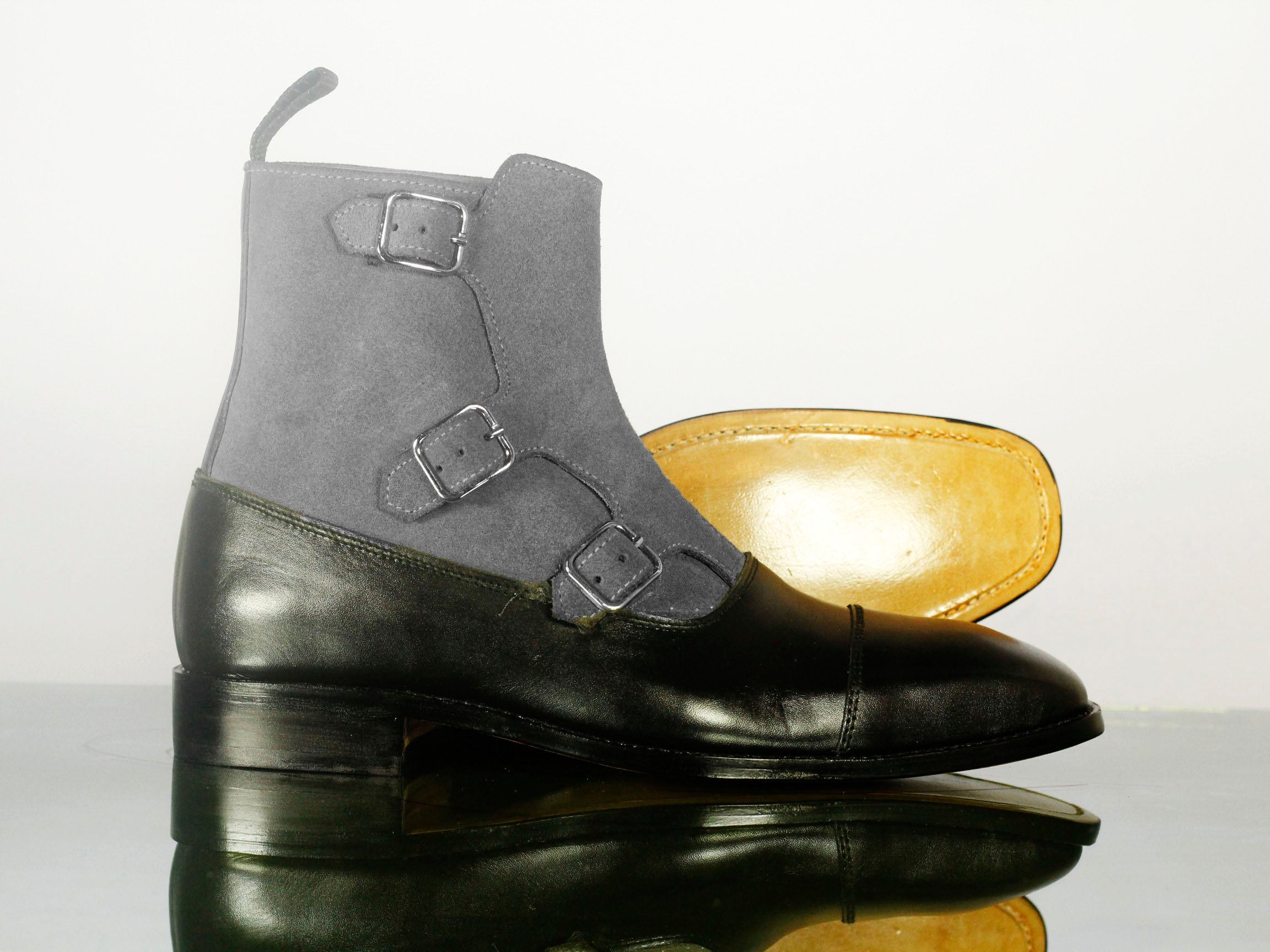 Handmade Men's Black & Grey Leather & Suede Triple Monk Cap Toe Formal Boots