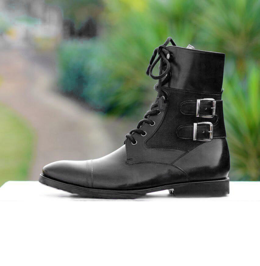 Handmade Men's Black Ankle High Buckle Lace Up Leather Boots