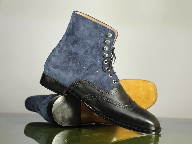 Handmade Men's Navy & Black Wing Tip Lace Up Ankle Boots