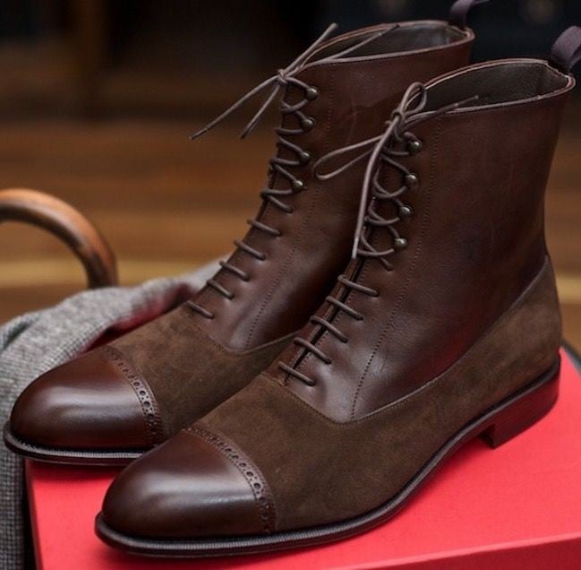 Handmade Men's Brown Cap Toe Leather & Suede Lace Up Ankle Boots