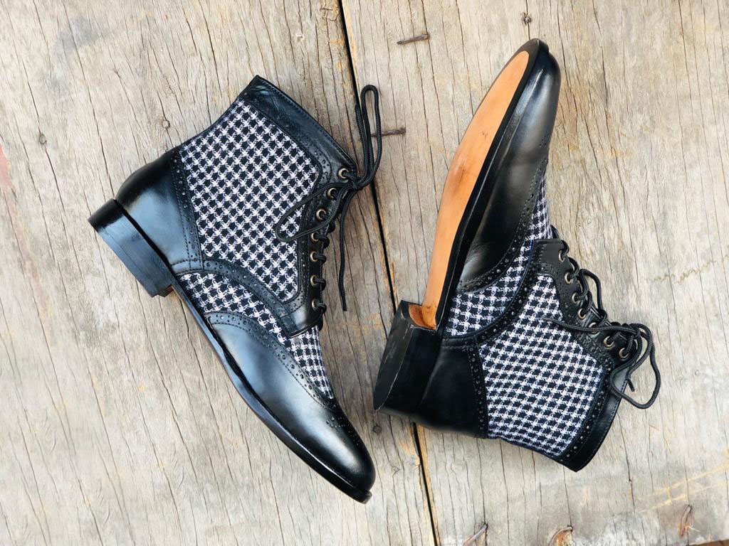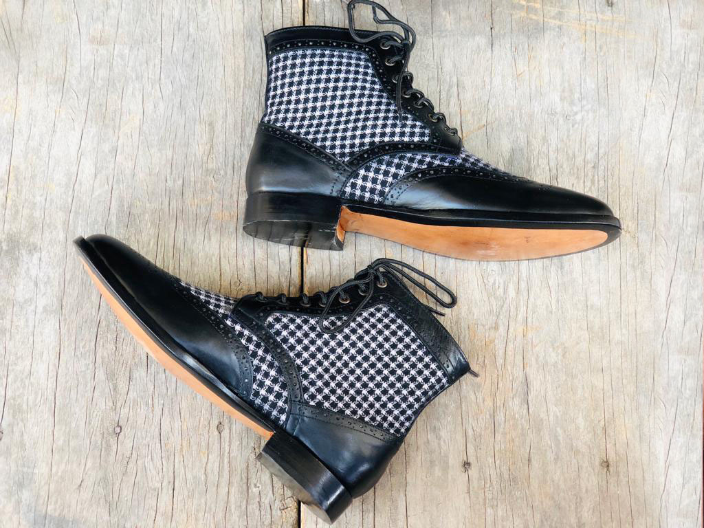 Handmade Black Wing Tip Brogue Leather Tweed Boots, Classic Elegant Stylish Dress Formal Boots