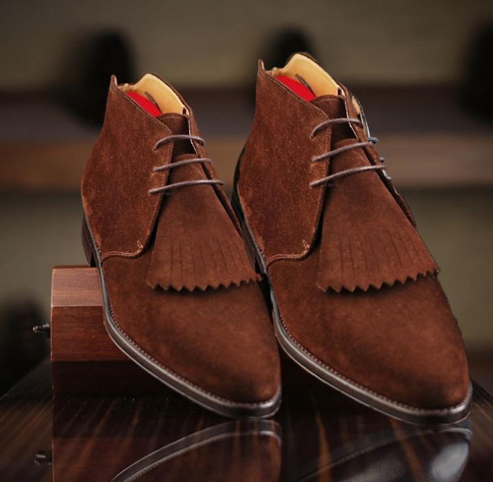 Men Dark Brown Chukka Fringe Formal Suede Boots, Handmade Dress Formal Suede Boots