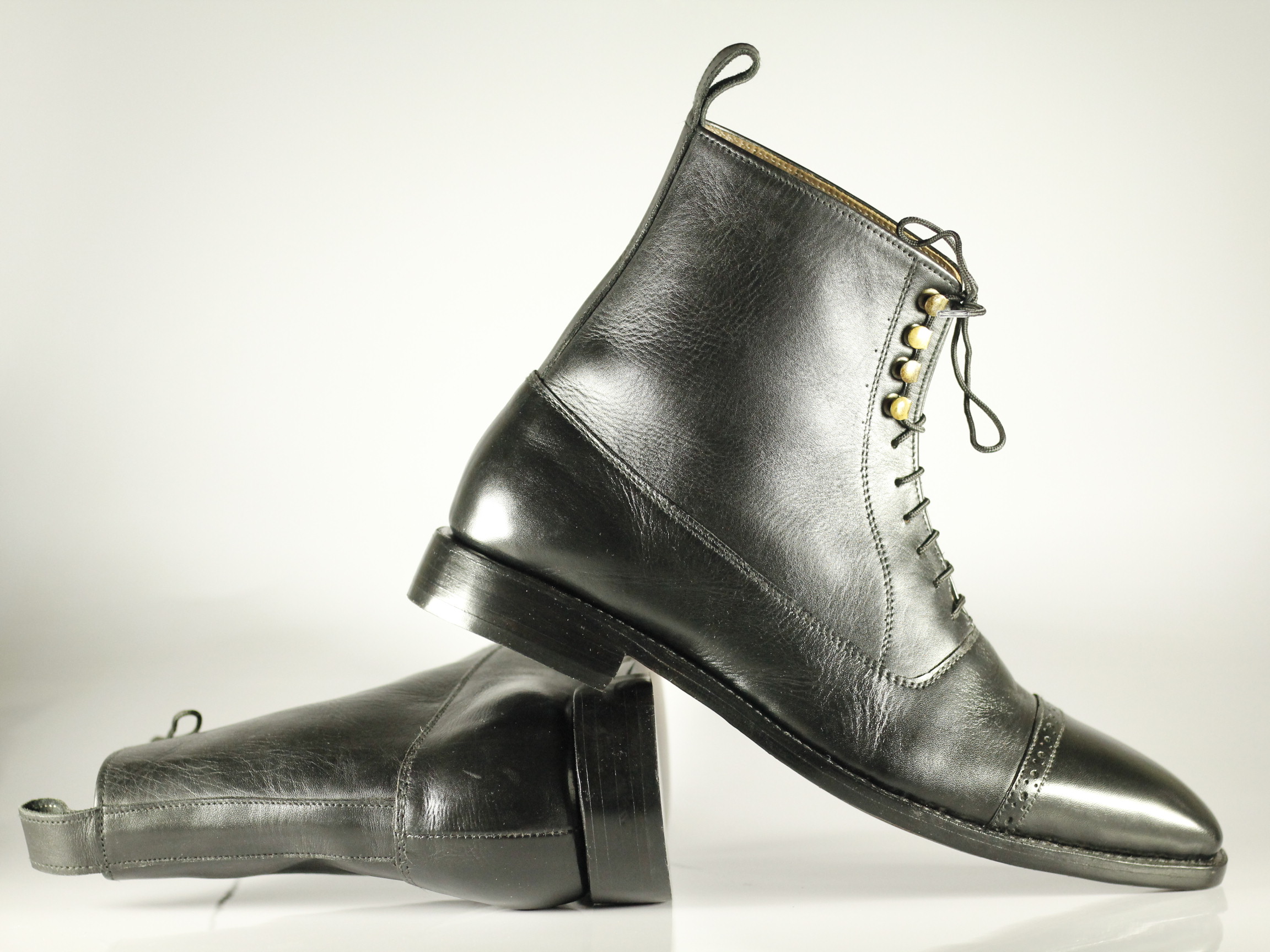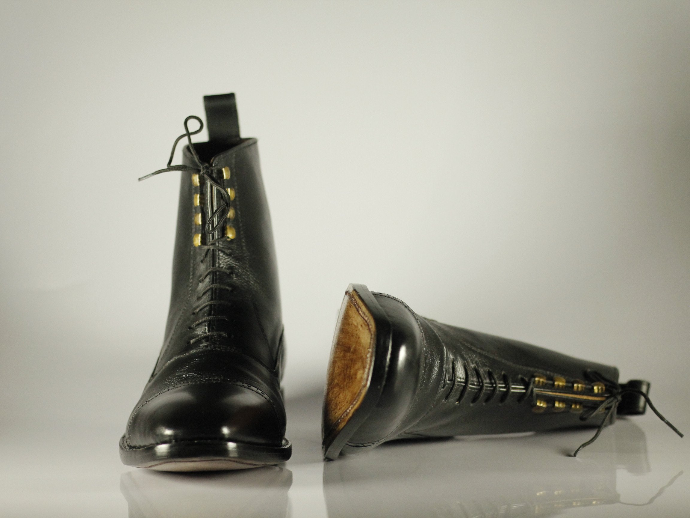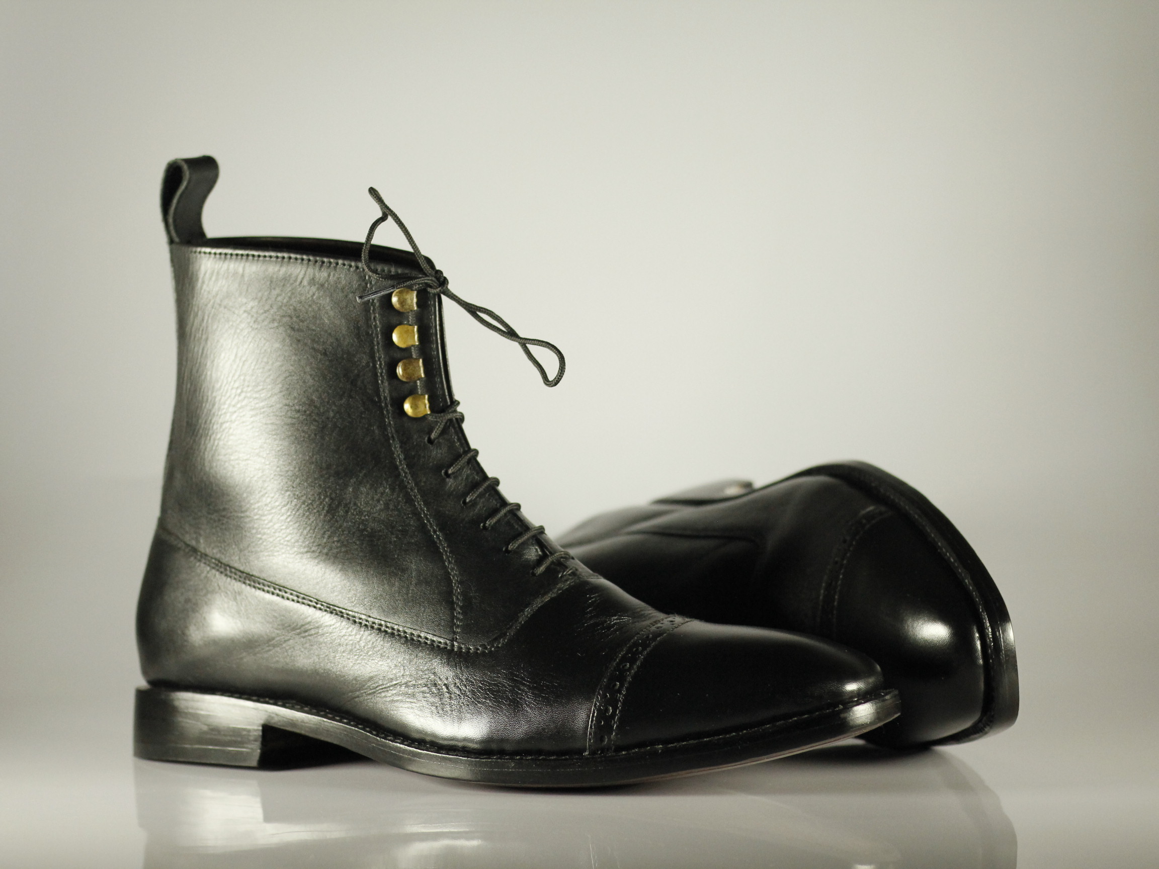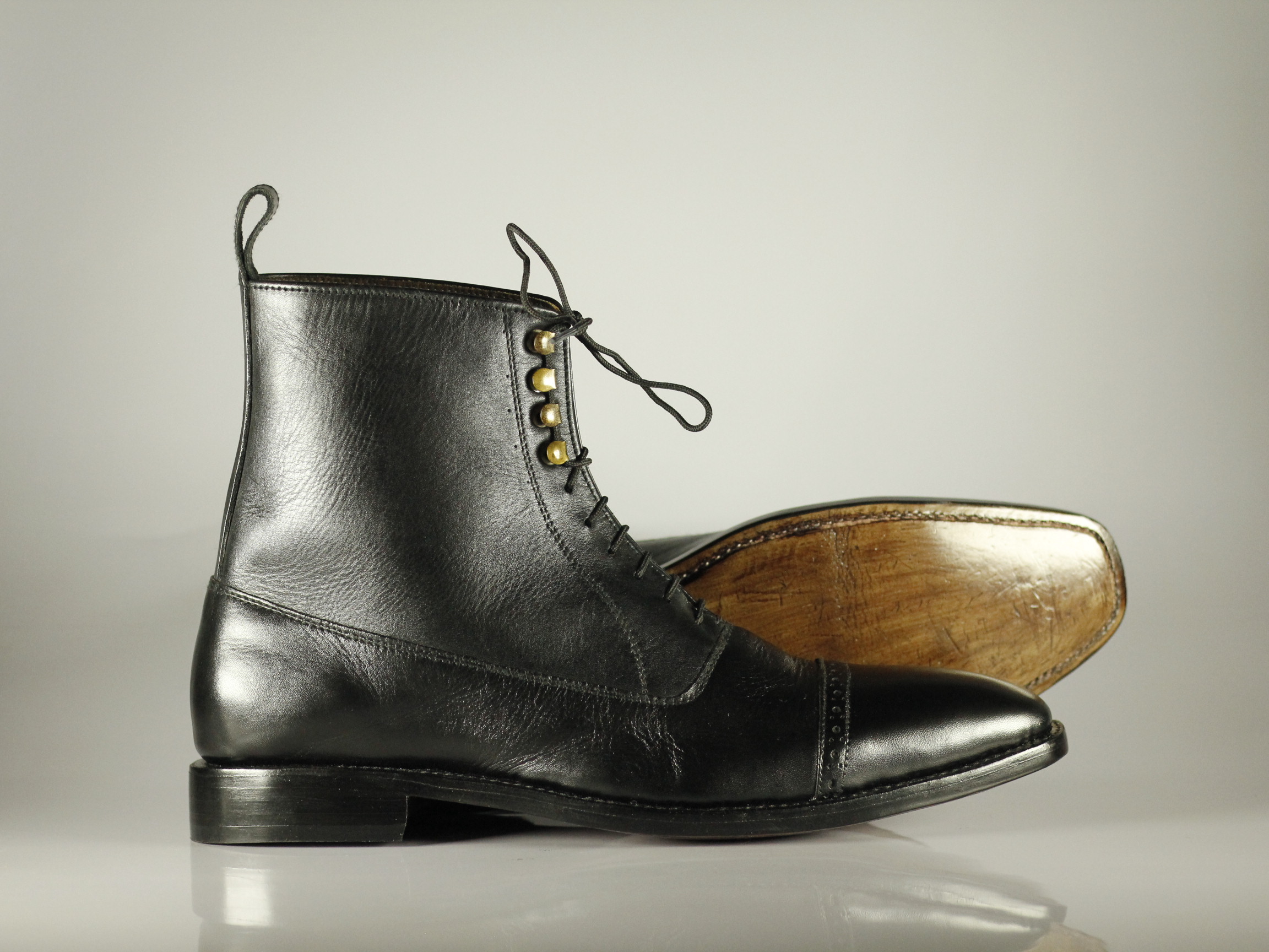 Handmade Men's Black Cap Toe Leather Ankle High Lace Up Boots