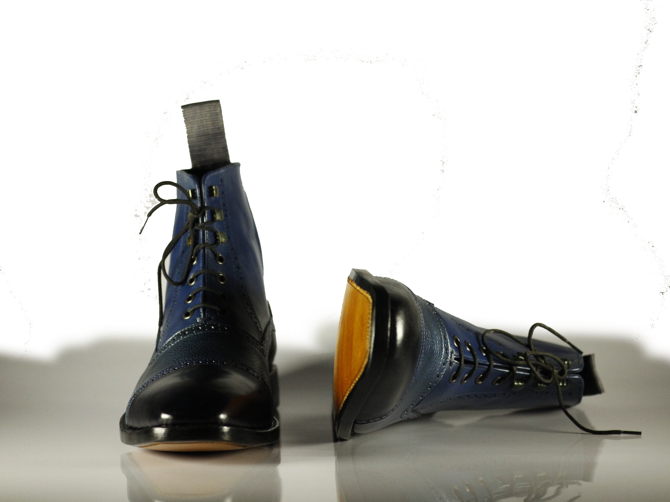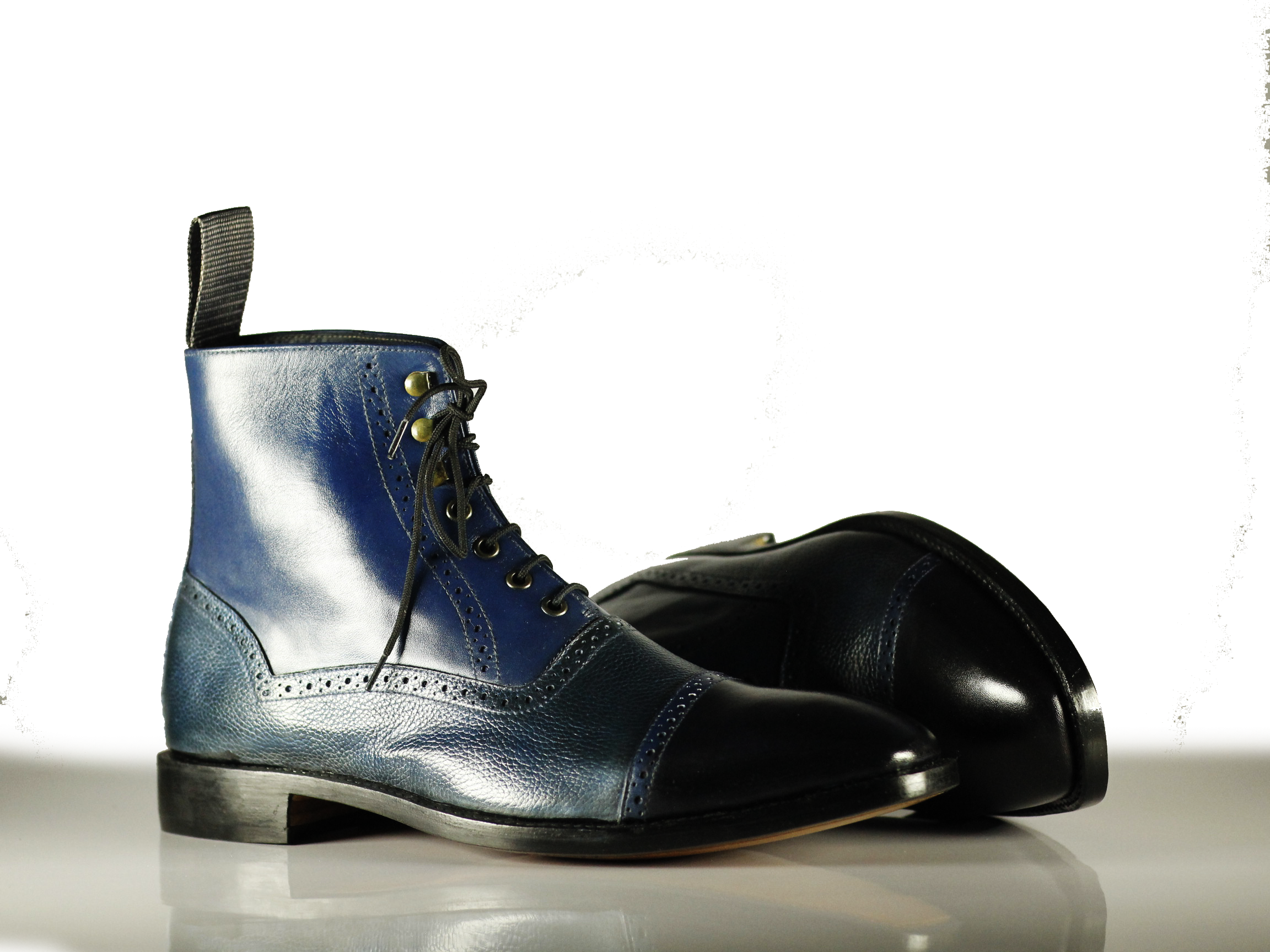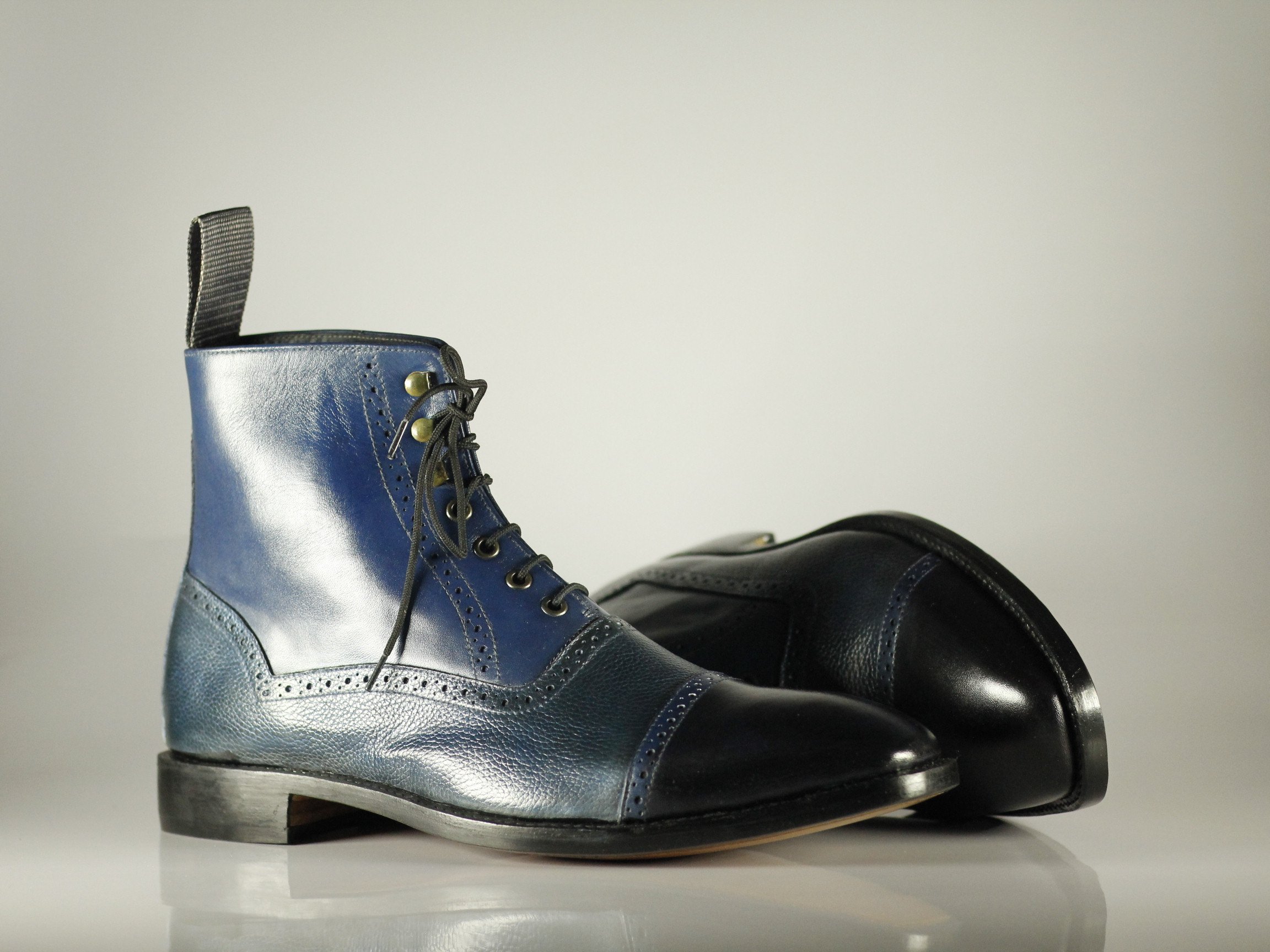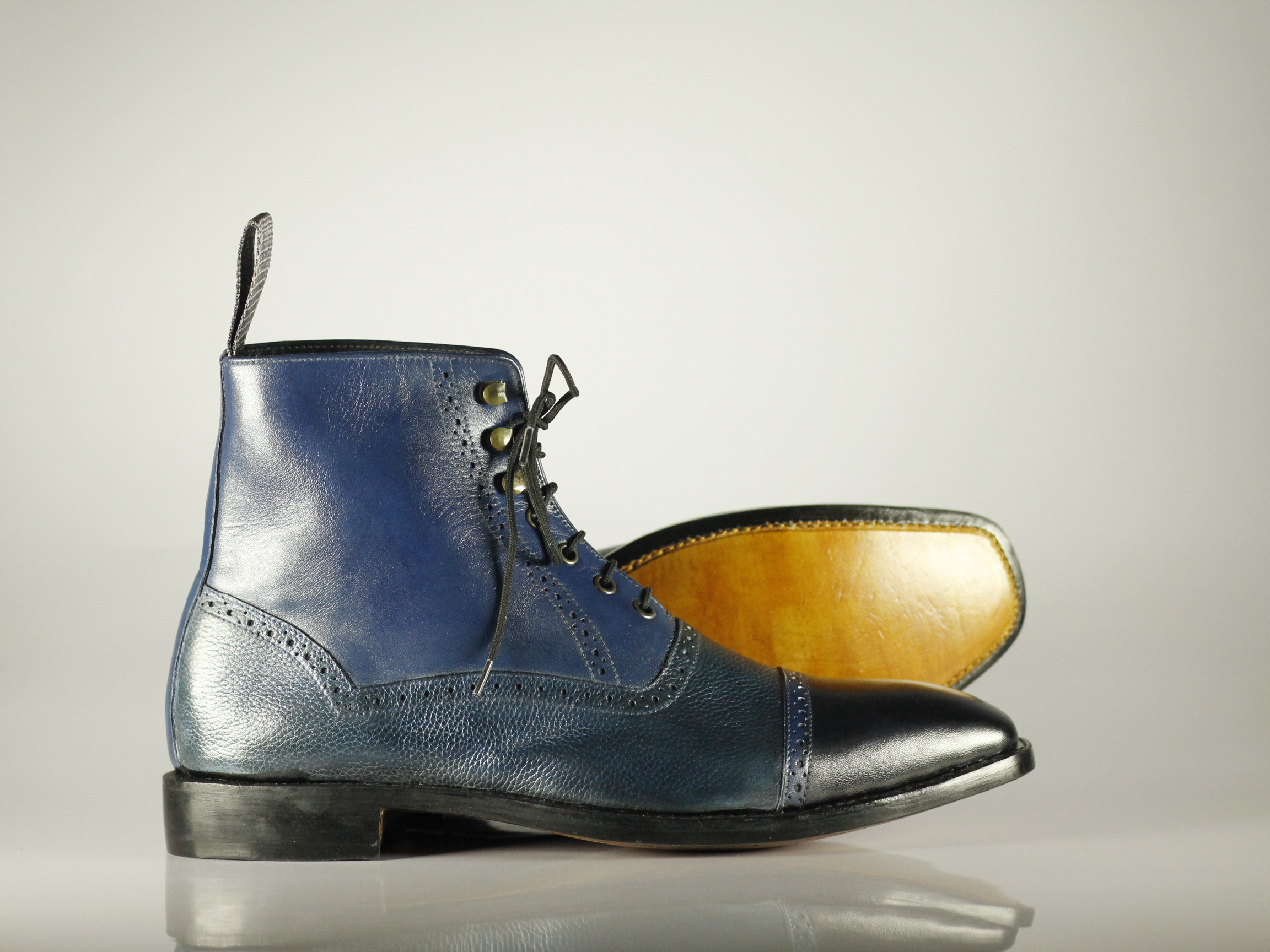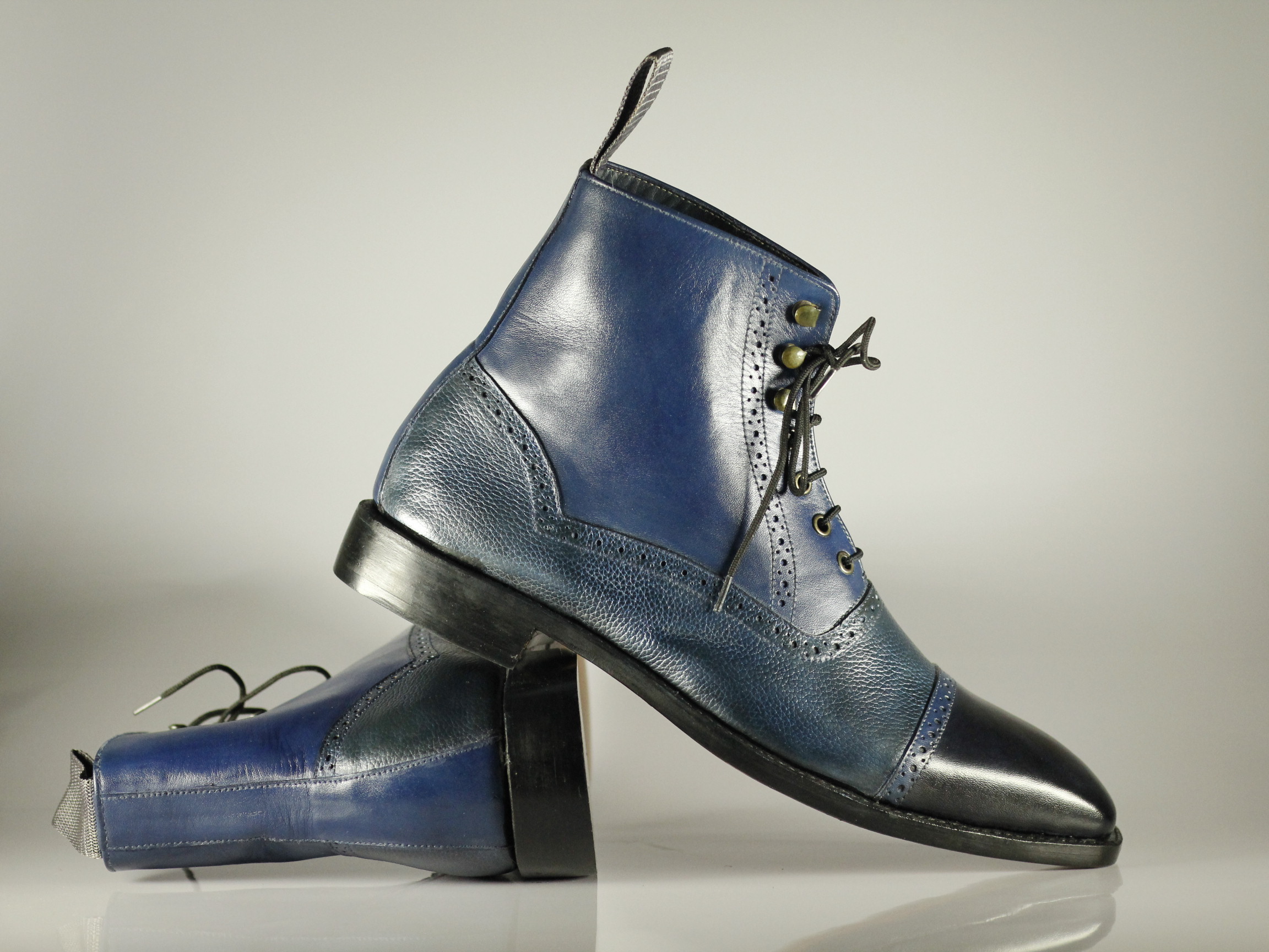New Handmade Men's Blue Cap Toe Pebbled Leather Ankle High Lace Up Boots