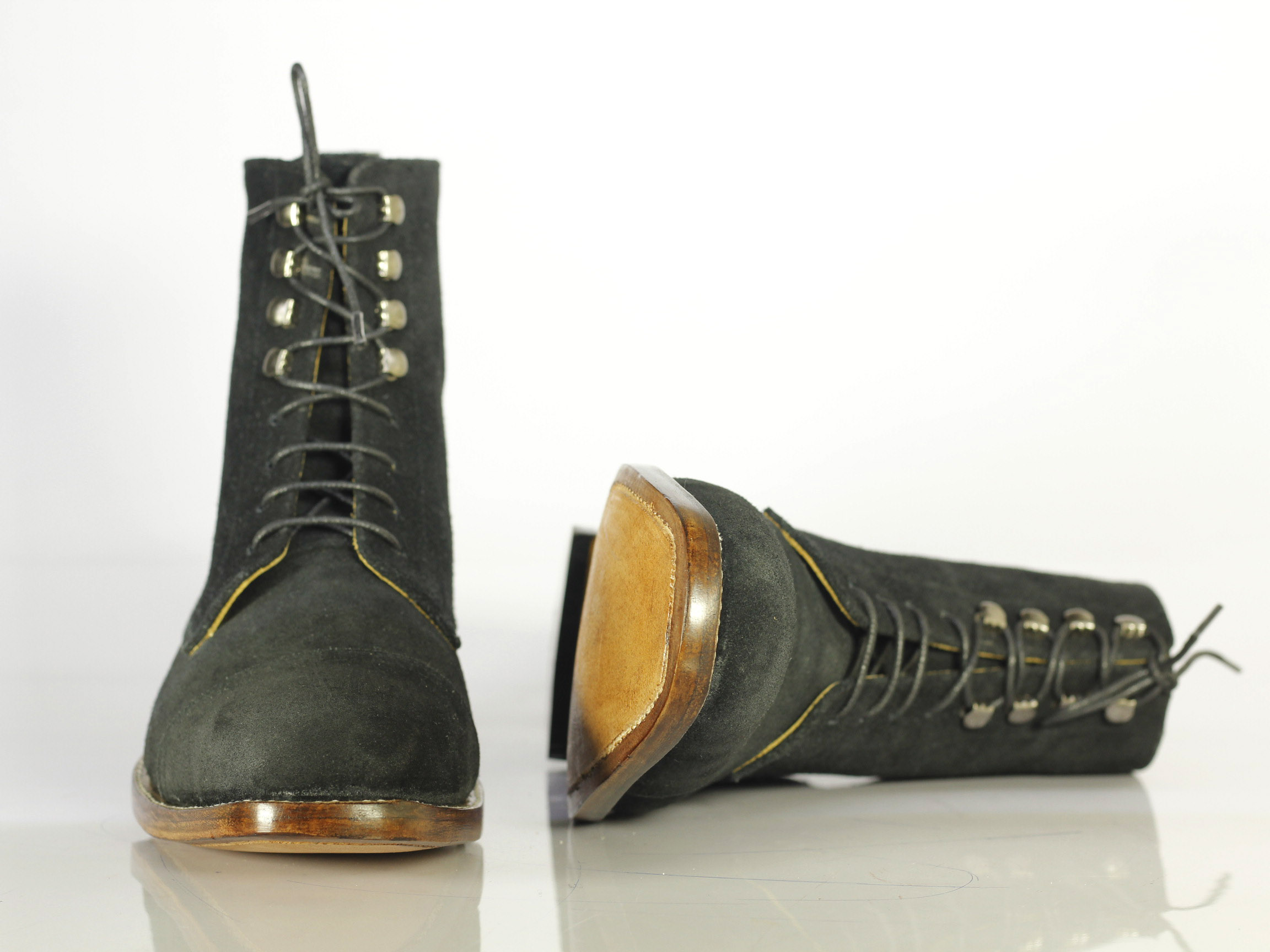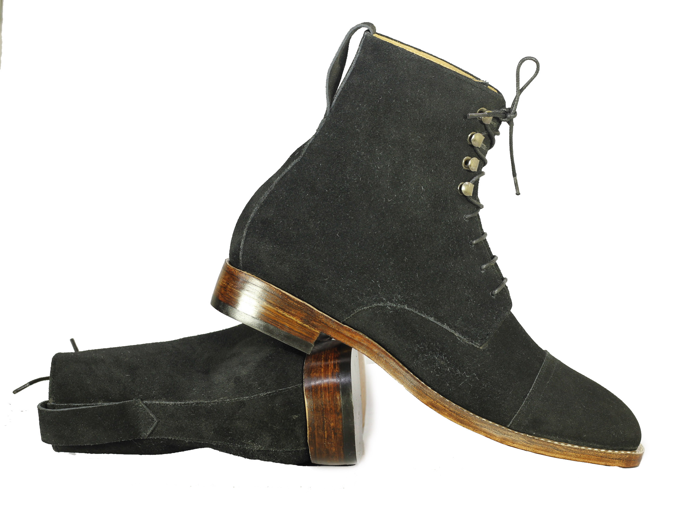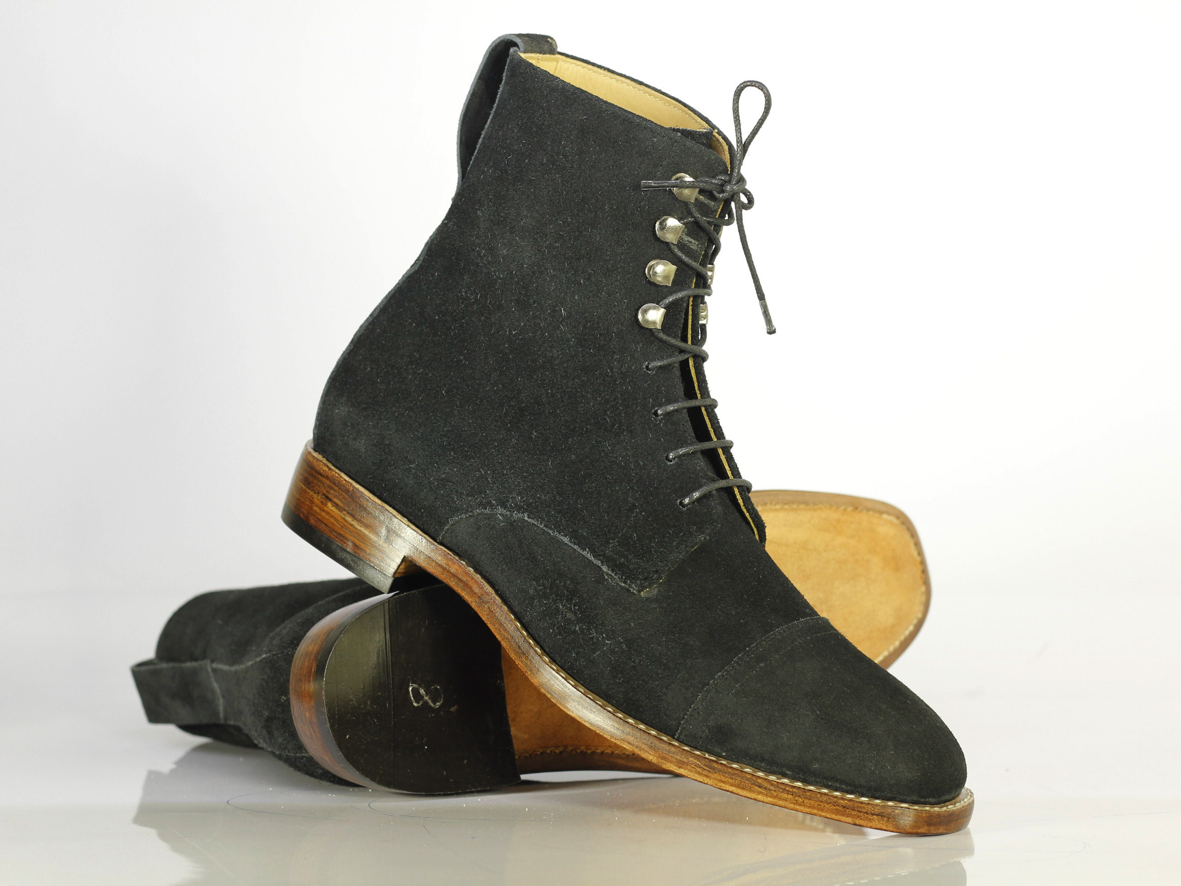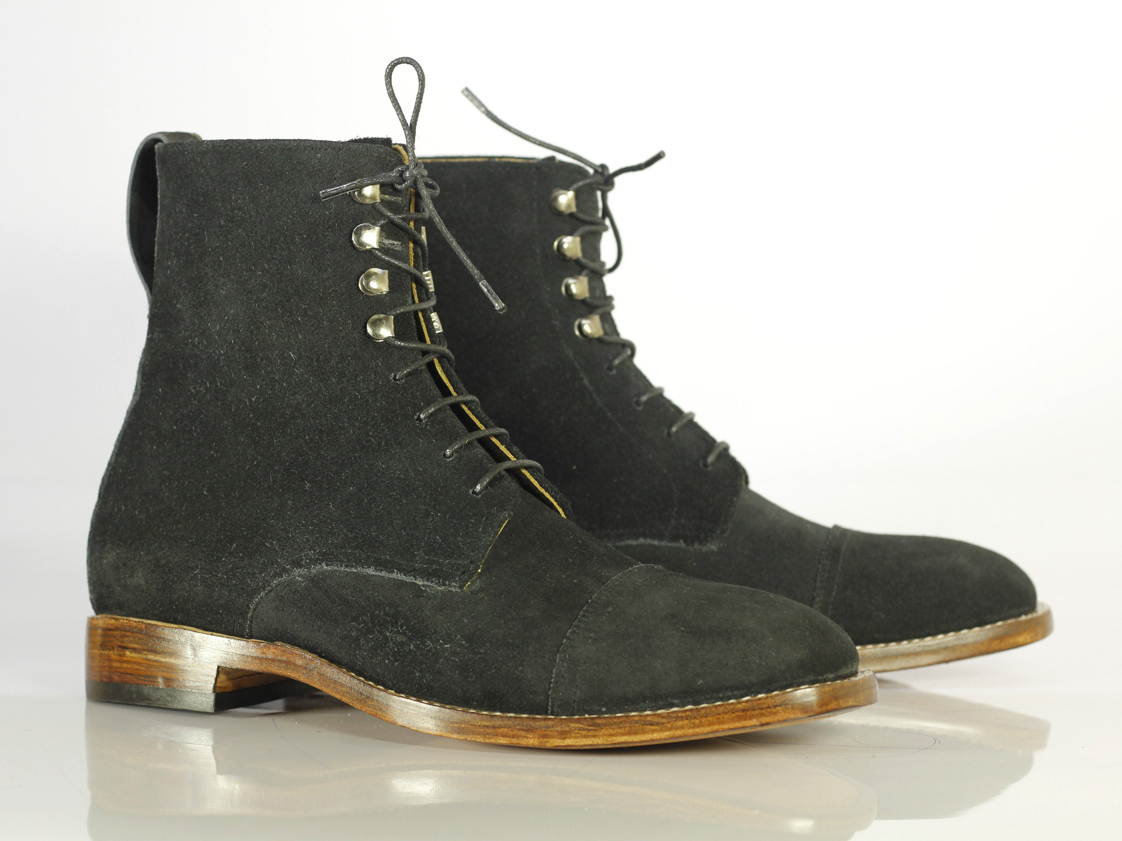 Handmade Men's Black Cap Toe Suede Ankle High Lace Up Boots