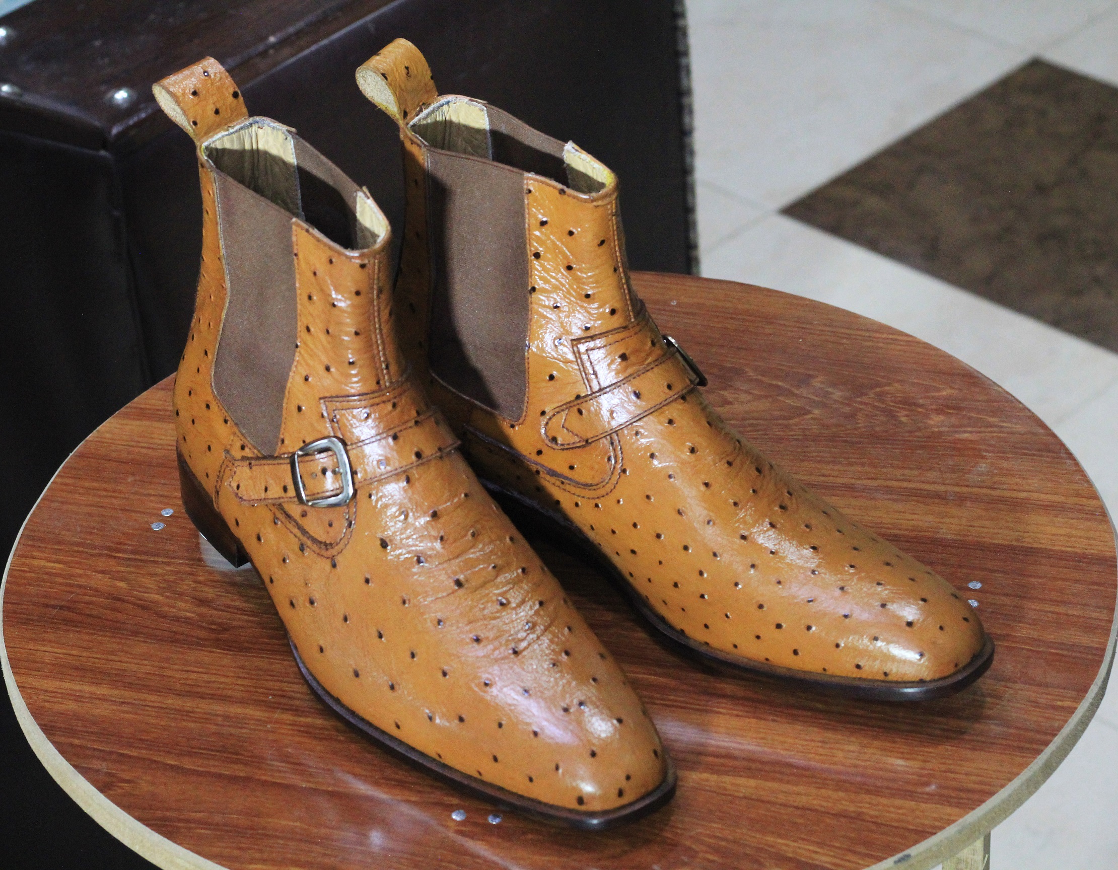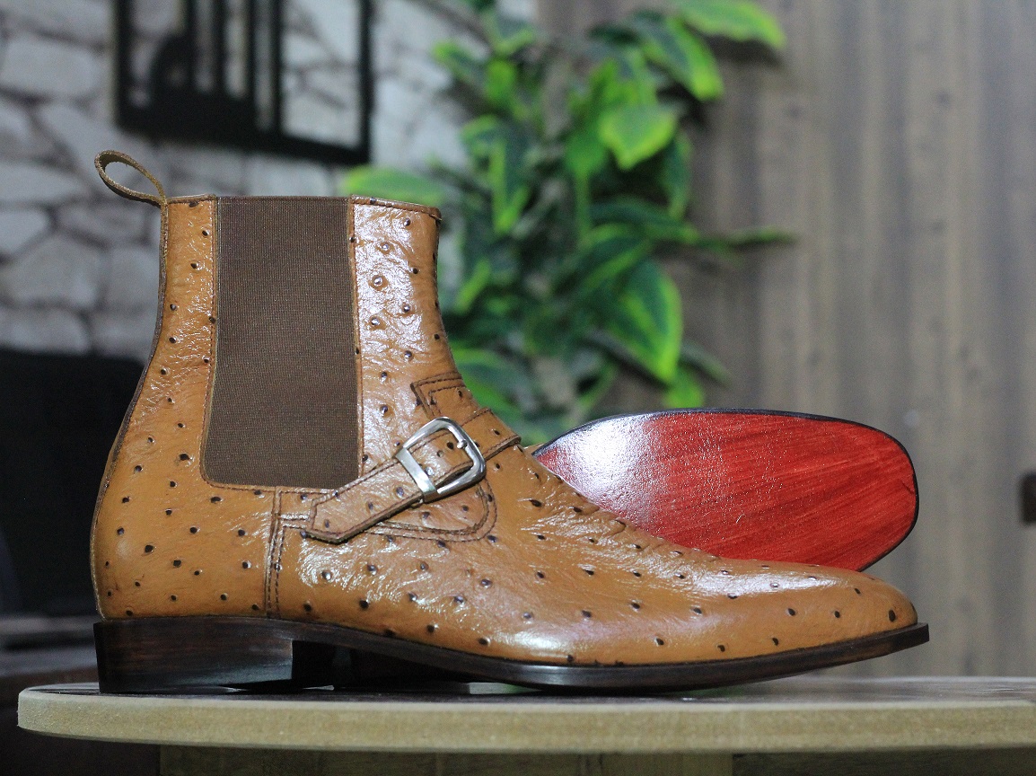 Brown Ankle High Chelsea Ostrich Leather Boot, Buckle Style Boot, New Stylish Boot