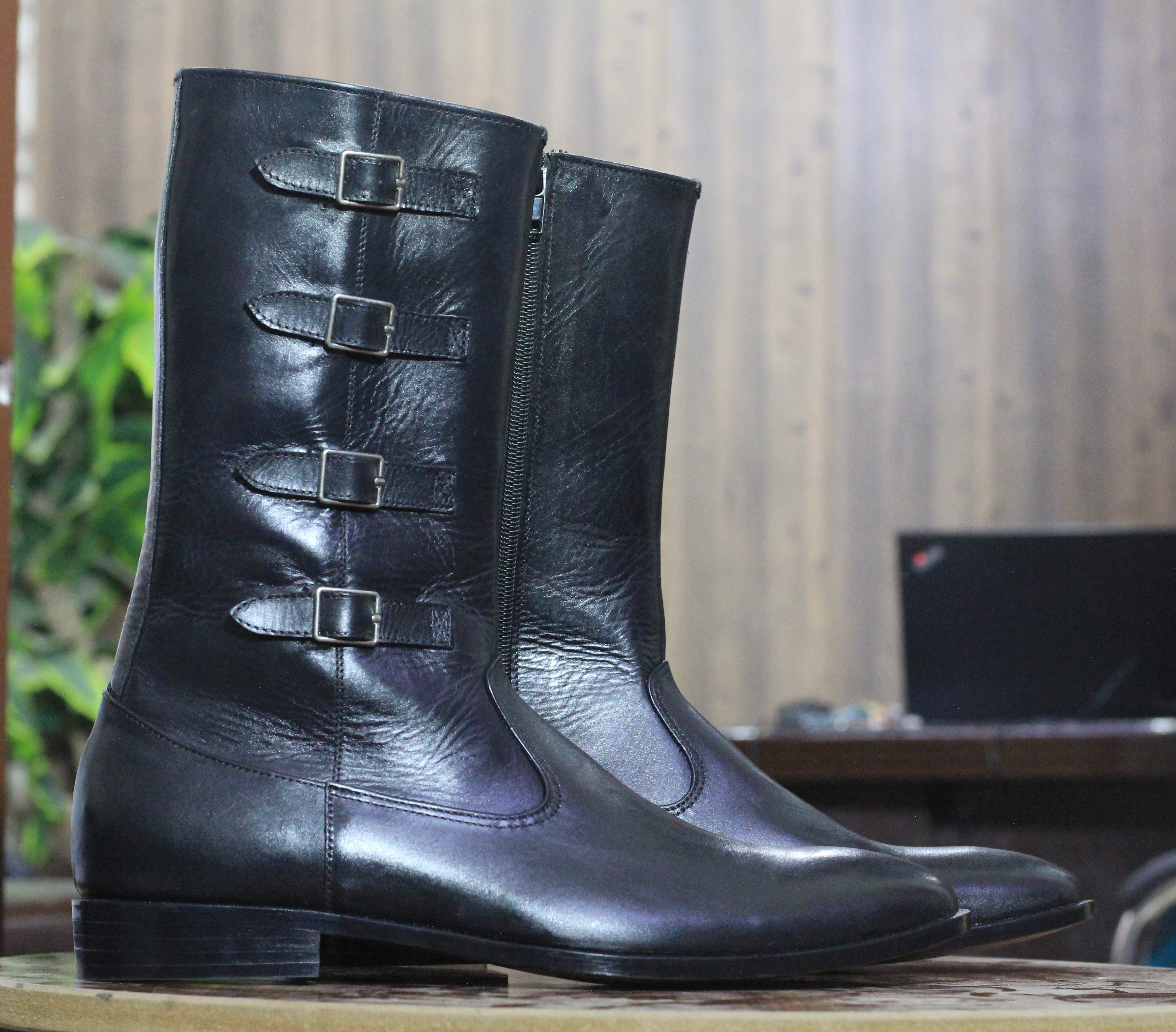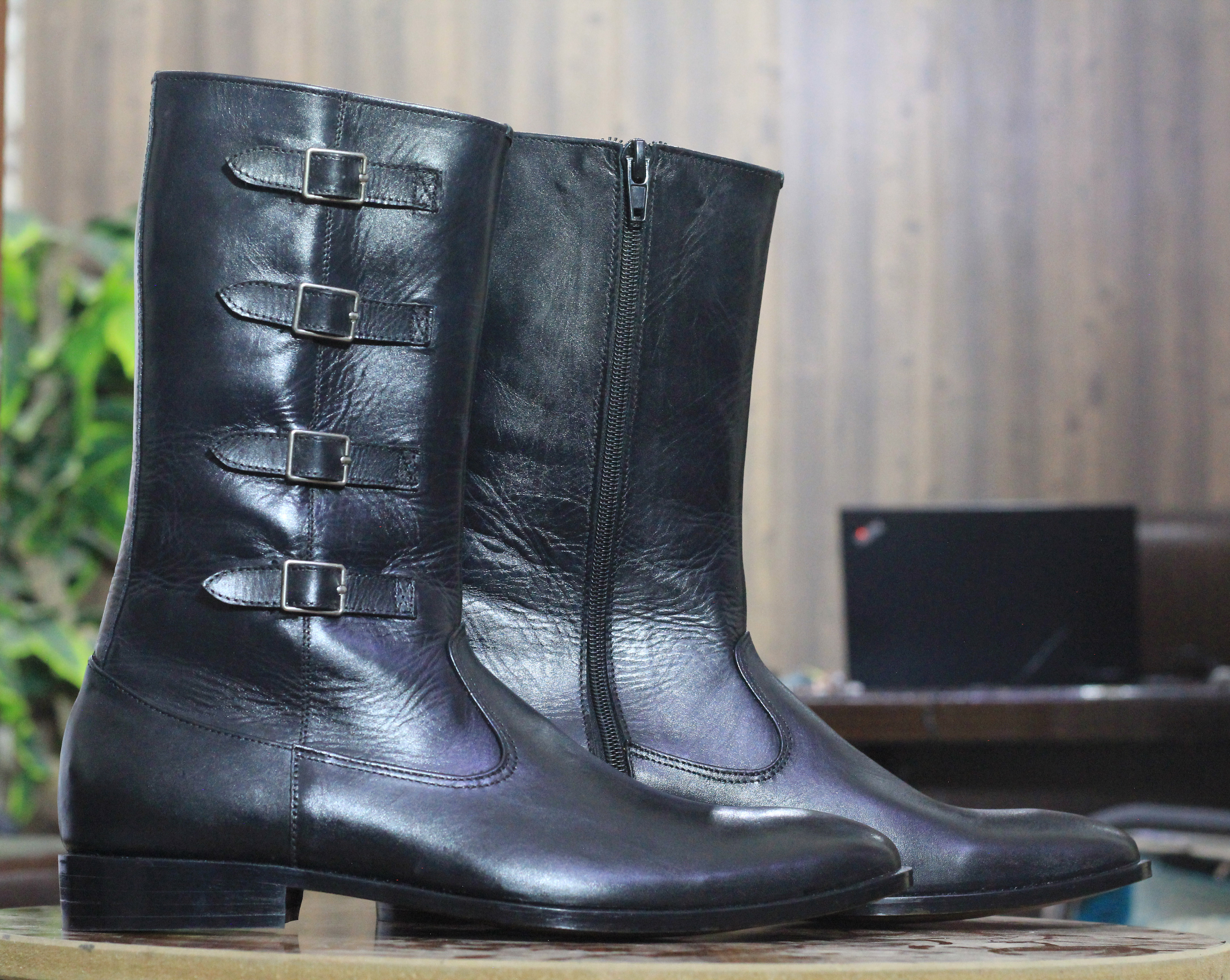 Men's New Classic Black Leather Ankle Boot With Forth Monk Side Zipper Boots