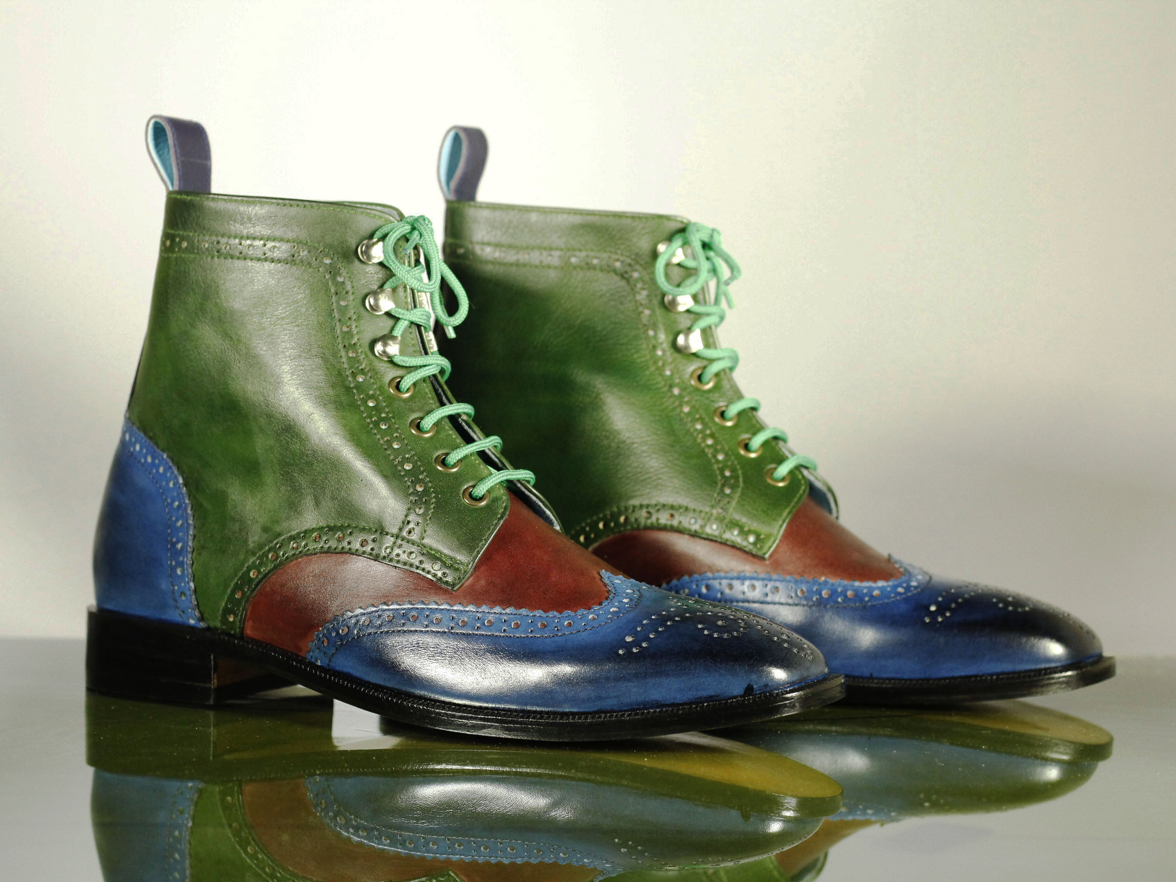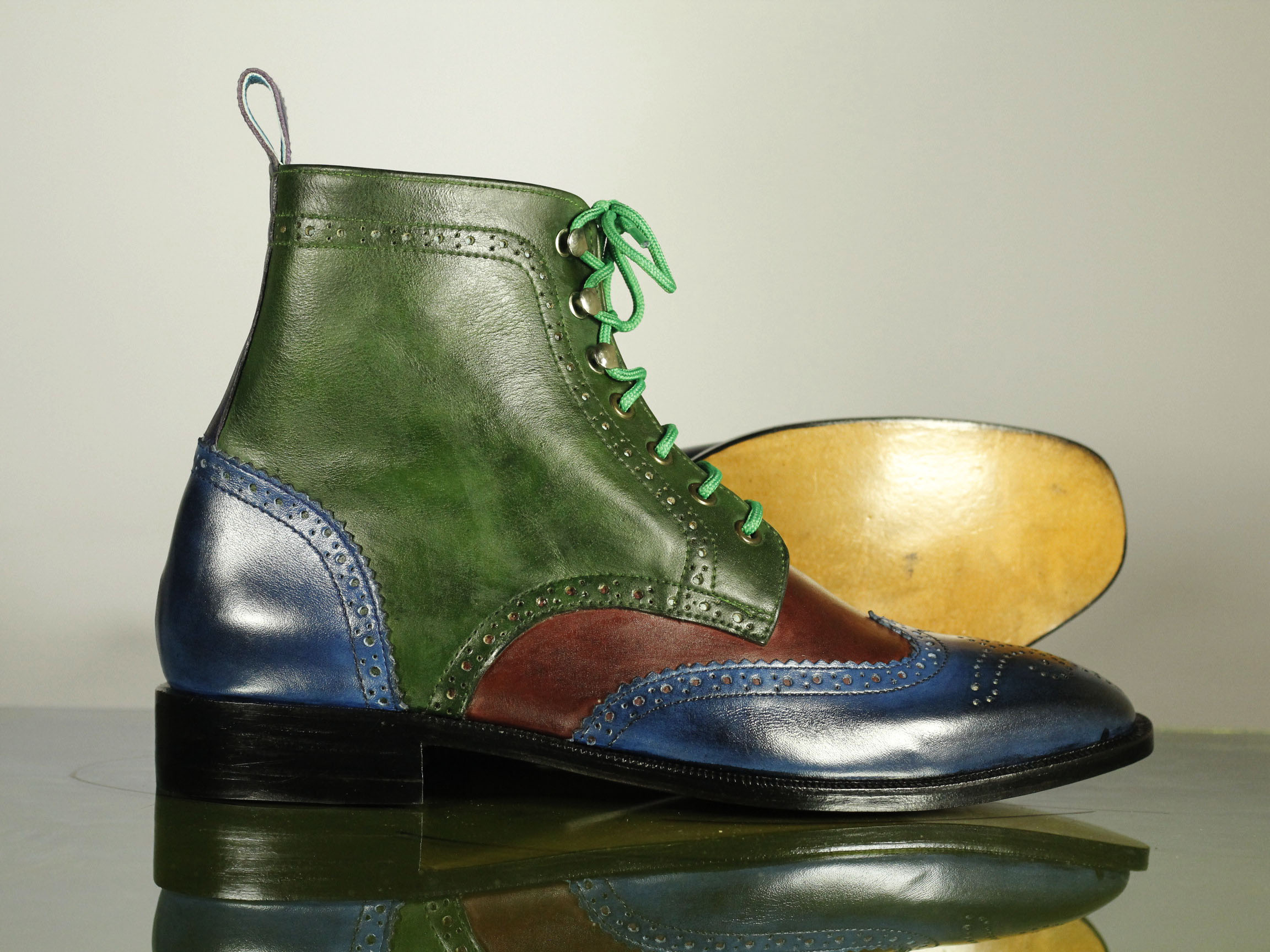 Ankle High 3 Tone Lace Up Boot, Wing Tip Boot, Pure Handmade Leather Boot