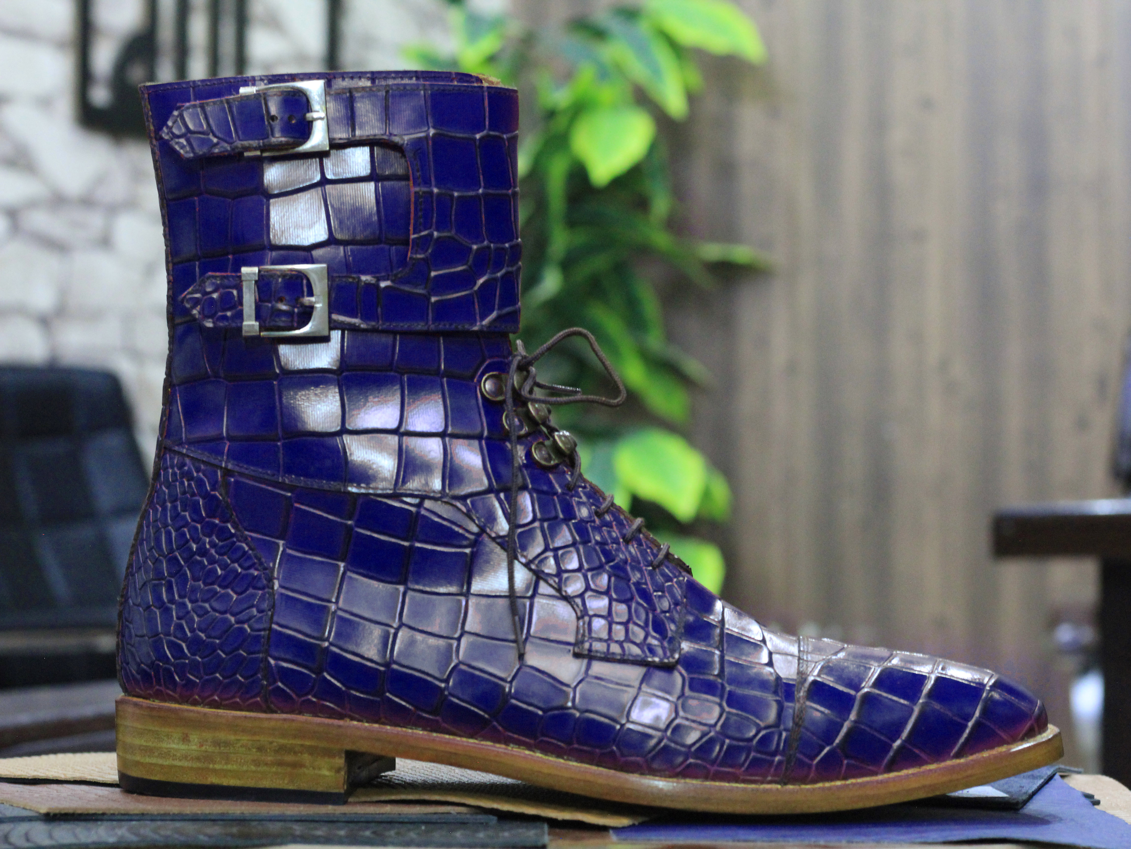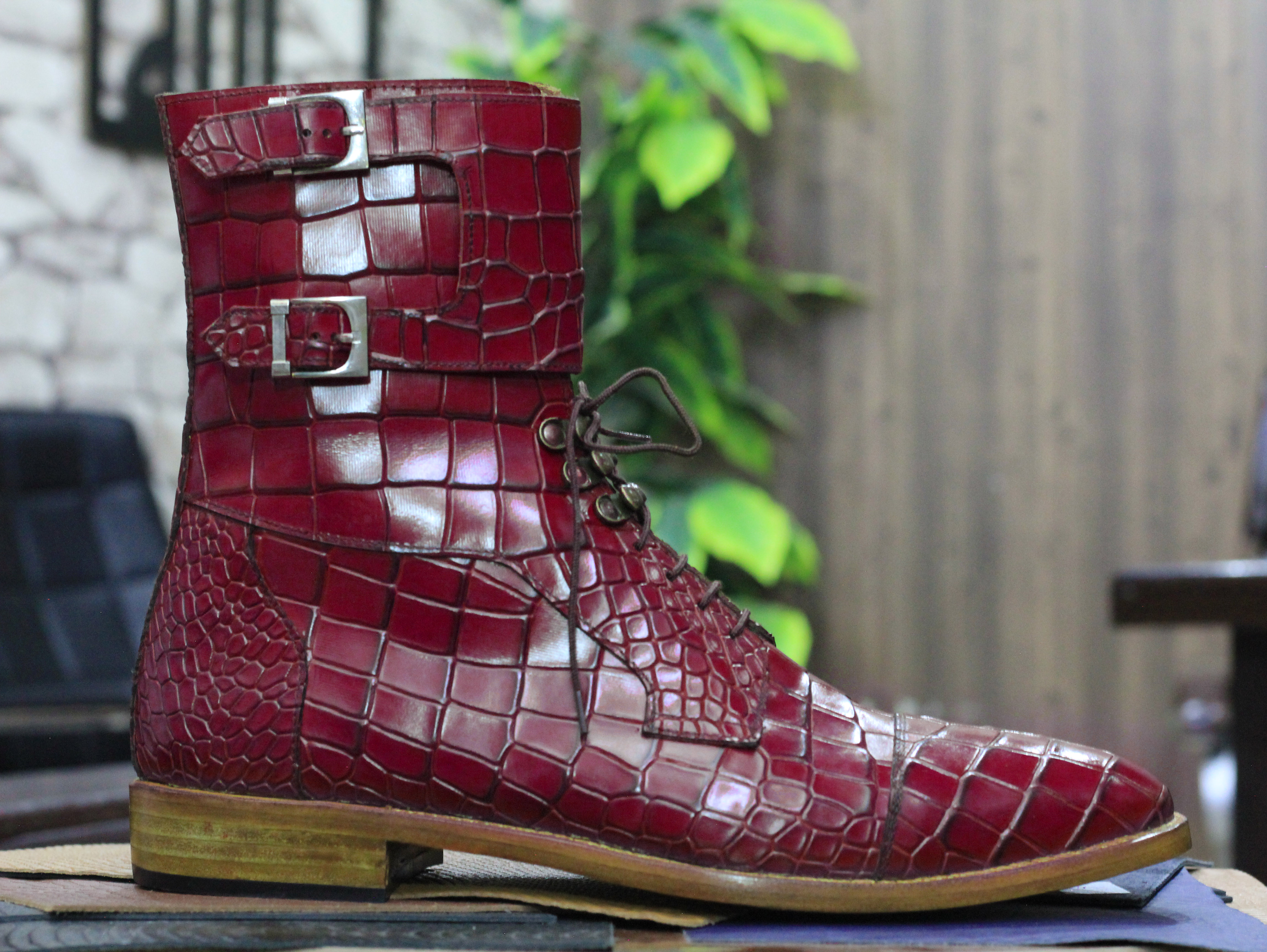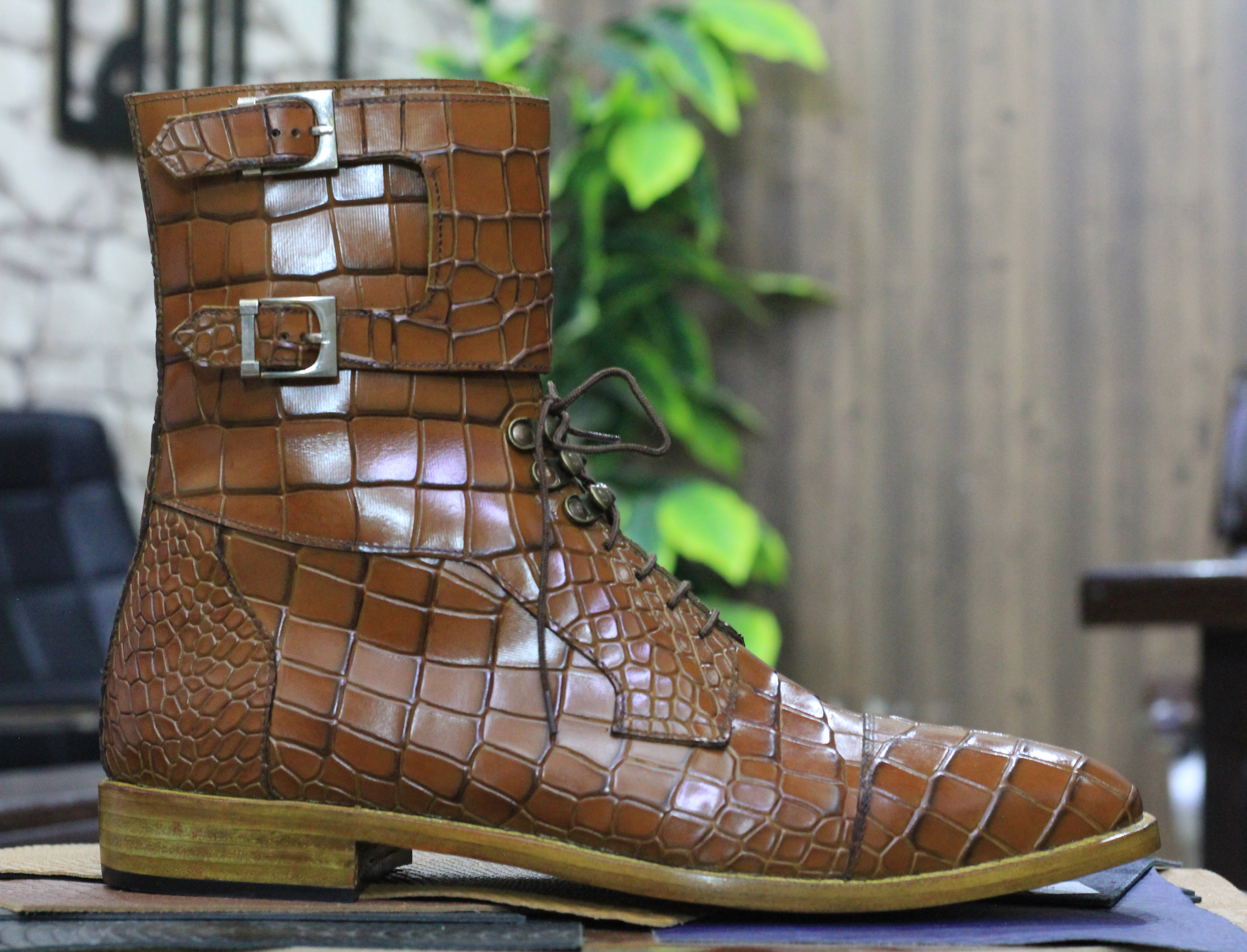 Men's Brown Alligator Texture, Double Buckle Ankle High Cap Toe Style Boot, Lace Up Boot For Men's