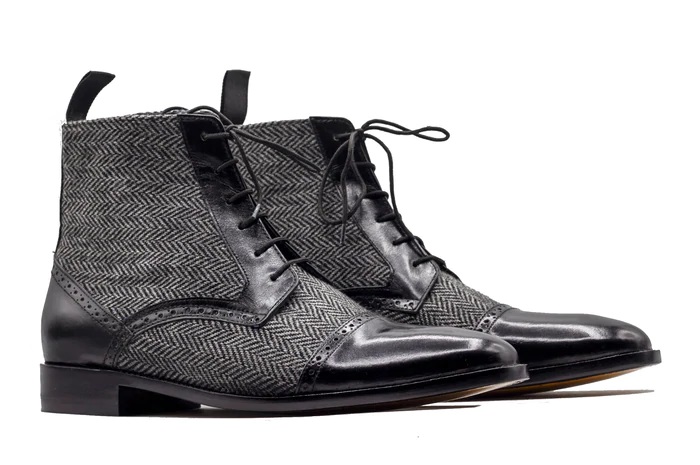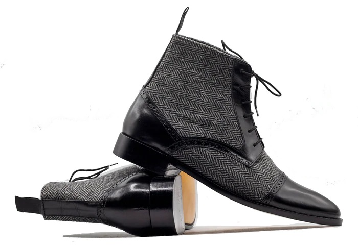 Men's Ankle High Tweed Texture Leather Boot Wing Tip Leather Brogue