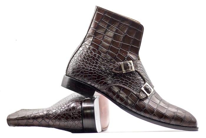 Ankle High Double Buckle Handmade Brown Alligator Texture Boots For Men's