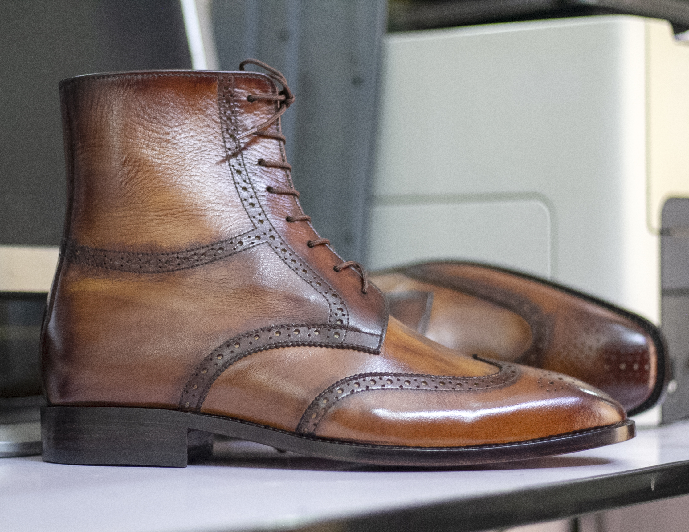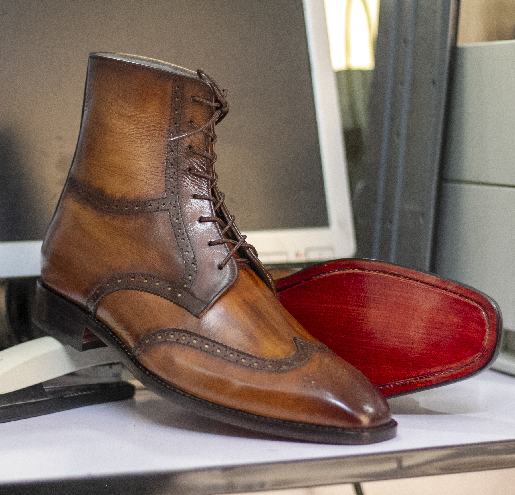 Handmade Ankle High Brown Derby Boot , Wing Tip Leather Lace Up Boot