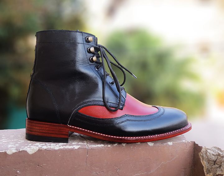 Handmade Black Burgundy Lace Up Wing Tip Boot, Men's Leather Boot