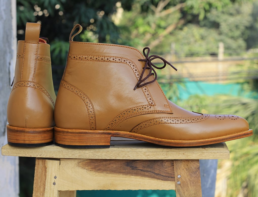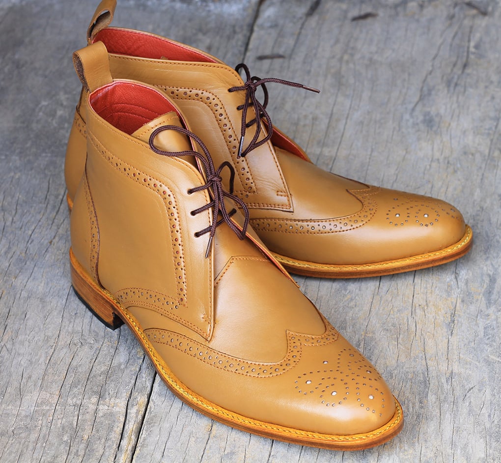 Ankle High Tan Colour Chukka Boots Men's Handmade Leather Wing Tip Brogue Lace Up Boot
