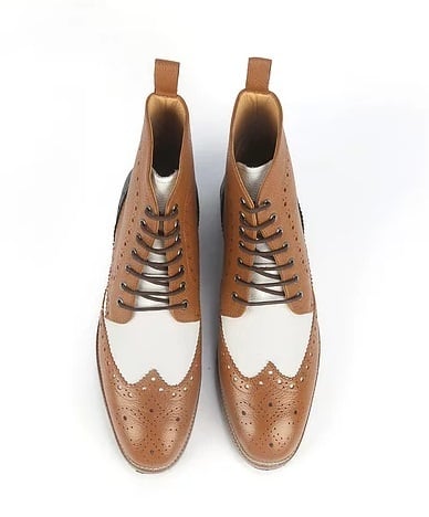 Men's Handmade Wing Tip Ankle Boots Men's Brown White Pebbled Leather Boot