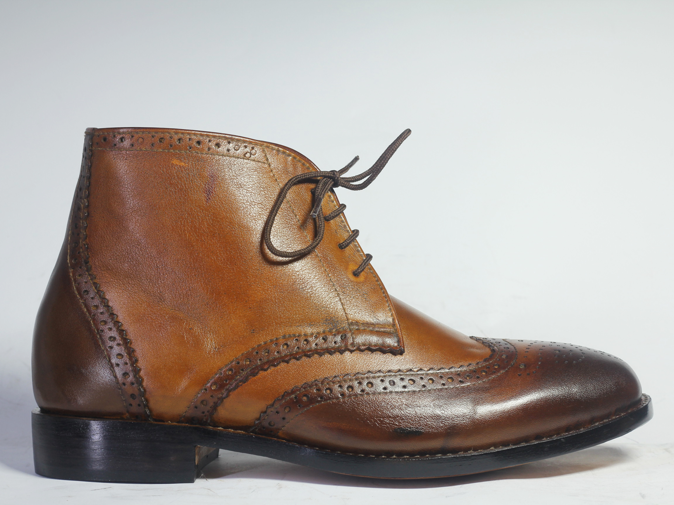 Handmade Brown Ankle High Wing Tip Brogue Leather Boot For Men's
