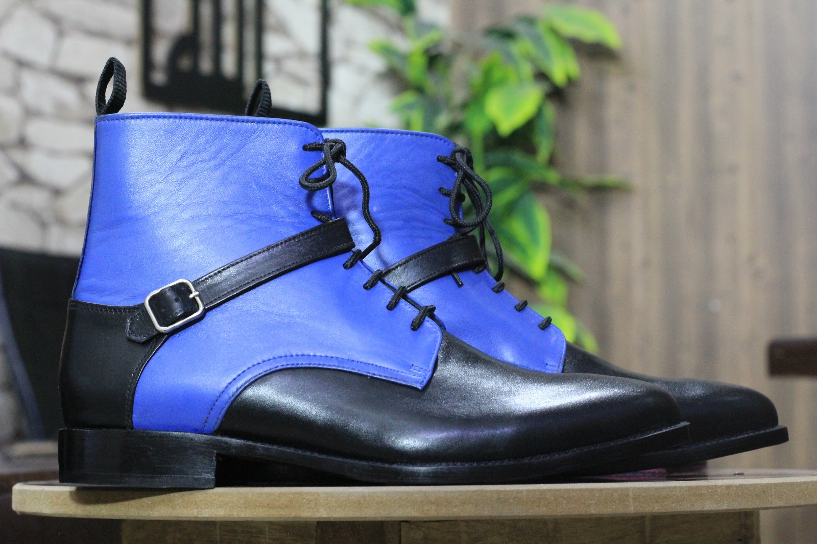 Handmade Black Blue Leather Buckle Lace Up Boots, Ankle High Boot, Street Wear Boots for Men's