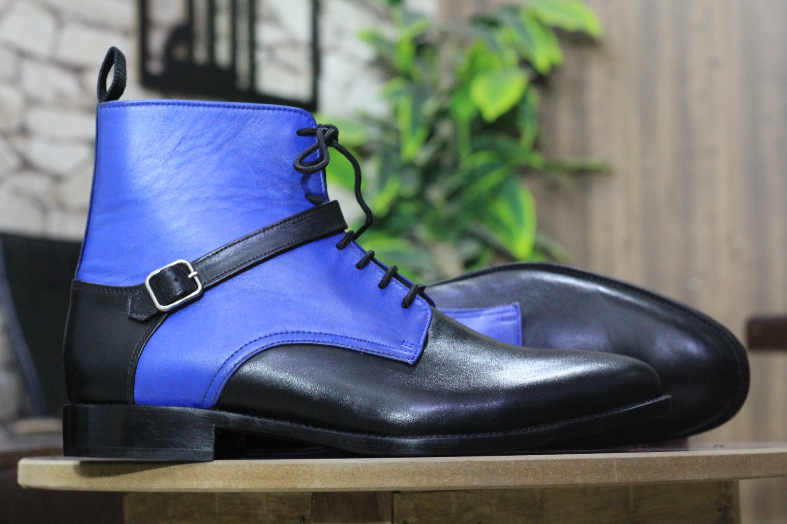 Bespoke Handmade Blue and Black Single Buckle Leather Boots,Men's Lace Up Ankle High Boots
