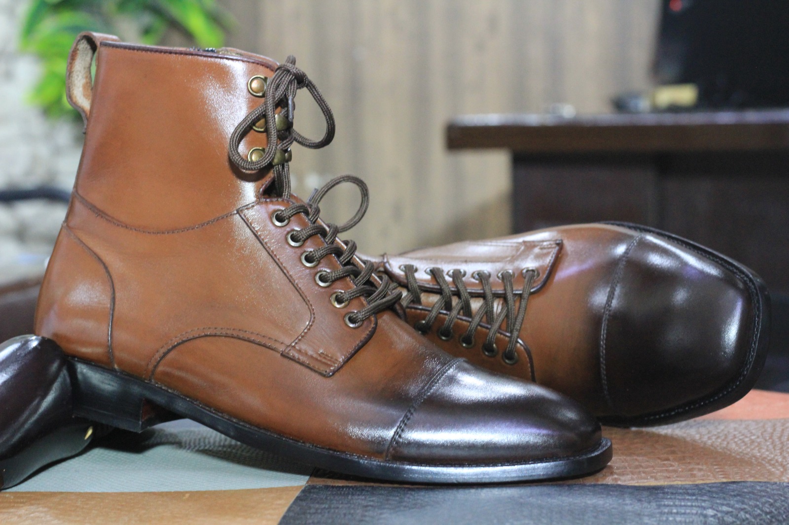 Bespoke Handmade Brown Color Lace Up Leather Boots,Men's Cap toe Party Wear Boots