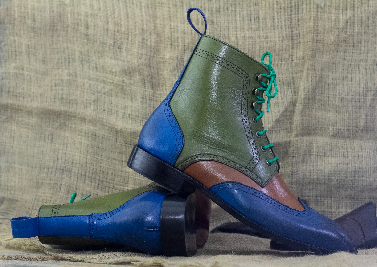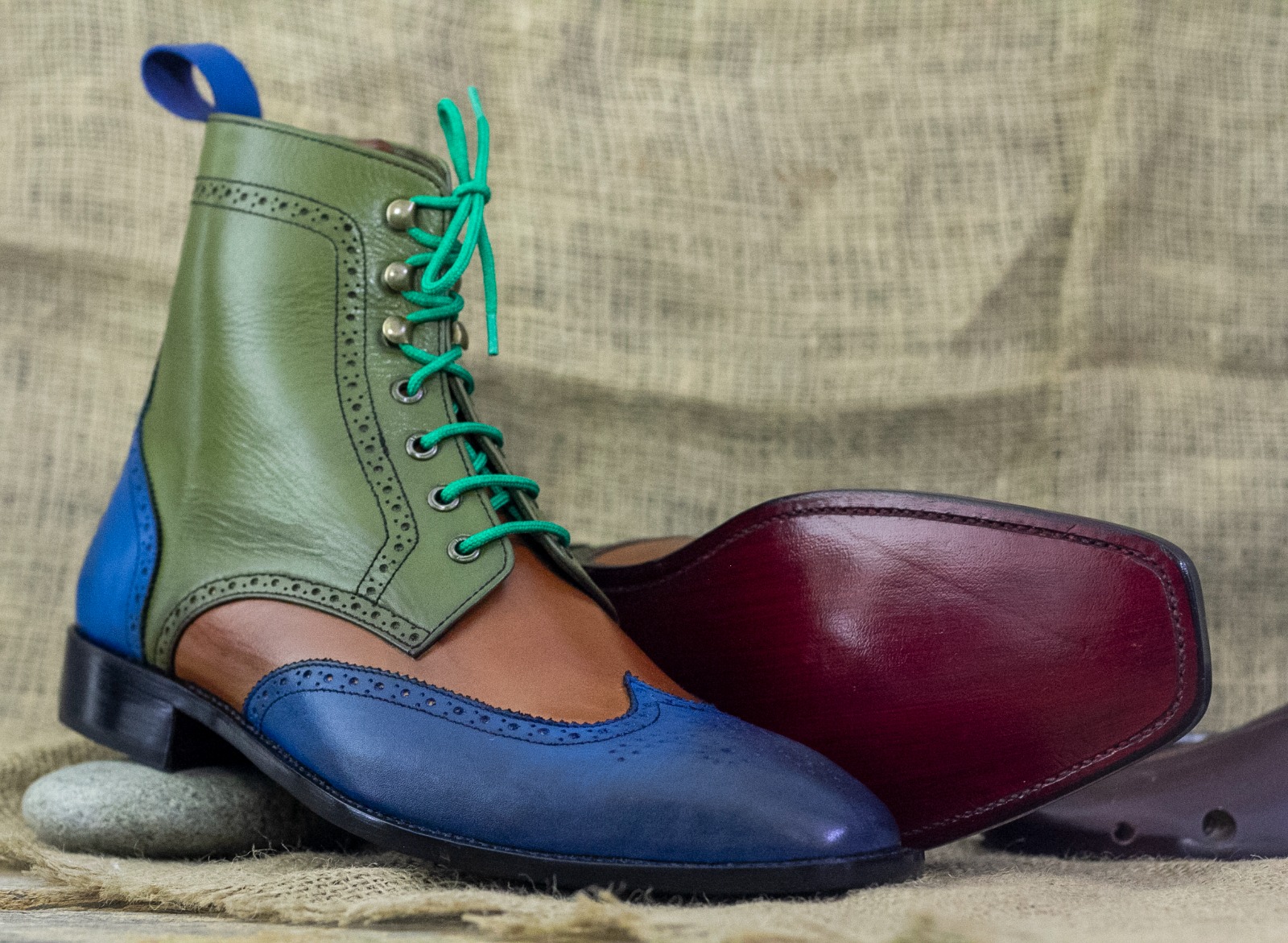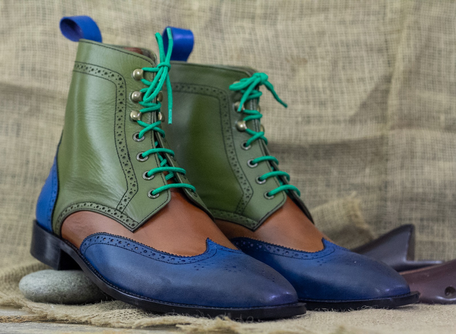 Handmade Wing Tip Tree Tone Colour Lace Up Genuine Leather Brogue Toe Boots for Men's